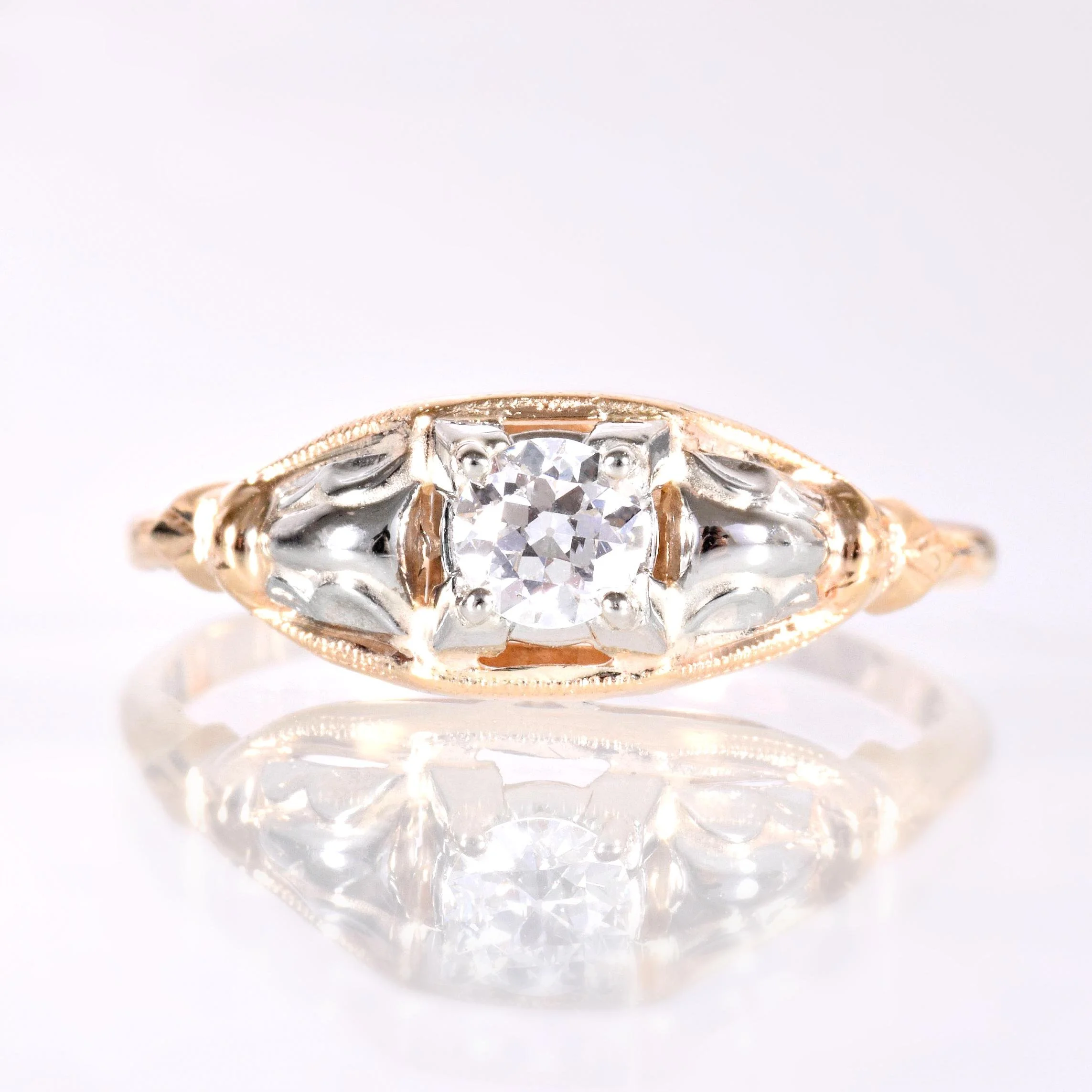 Antique Engagement Ring - Antique 1930's 14k Two-Tone Diamond Engagement Ring Circa 1930's 14k White & Yellow Gold European Cut Diamond =.27ct VVS2/E Ring Size 7 (sizable) Ring measures approximately 6.7mm wide at center, back of band is 1.3mm wide.