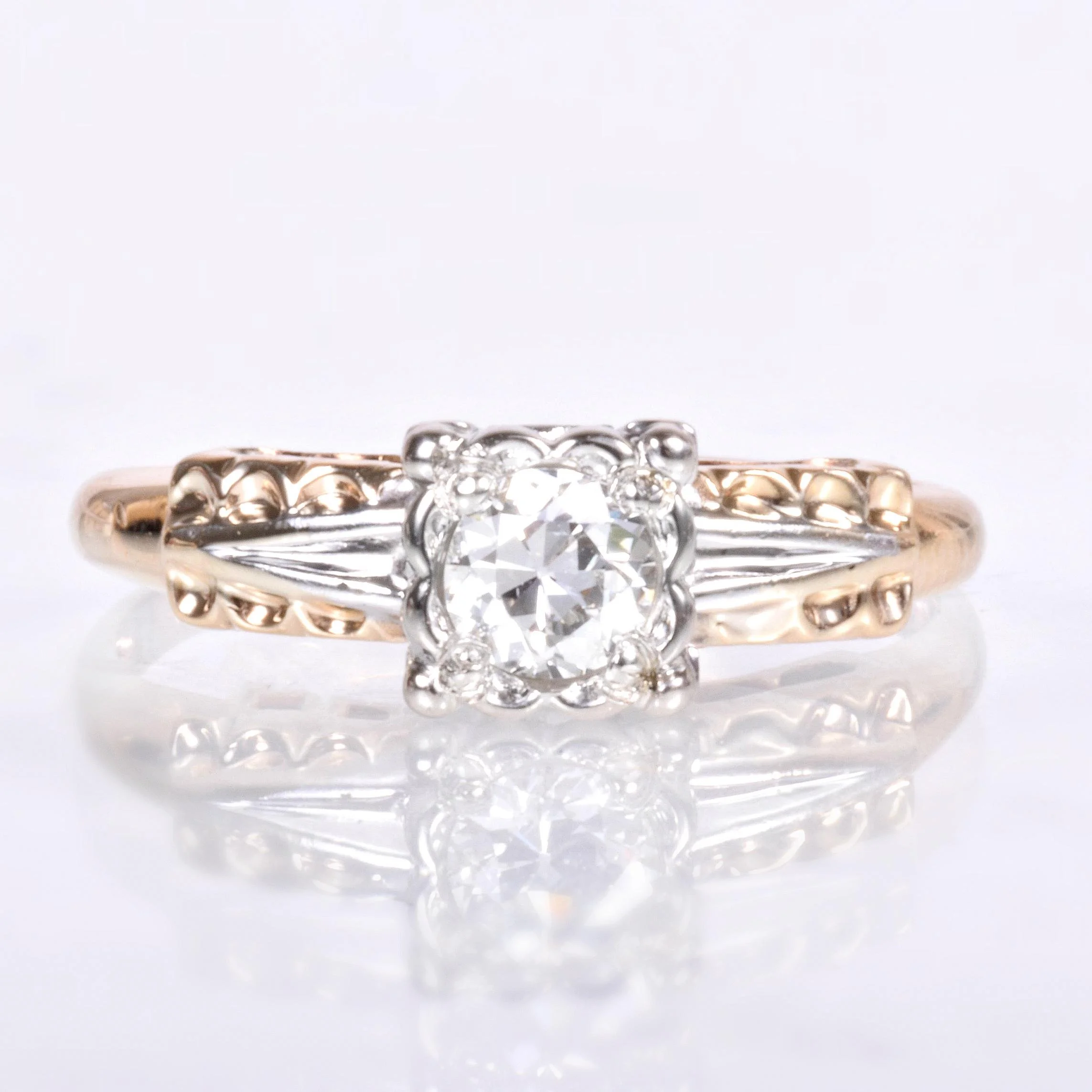Antique Engagement Ring - Antique 1930's 14k Two-Tone Diamond Ring 1930's 14k Yellow & White Gold New Old Stock European Cut Diamond =.25ct VS1/G Ring Size 5 (sizable) Ring measures approximately 5.5mm wide at center, back of band is 1.3mm wide.