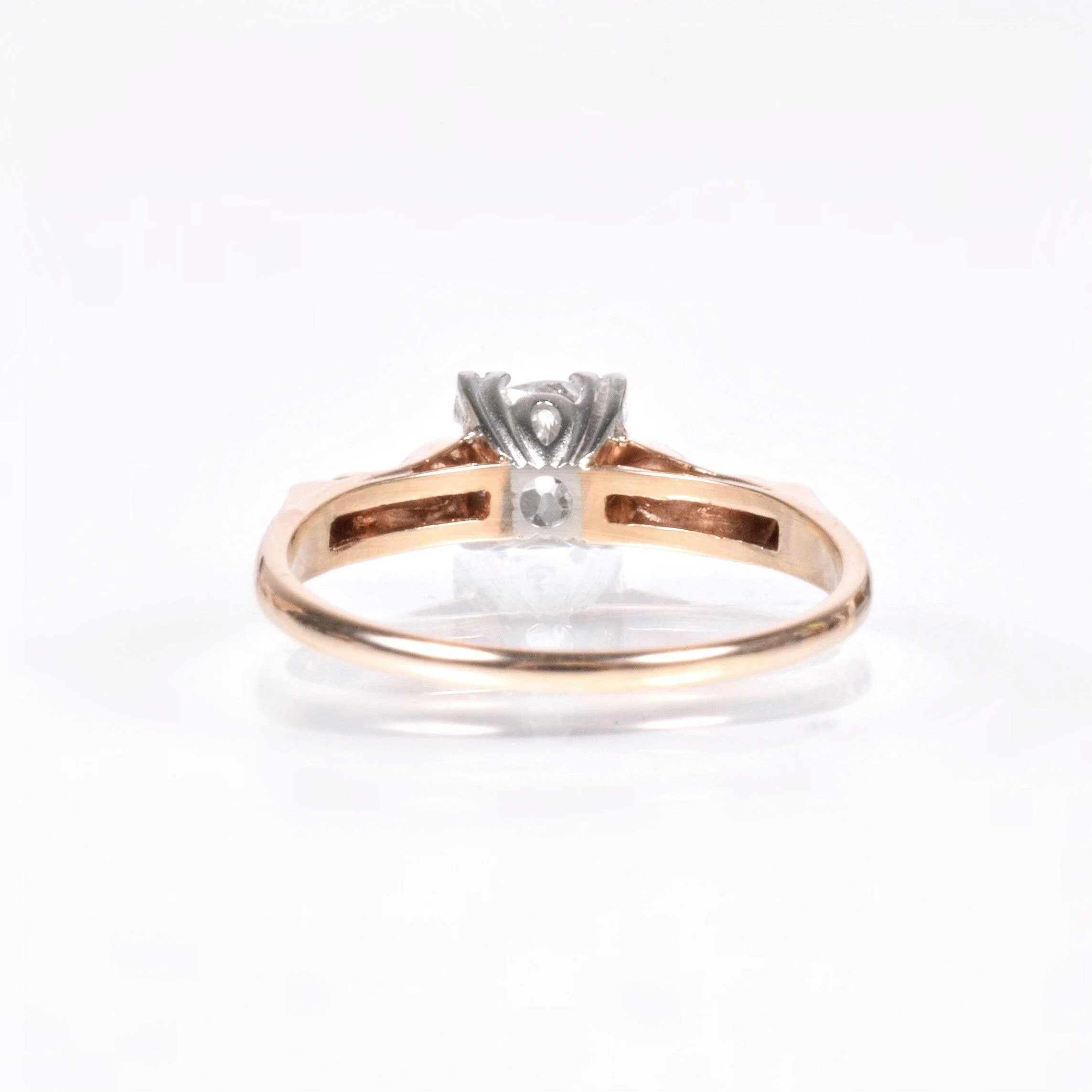 This is a beauty of a mine cut diamond set in a gorgeous high polished white and rosy 14k yellow gold antique setting. This ring dates back to the 1930's and is very catching to the eye. At the center we have a brilliantly sparkling mine cut diamond set in this beautiful solitaire setting. This ring would pair wonderfully with any antique or modern band or even an eternity style diamond band for some added sparkle.