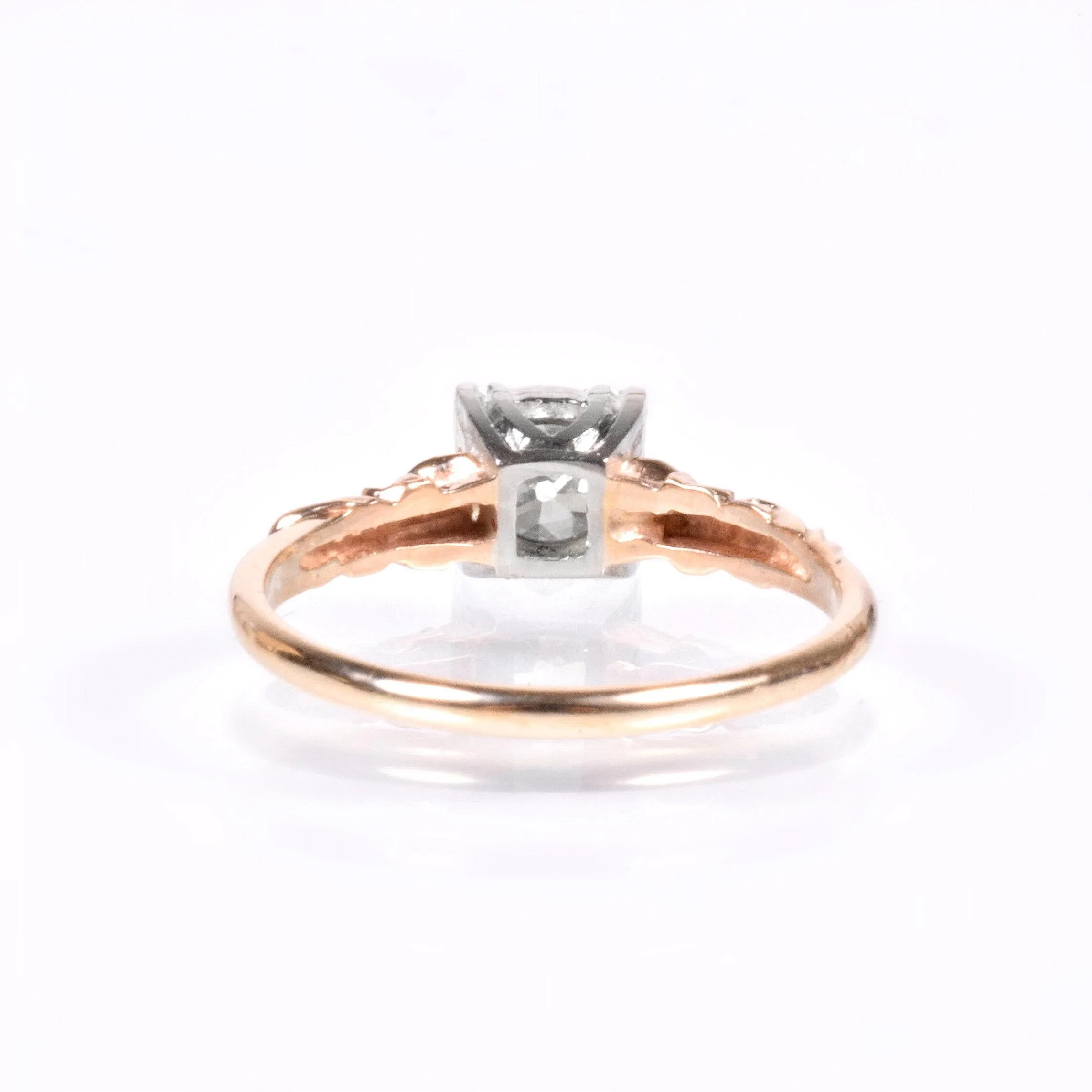 This is a beautiful NEW OLD STOCK antique engagement ring direct to you from the 1930's. This is a rarity to find a jewelry piece from this era in an unworn state, which makes this piece all the more special. This lovely two-tone ring has a sparkling Mine cut diamond in the center set as a solitaire, in a bright 14k yellow and white gold setting. Be the first ever owner of this charming little piece of antique jewelry history!