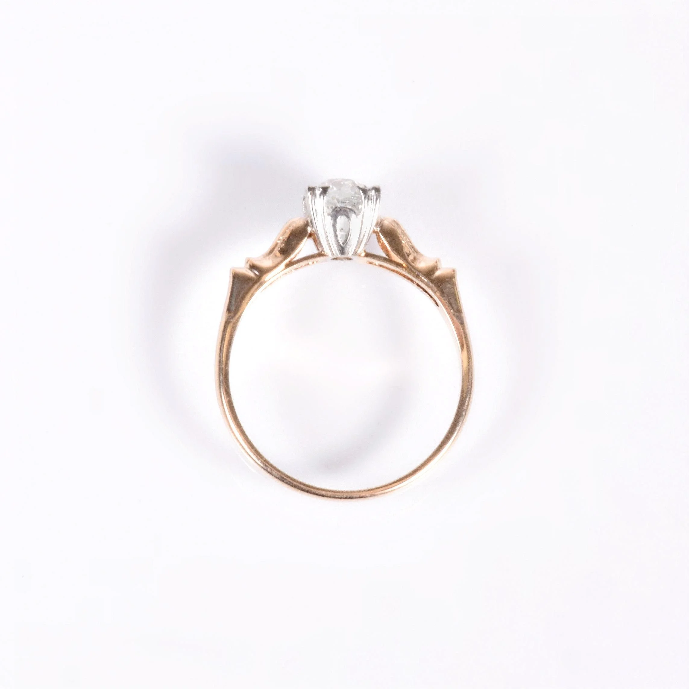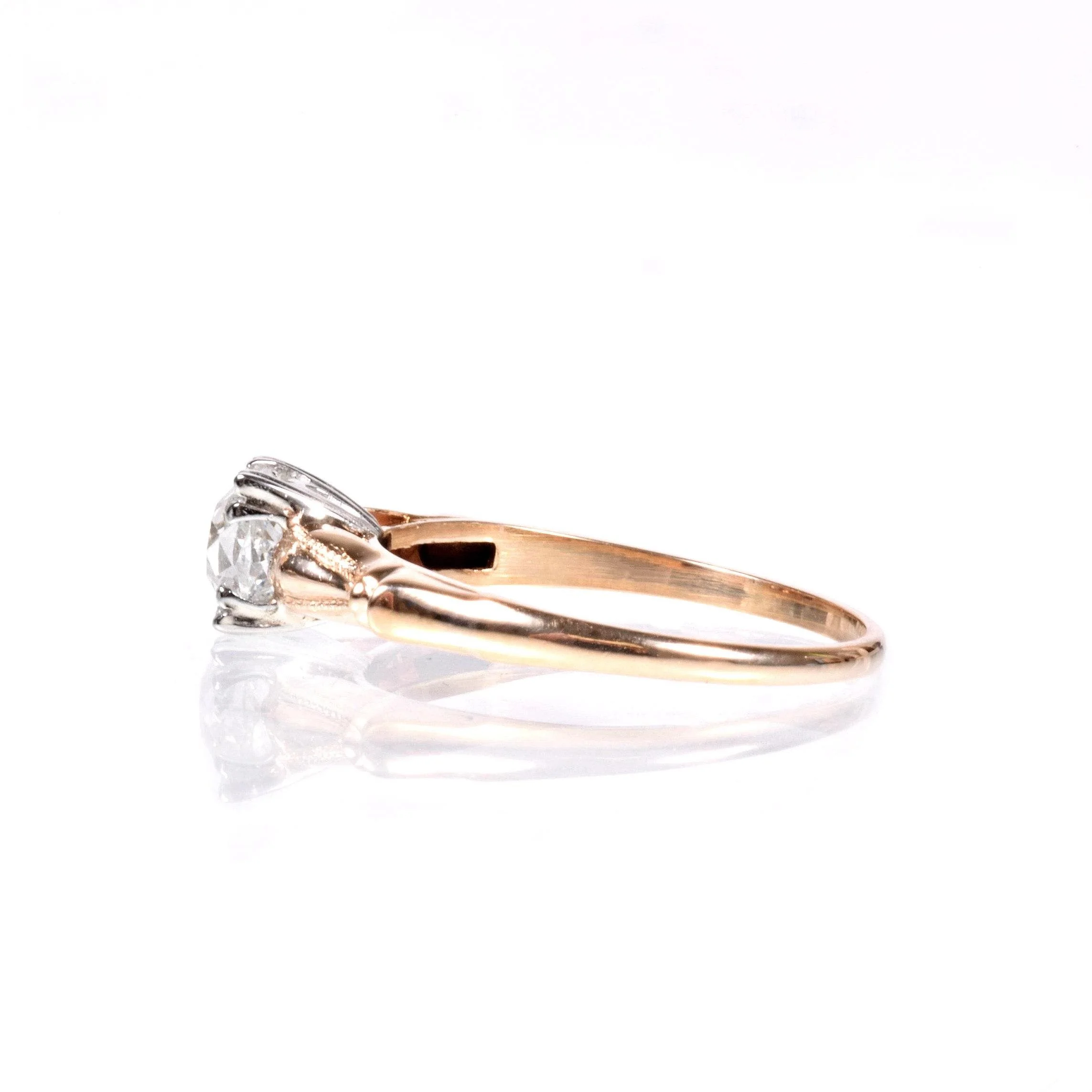 This is a beauty of a mine cut diamond set in a gorgeous high polished white and rosy 14k yellow gold antique setting. This ring dates back to the 1930's and is very catching to the eye. At the center we have a brilliantly sparkling mine cut diamond set in this beautiful solitaire setting. This ring would pair wonderfully with any antique or modern band or even an eternity style diamond band for some added sparkle.