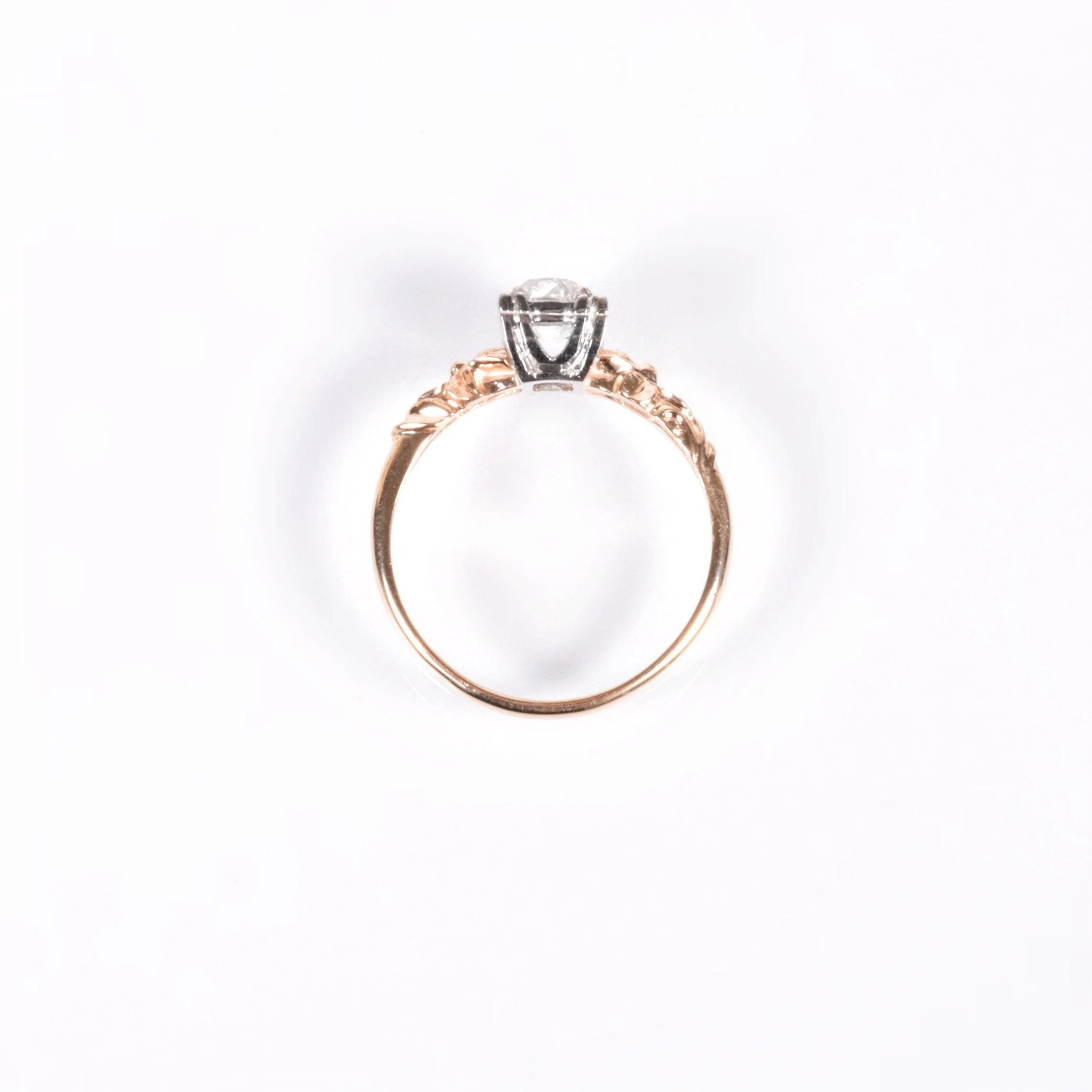 This is a beautiful NEW OLD STOCK antique engagement ring direct to you from the 1930's. This is a rarity to find a jewelry piece from this era in an unworn state, which makes this piece all the more special. This lovely two-tone ring has a sparkling Mine cut diamond in the center set as a solitaire, in a bright 14k yellow and white gold setting. Be the first ever owner of this charming little piece of antique jewelry history!