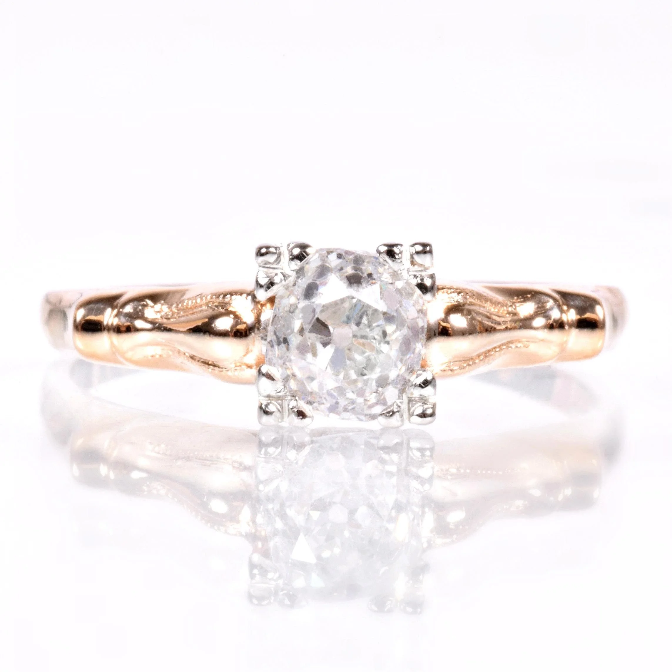 This is a beauty of a mine cut diamond set in a gorgeous high polished white and rosy 14k yellow gold antique setting. This ring dates back to the 1930's and is very catching to the eye. At the center we have a brilliantly sparkling mine cut diamond set in this beautiful solitaire setting. This ring would pair wonderfully with any antique or modern band or even an eternity style diamond band for some added sparkle.