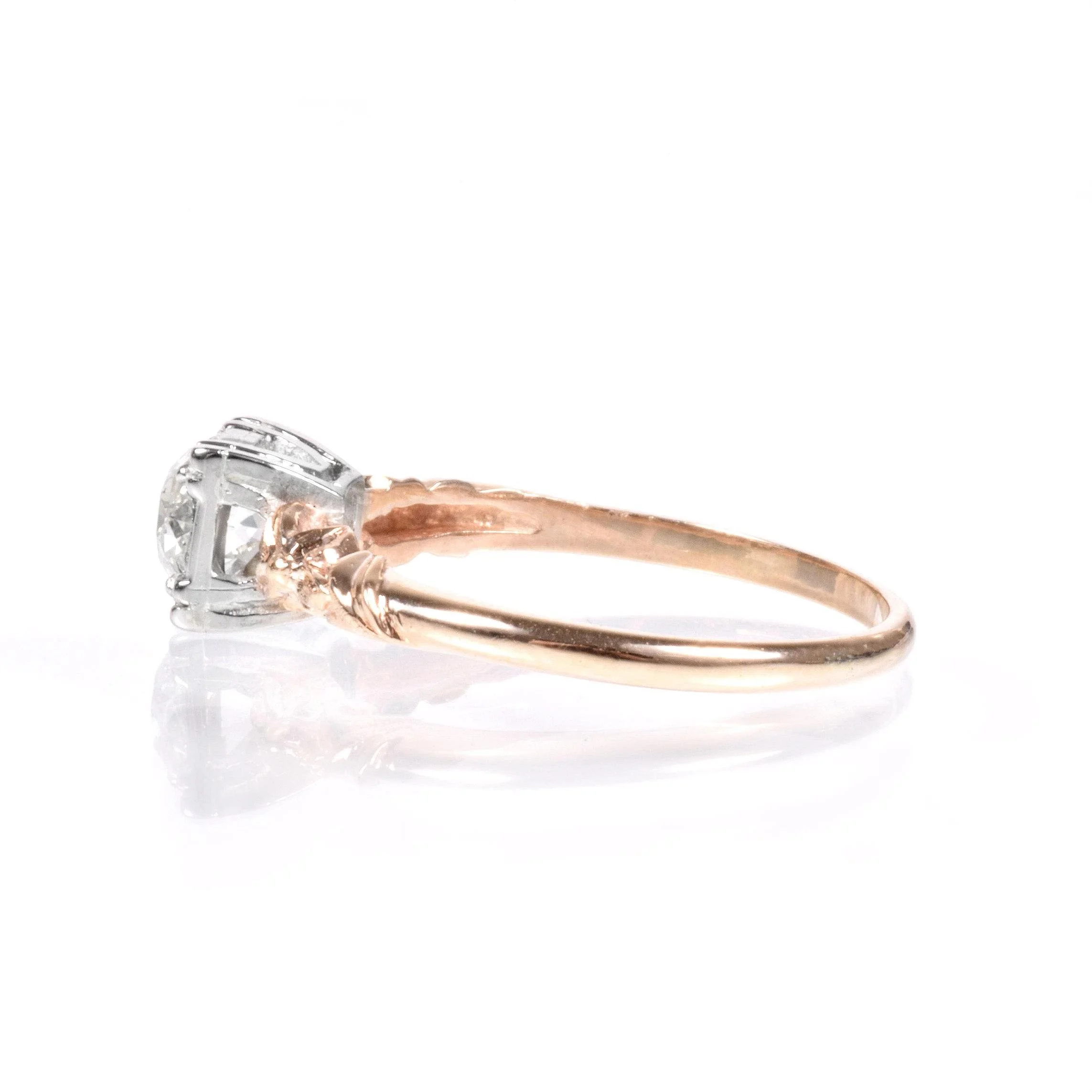 This is a beautiful NEW OLD STOCK antique engagement ring direct to you from the 1930's. This is a rarity to find a jewelry piece from this era in an unworn state, which makes this piece all the more special. This lovely two-tone ring has a sparkling Mine cut diamond in the center set as a solitaire, in a bright 14k yellow and white gold setting. Be the first ever owner of this charming little piece of antique jewelry history!