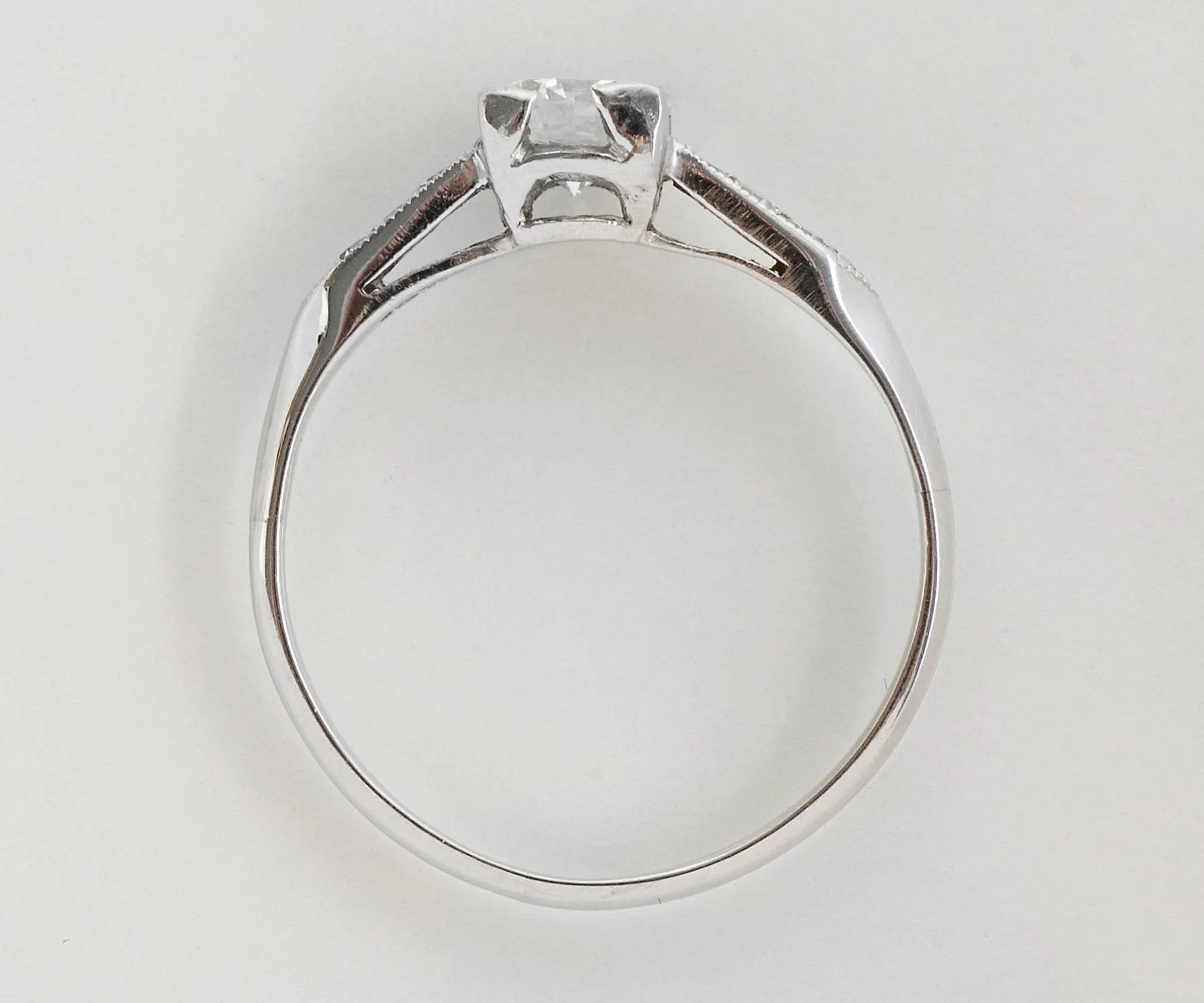 Antique Engagement Ring - Antique 1930's 14k White Gold Diamond Engagement Ring 1930's 14k White Gold Transitional Cut Diamond =.49ct VS2/G 6 Side Diamonds =.10ct VS/G-H Ring Size 6.75 (ring is sizable) Ring measures approximately 5.3mm wide at center, back of band is 1.6mm wide.