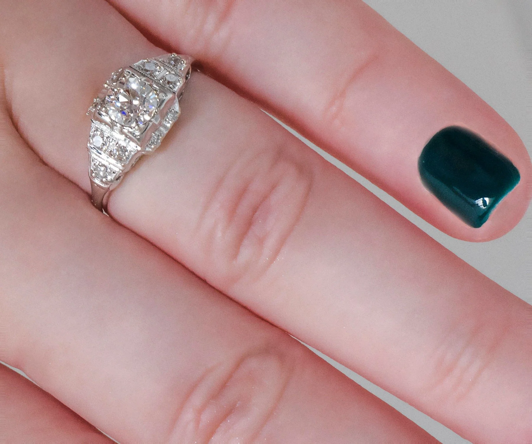 Square....but in a good way! This lovely Art Deco diamond ring is a great example of the style with sharp, geometric lines. In 14k white gold, a fabulous, bright white European cut diamond sits front and center with smaller sparkling diamonds adorning the setting. Wear this antique beauty without a band or pair it up with either a modern or antique band.