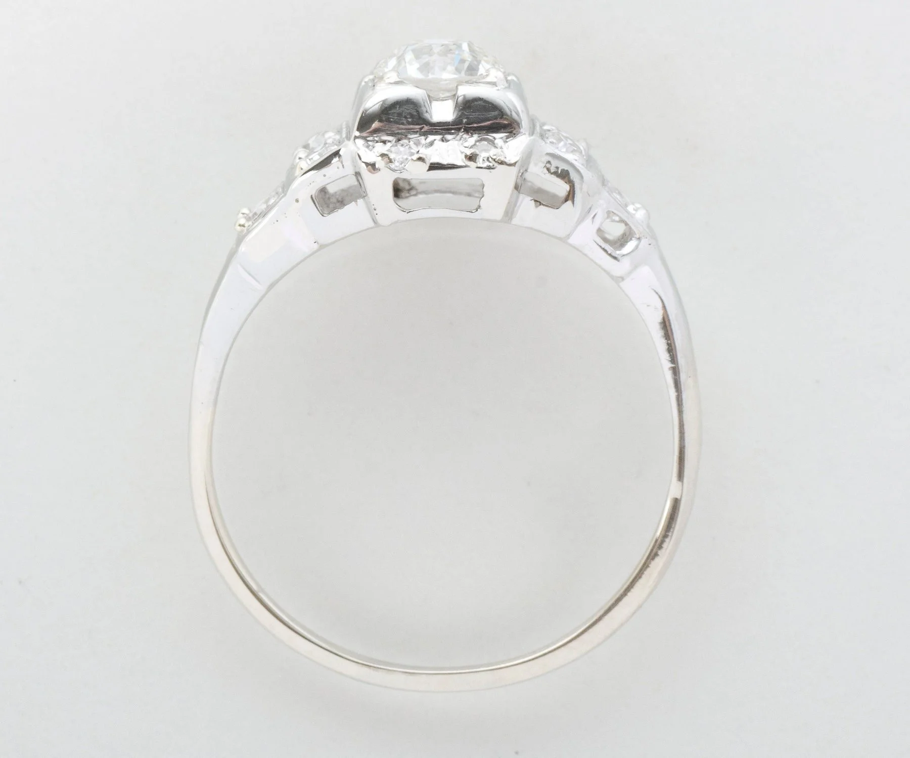 Square....but in a good way! This lovely Art Deco diamond ring is a great example of the style with sharp, geometric lines. In 14k white gold, a fabulous, bright white European cut diamond sits front and center with smaller sparkling diamonds adorning the setting. Wear this antique beauty without a band or pair it up with either a modern or antique band.