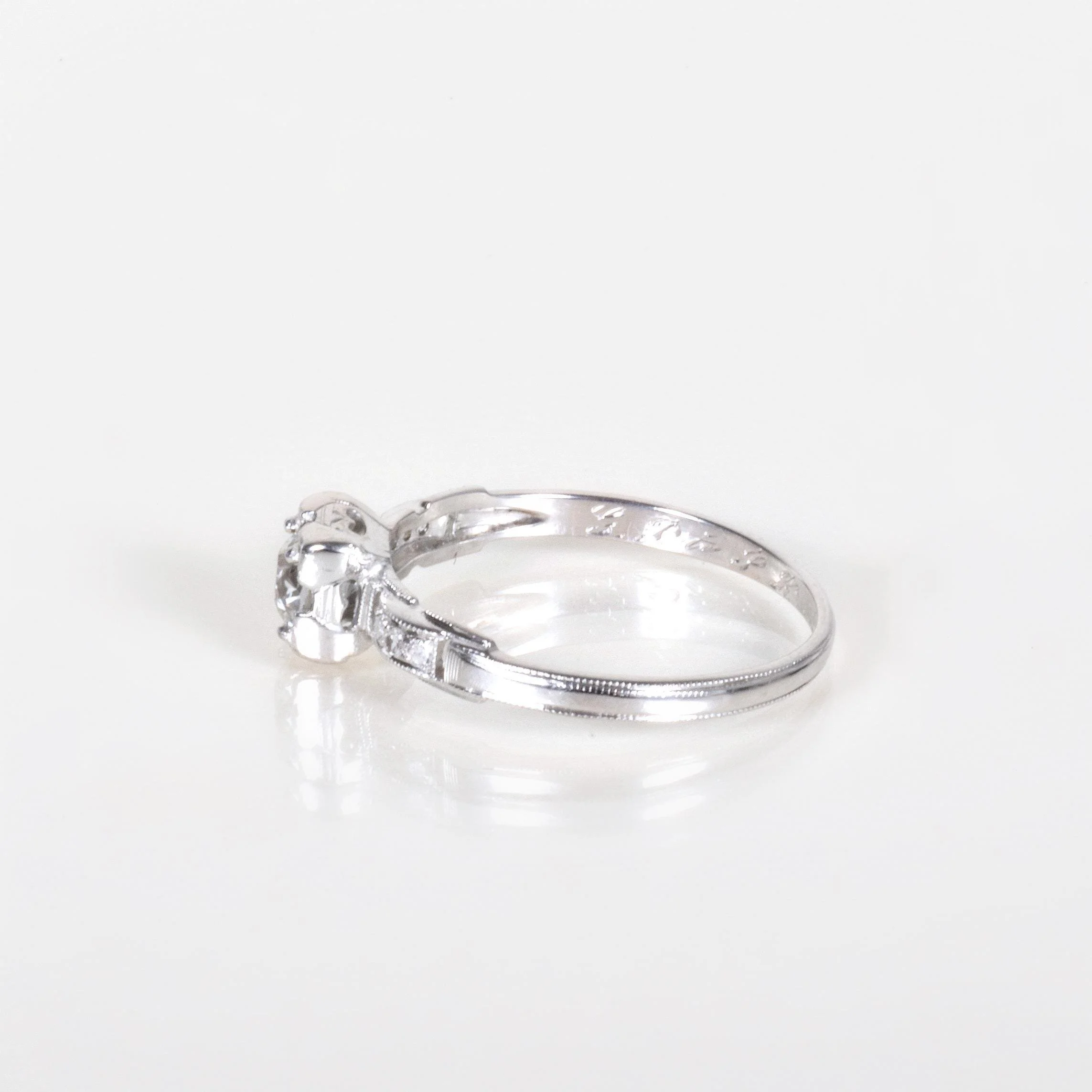 Ah, the clean and crisp outlining of Art Deco, it is what attracts us! This stunning antique diamond engagement ring in 18k white gold is simply is ready to go and will pair well with a wedding band of any era. The original engraving is still visible which we really love to see in our shop! A gorgeous, glimmering European cut diamond is showcased at the center. This one is a showstopper!