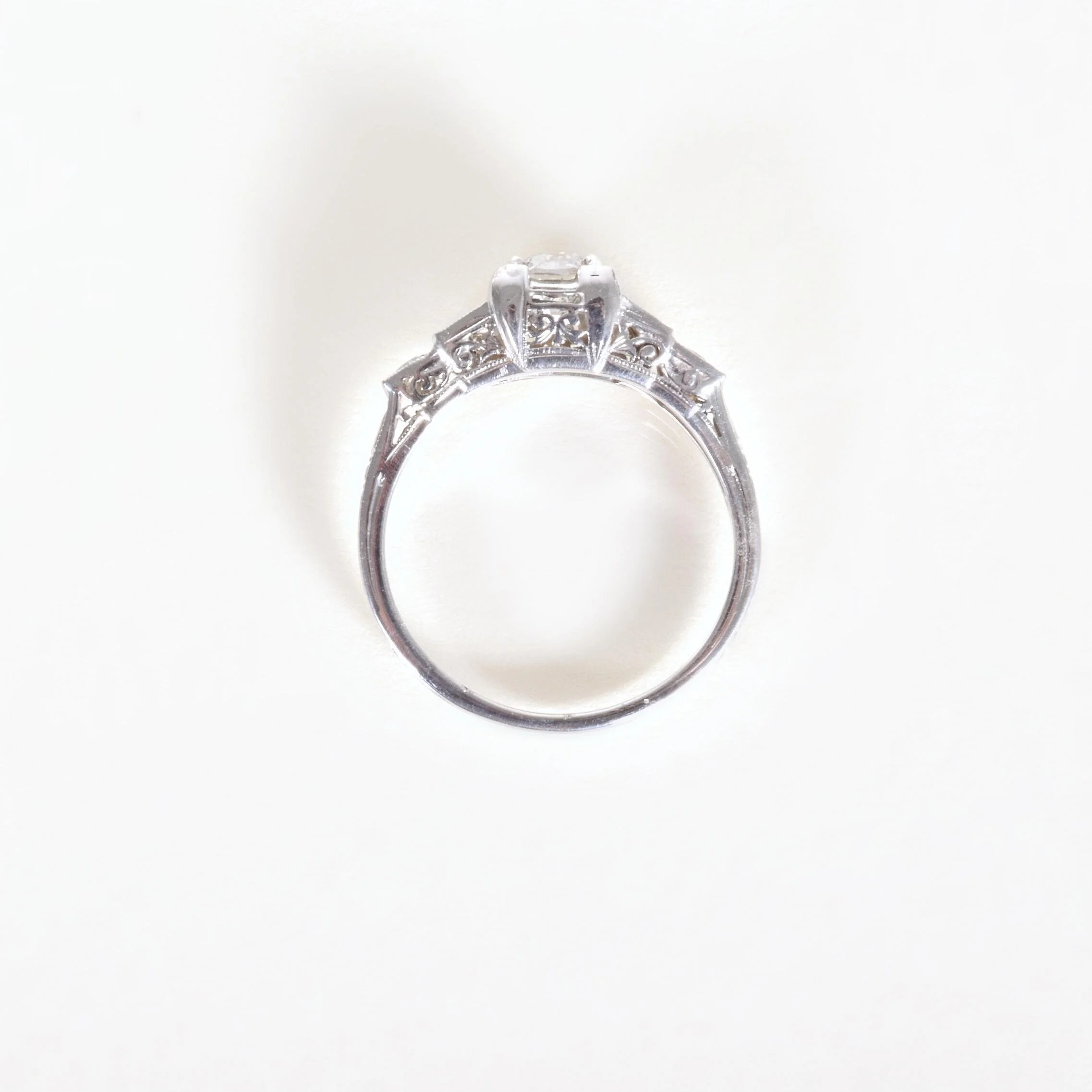 Our antique step-cut style diamond engagement ring is fabulous and ready for that discerning Art Deco jewelry lover who is probably YOU! In bright 18k white gold, a stunning European cut diamond of over 1/2 carat resides at the center with accenting diamonds cascading down each side. Owning a highly collectible and coveted Belais ring is really like wearing a piece of jewelry history. The company which began in 1873 is considered to be one of the first US manufacturers to use white gold. In 1917 the company launched their very own formula for 18k white gold which was sometimes referred to as "Belais Metal". This beautiful collectible piece is of the highest quality and will continue to last for generations to come.