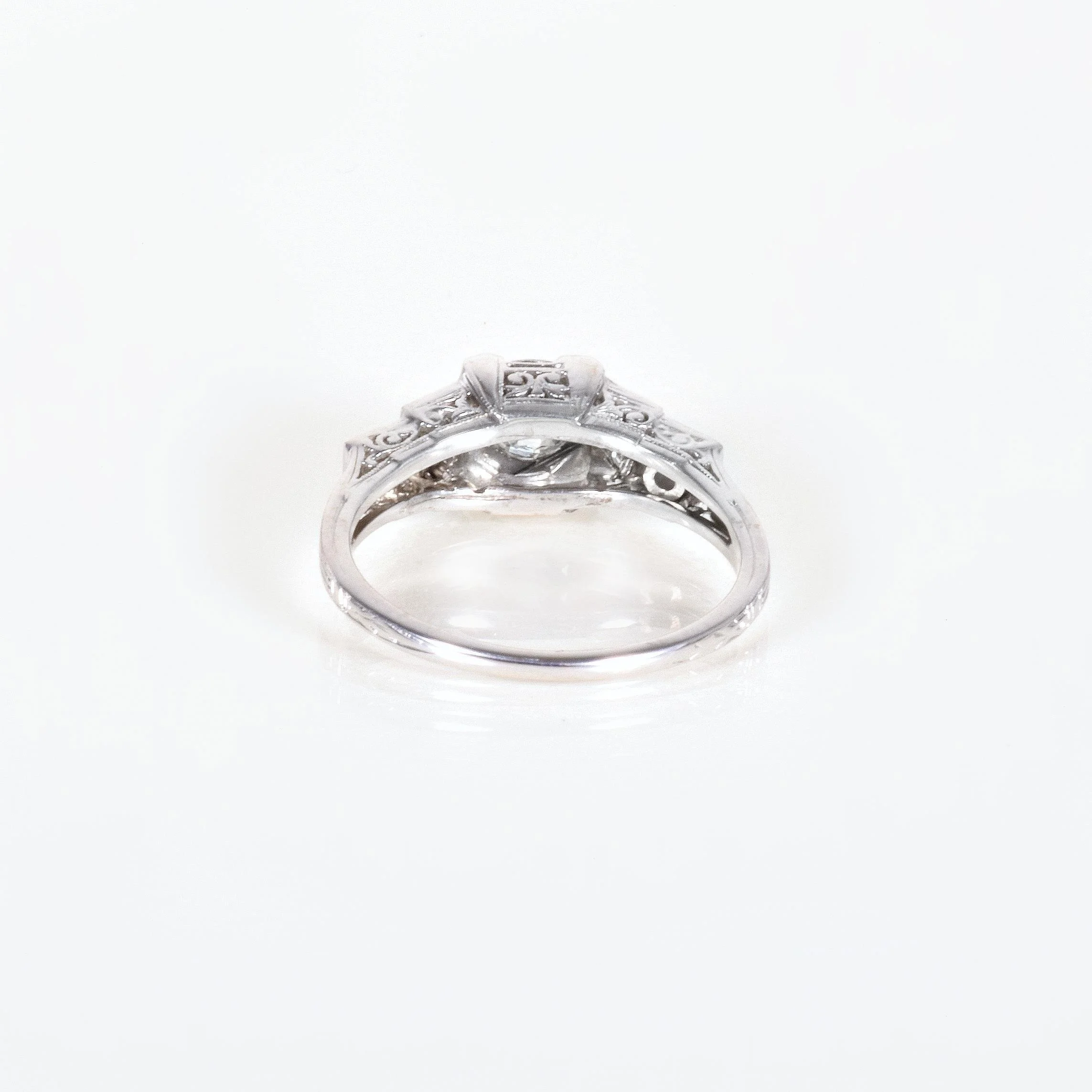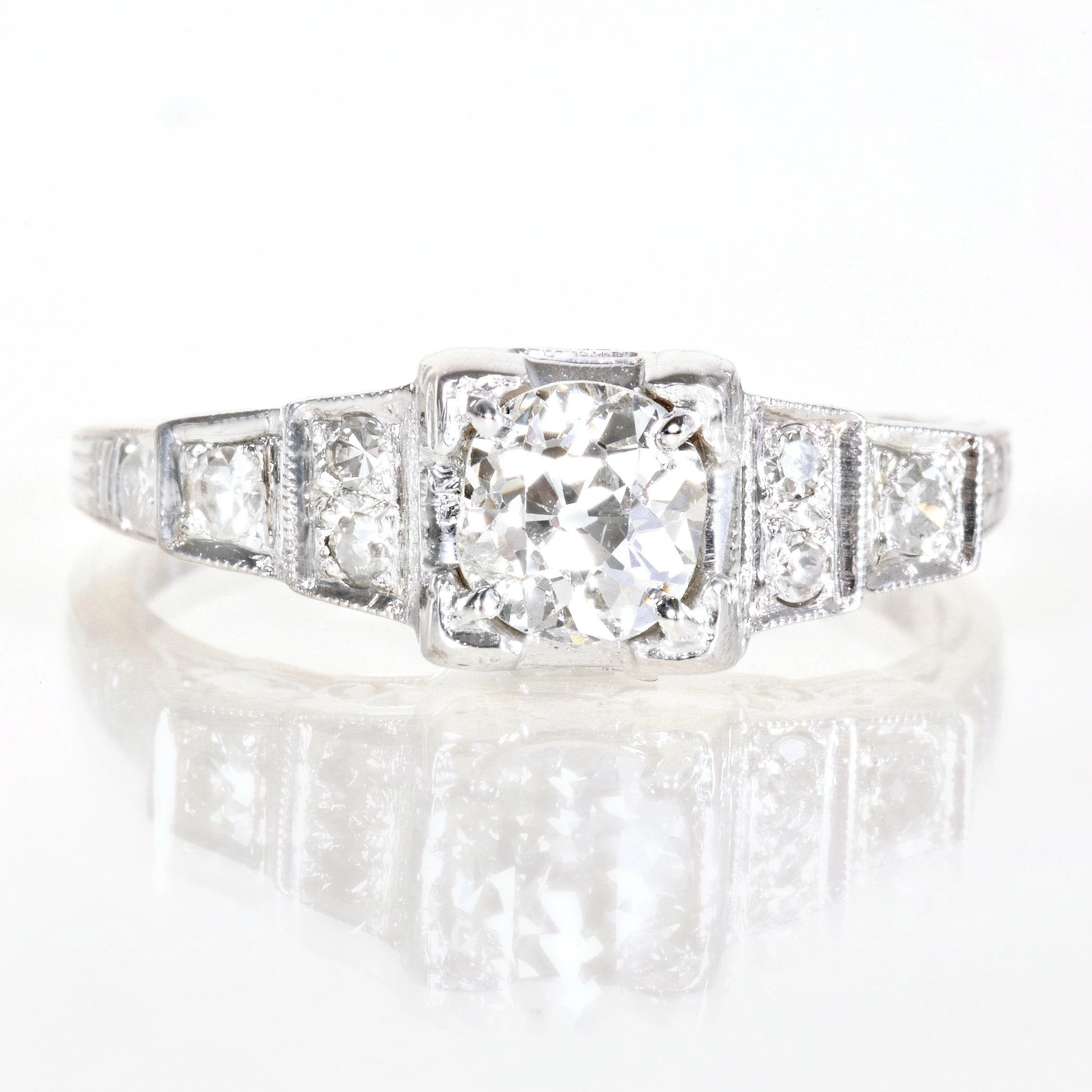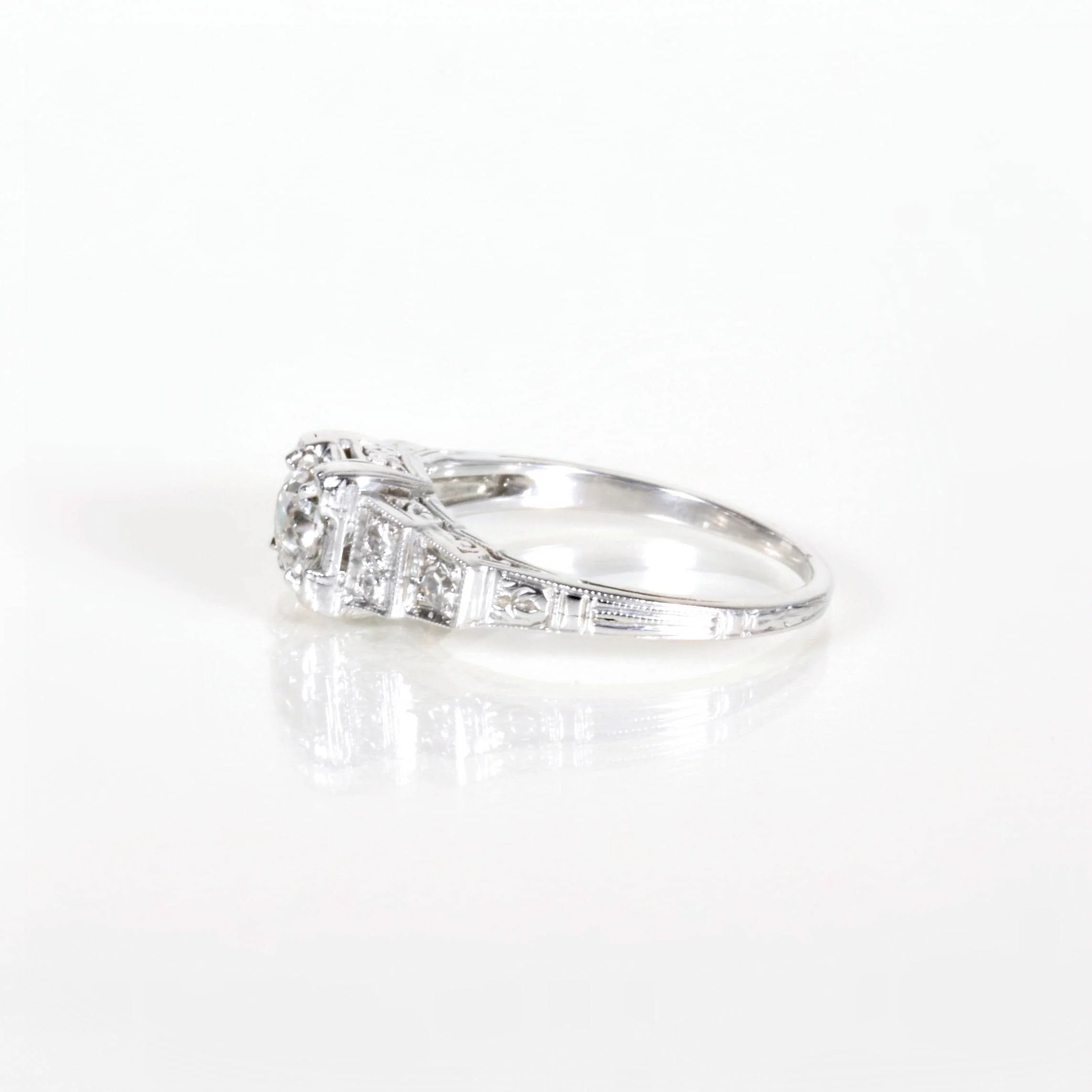 Our antique step-cut style diamond engagement ring is fabulous and ready for that discerning Art Deco jewelry lover who is probably YOU! In bright 18k white gold, a stunning European cut diamond of over 1/2 carat resides at the center with accenting diamonds cascading down each side. Owning a highly collectible and coveted Belais ring is really like wearing a piece of jewelry history. The company which began in 1873 is considered to be one of the first US manufacturers to use white gold. In 1917 the company launched their very own formula for 18k white gold which was sometimes referred to as "Belais Metal". This beautiful collectible piece is of the highest quality and will continue to last for generations to come.