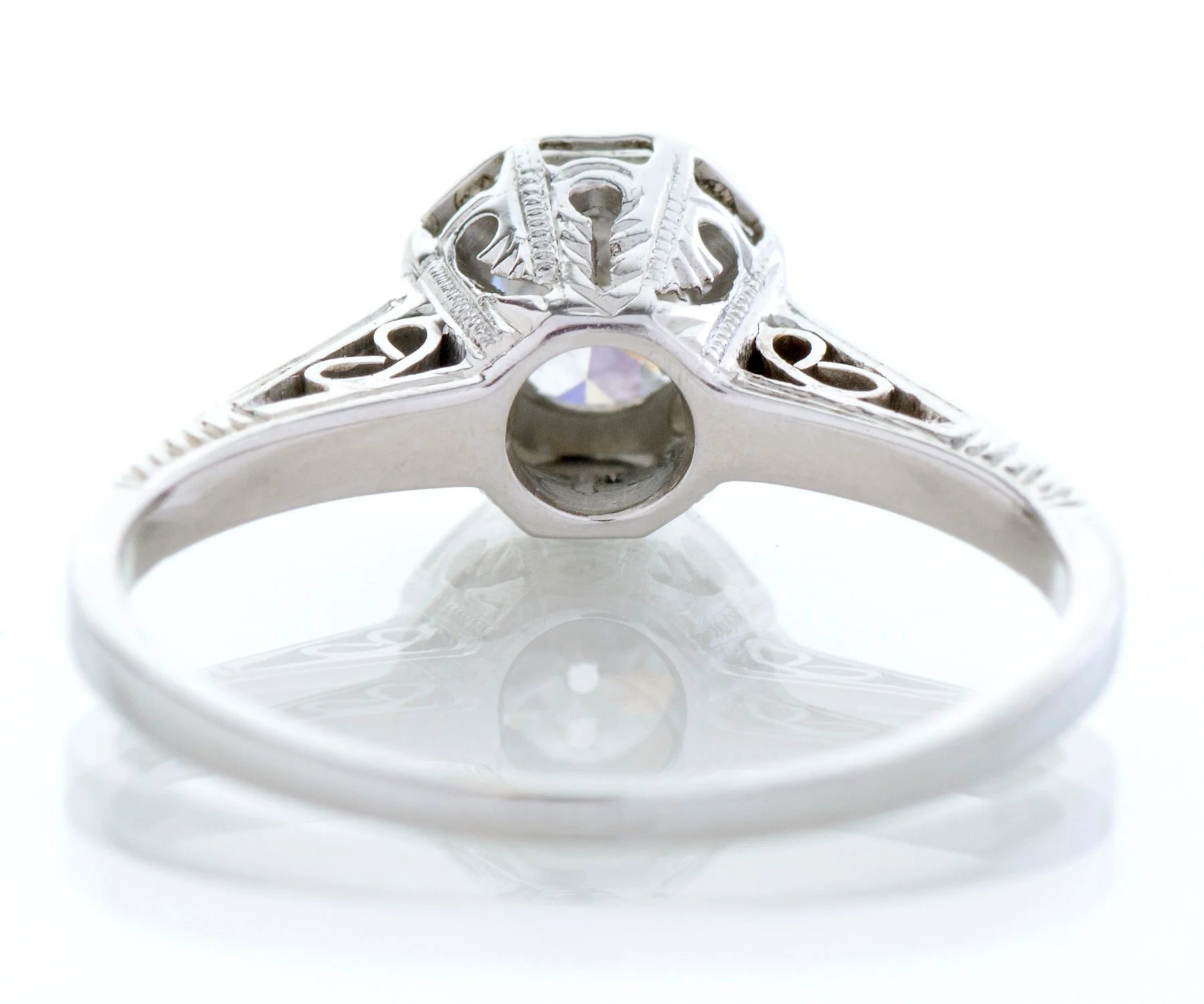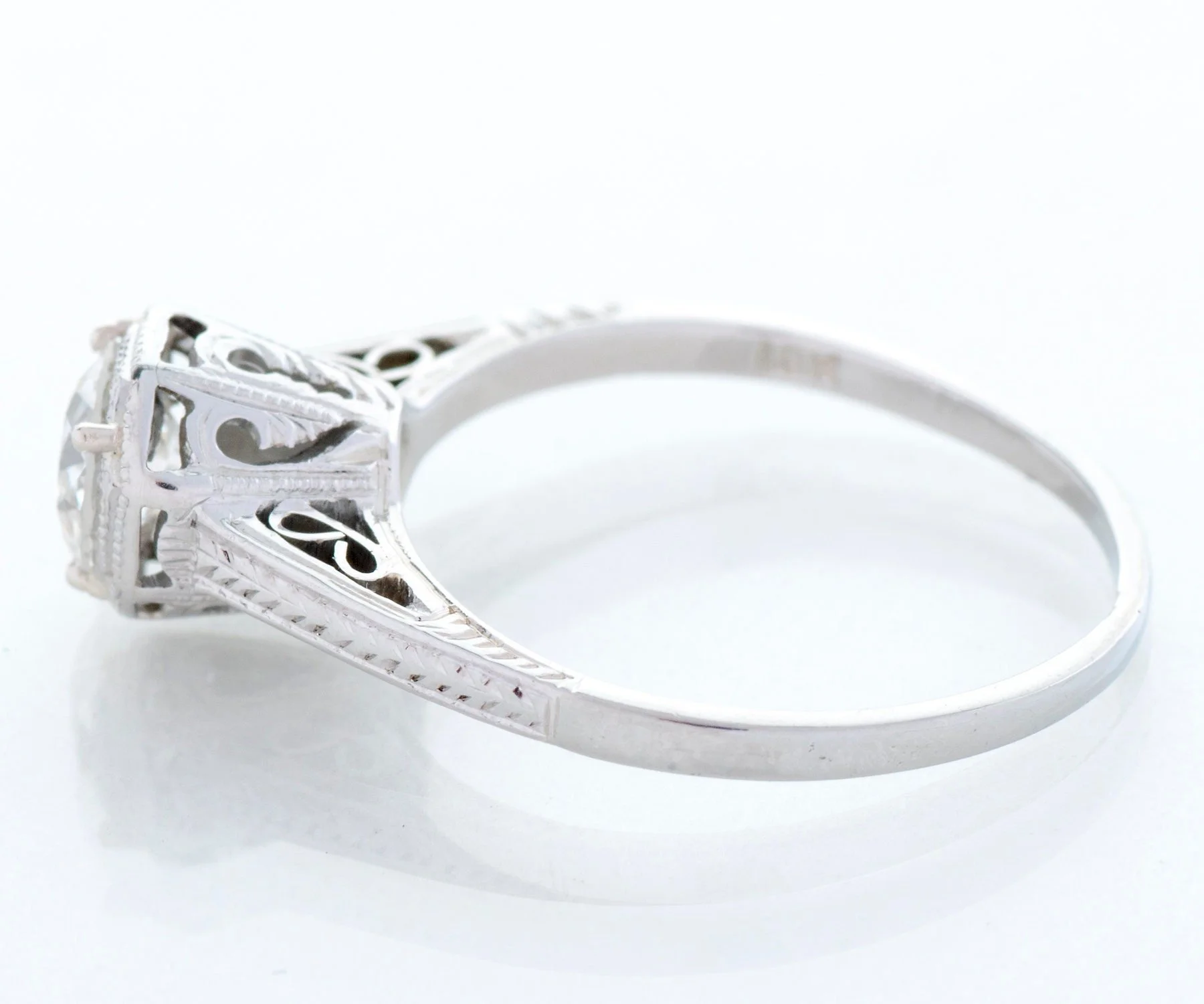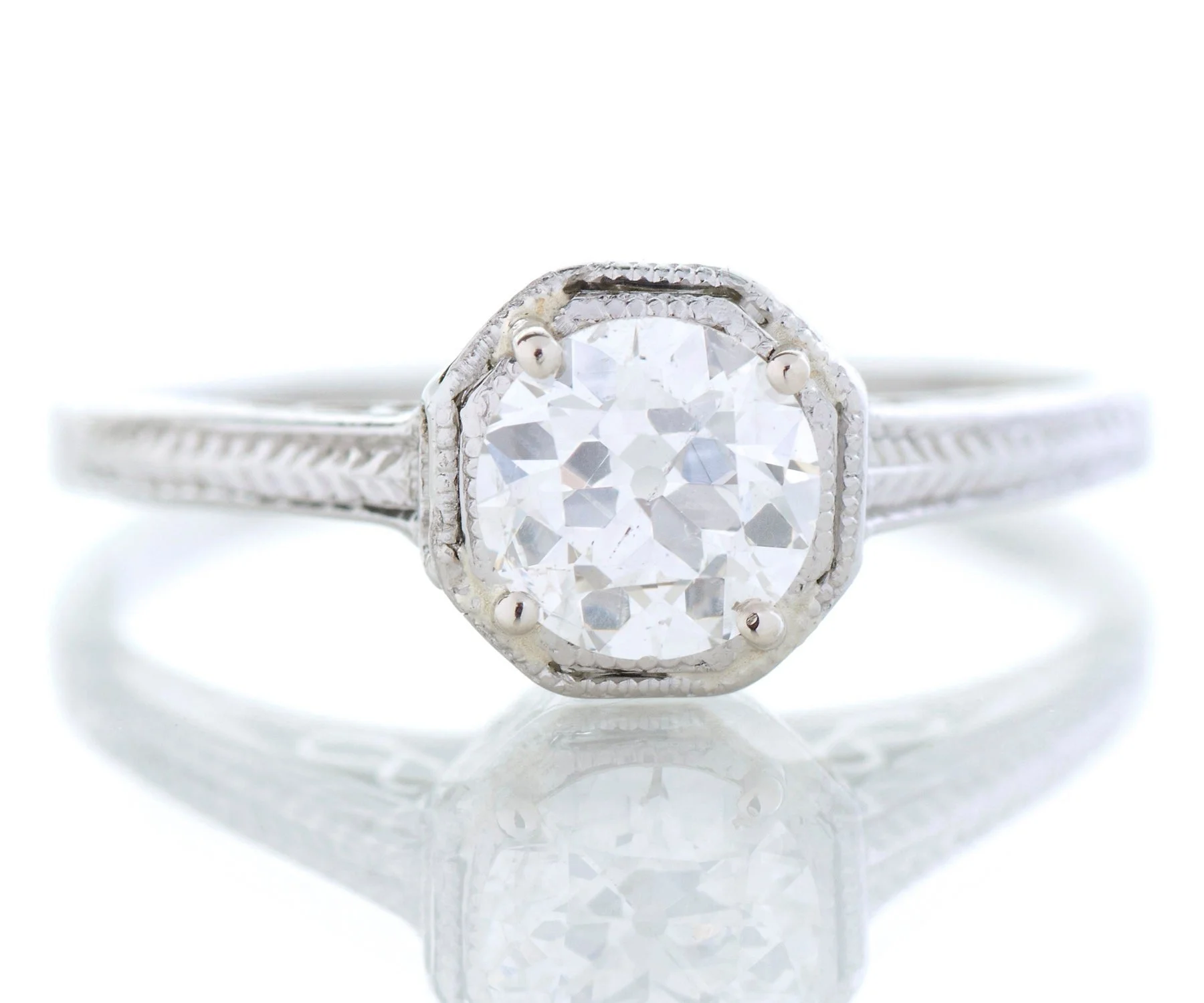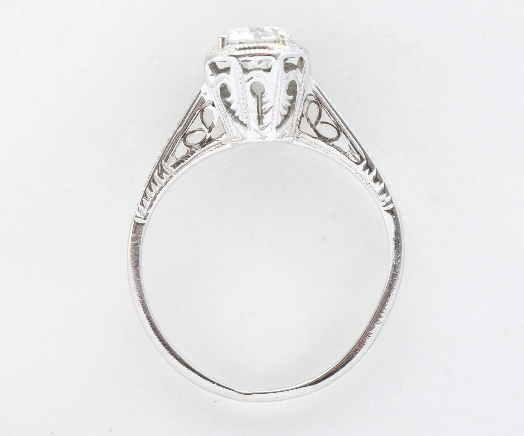 This beauty of an antique Art Deco diamond engagement ring comes straight out of the roaring 20's. A stunning European cut diamond sits snugly at the center within prongs and an octagonal bezel. Crafted in 18k white gold with delicate open wirework and the wheat pattern engraved on the shank of the ring. The wheat pattern was thought to signify a few things including a bountiful harvest, a connection to the natural world and fertility! This pattern was very popular in the 1920's