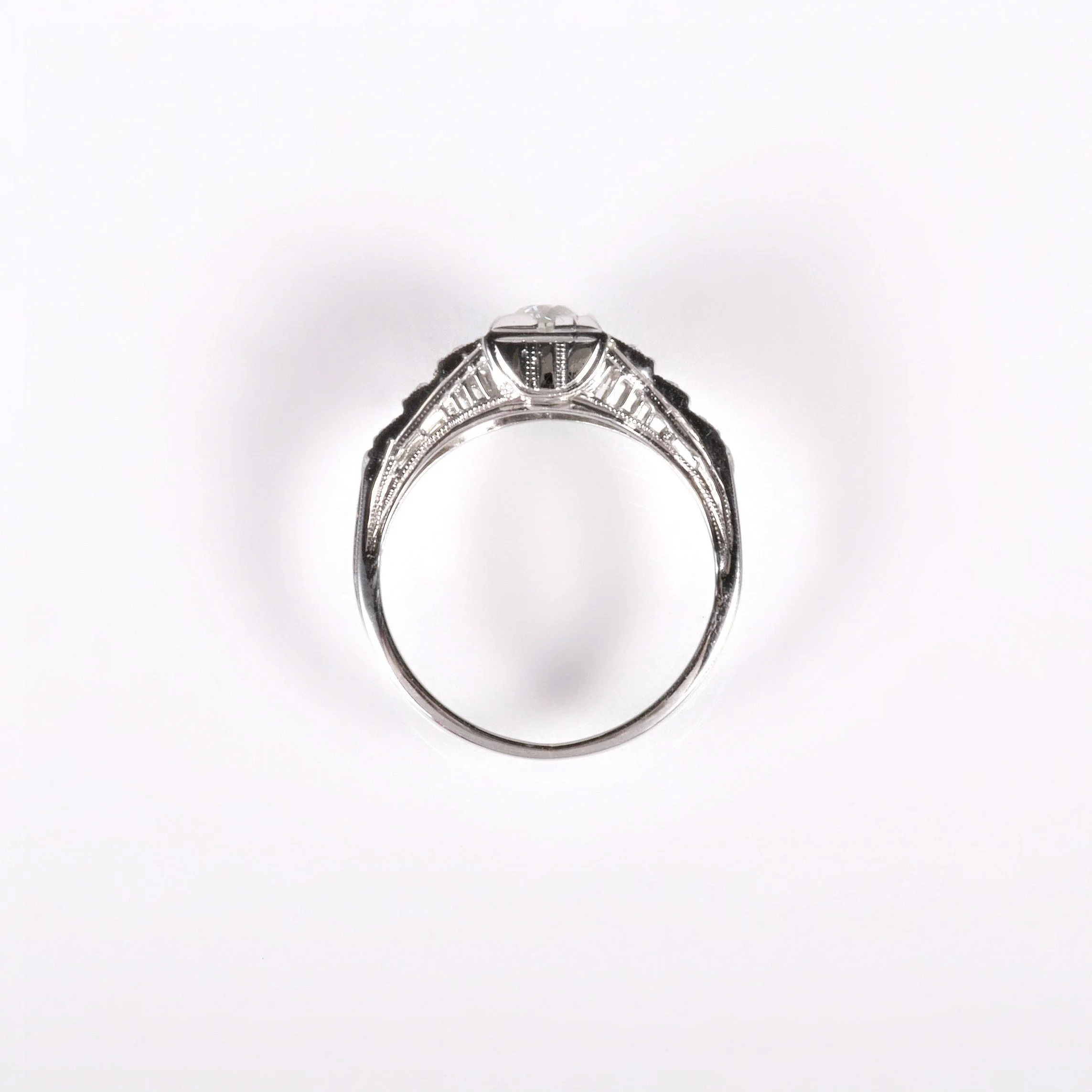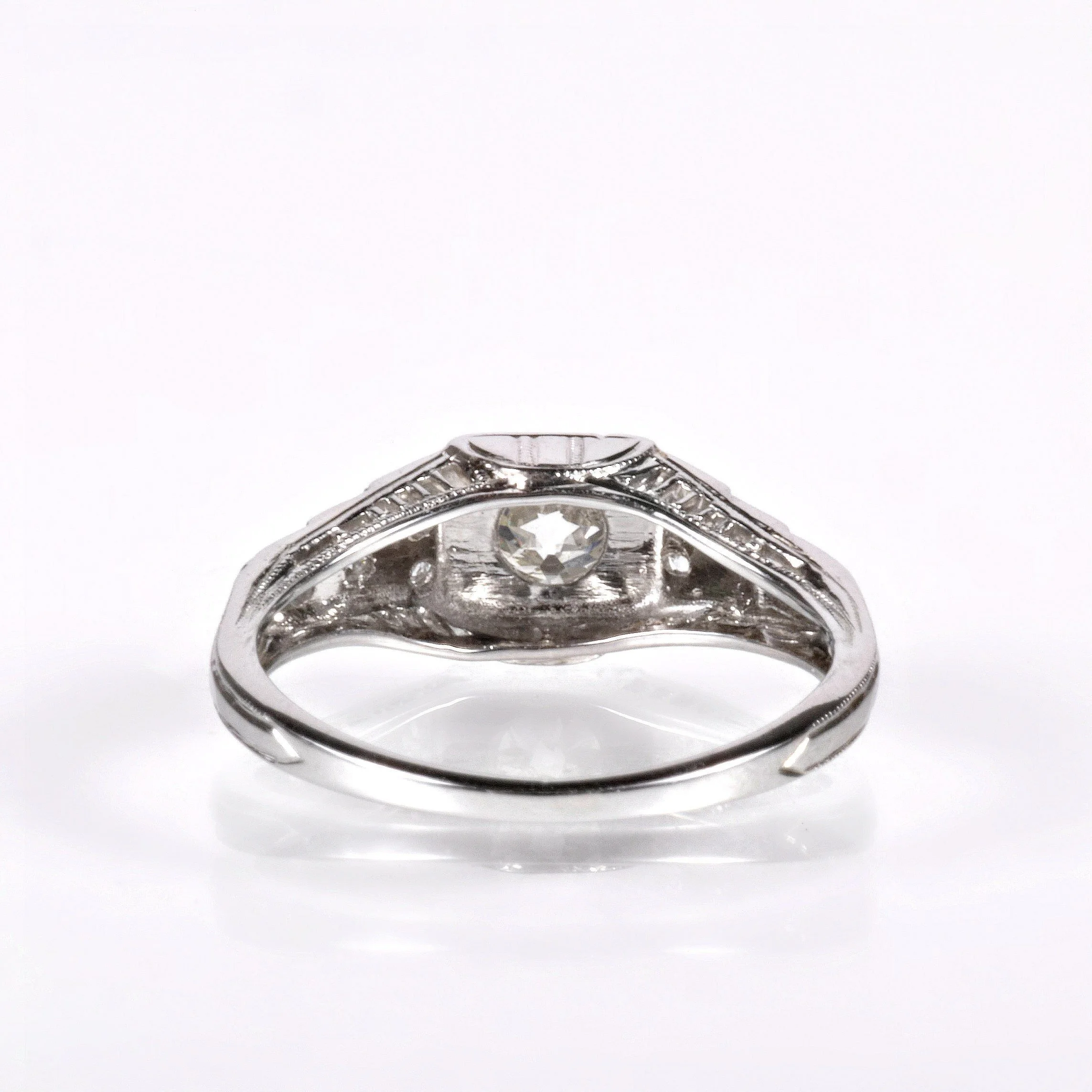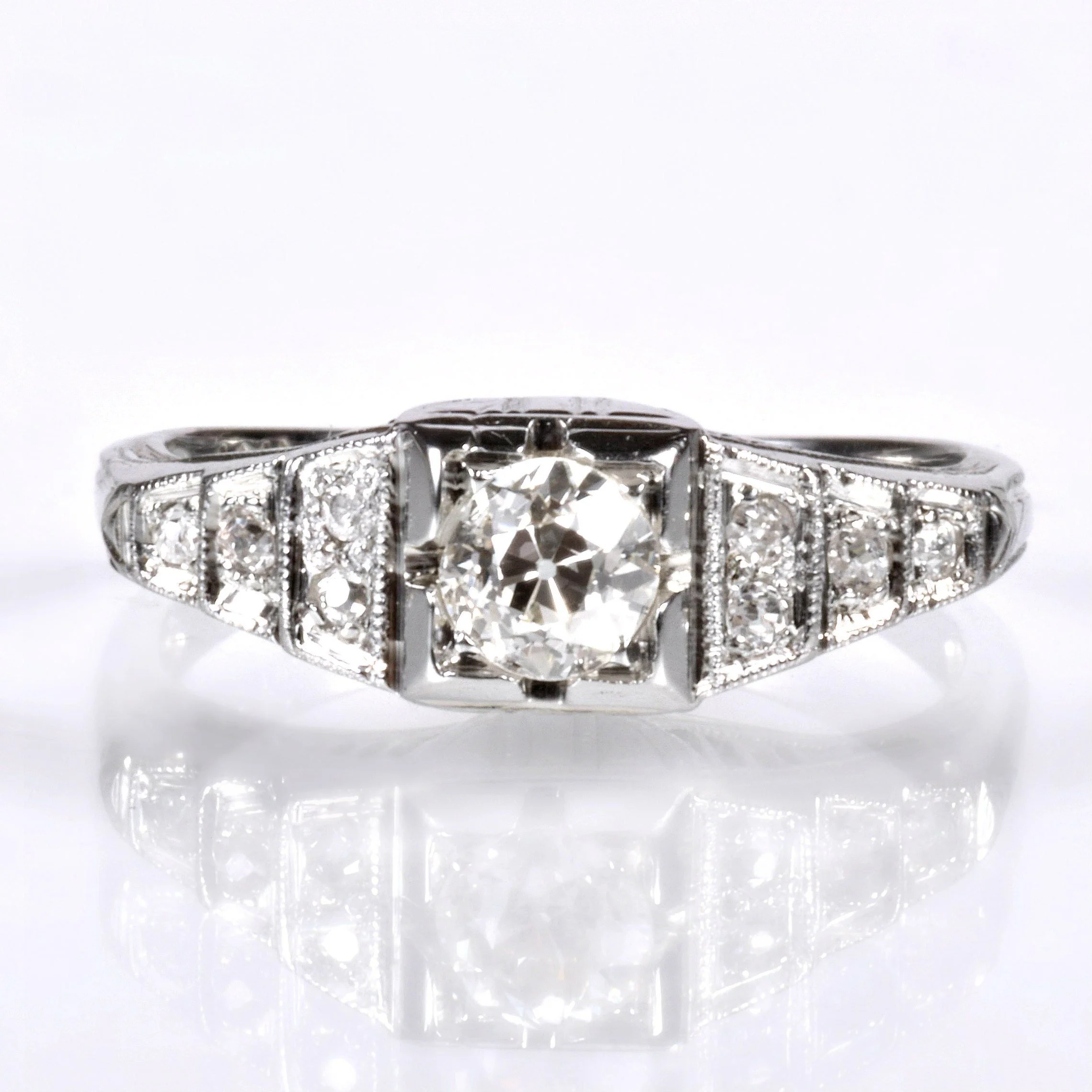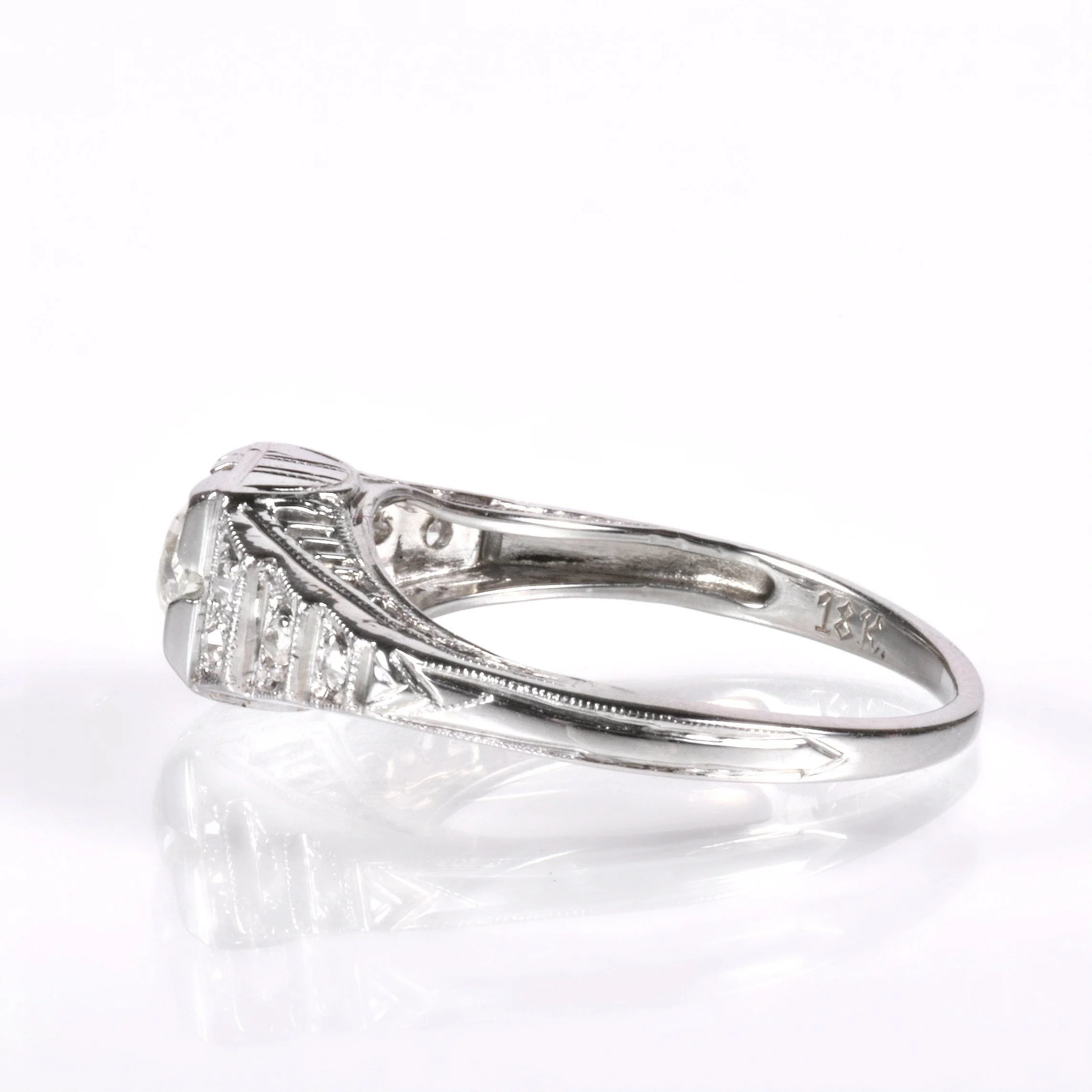 Antique Engagement Ring - Antique Art Deco 18k White Gold Diamond Engagement Ring Art Deco 18k White Gold European Cut Center Diamond =.36ct VS1/J 8 European Cut Side Diamonds =.08ct SI1-I1/G-J Ring Size 5.25 (sizable) Ring measures approximately 6.2mm at center, back of band is 1.5mm wide.