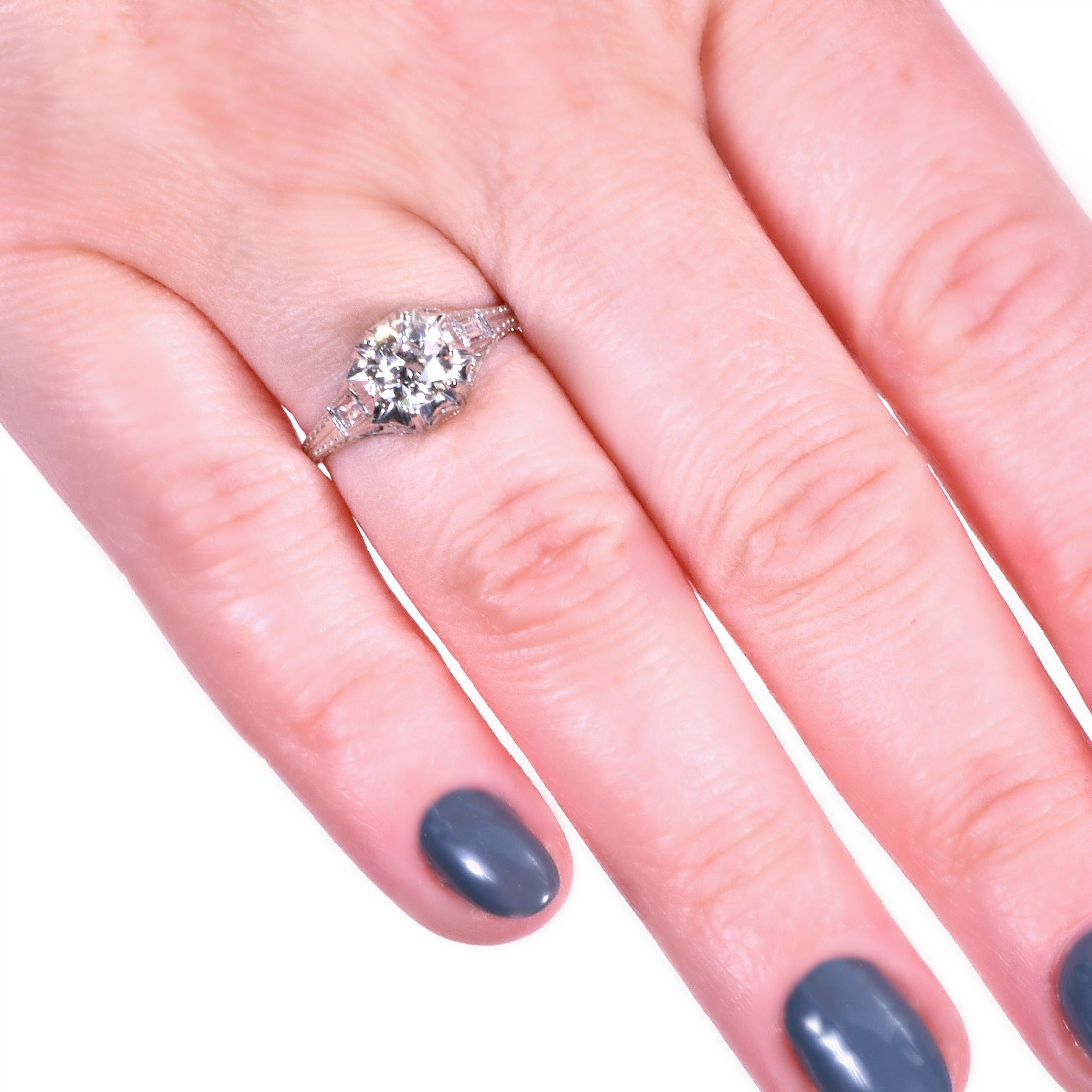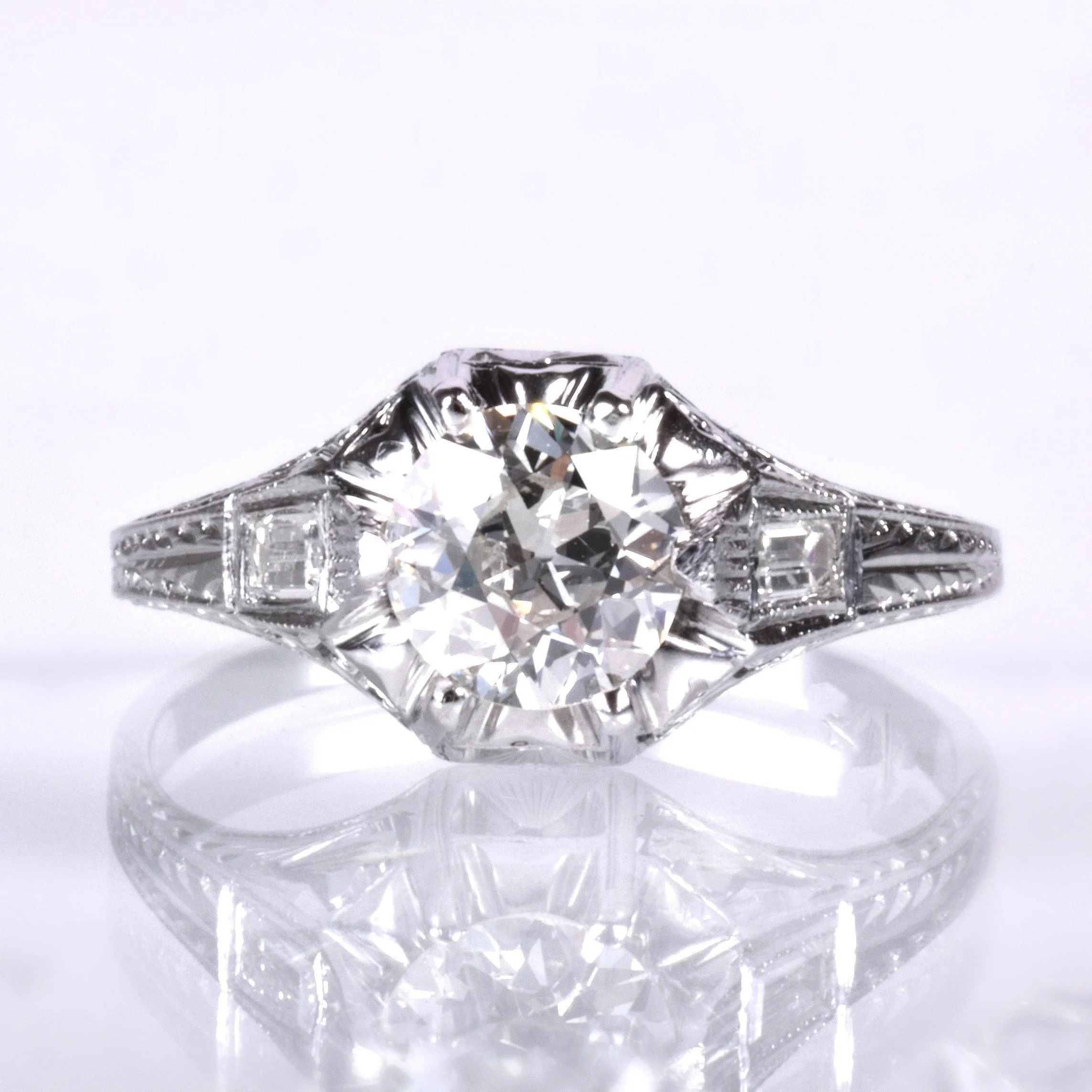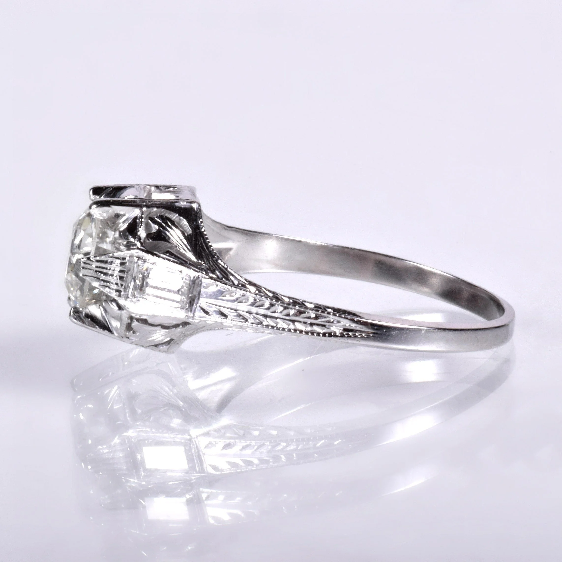 Antique Engagement Ring - Antique Art Deco 18k White Gold Diamond Engagement Ring Circa 1920's 18k White Gold European Cut Diamond =.80ct VS1/K (GIA Certified) 2 Baguette Diamonds =.20ct VS/G-H Ring Size 6.5 (sizable) Ring measures approximately 8.4mm tall in the center, back of band is 1.5mm wide.