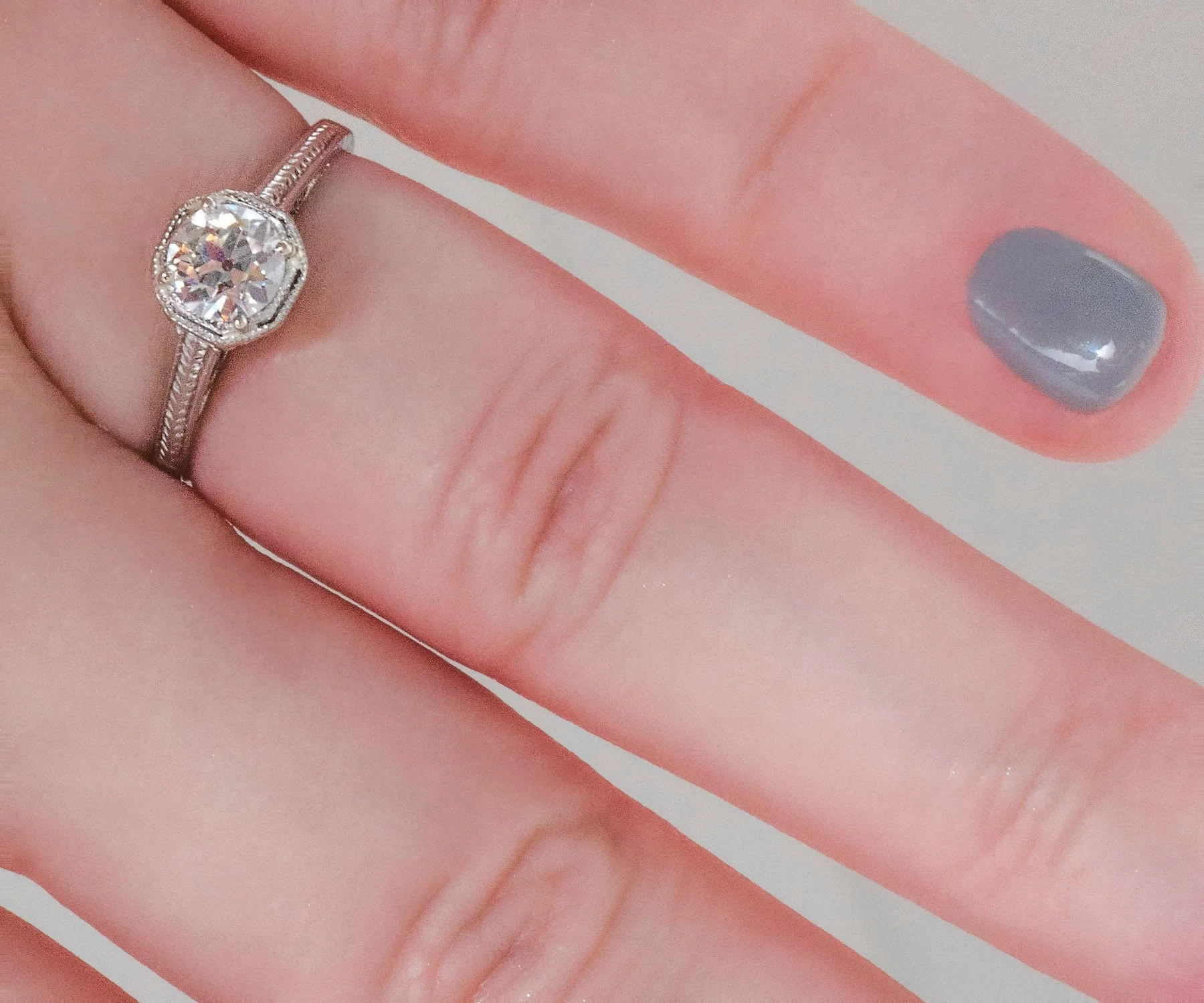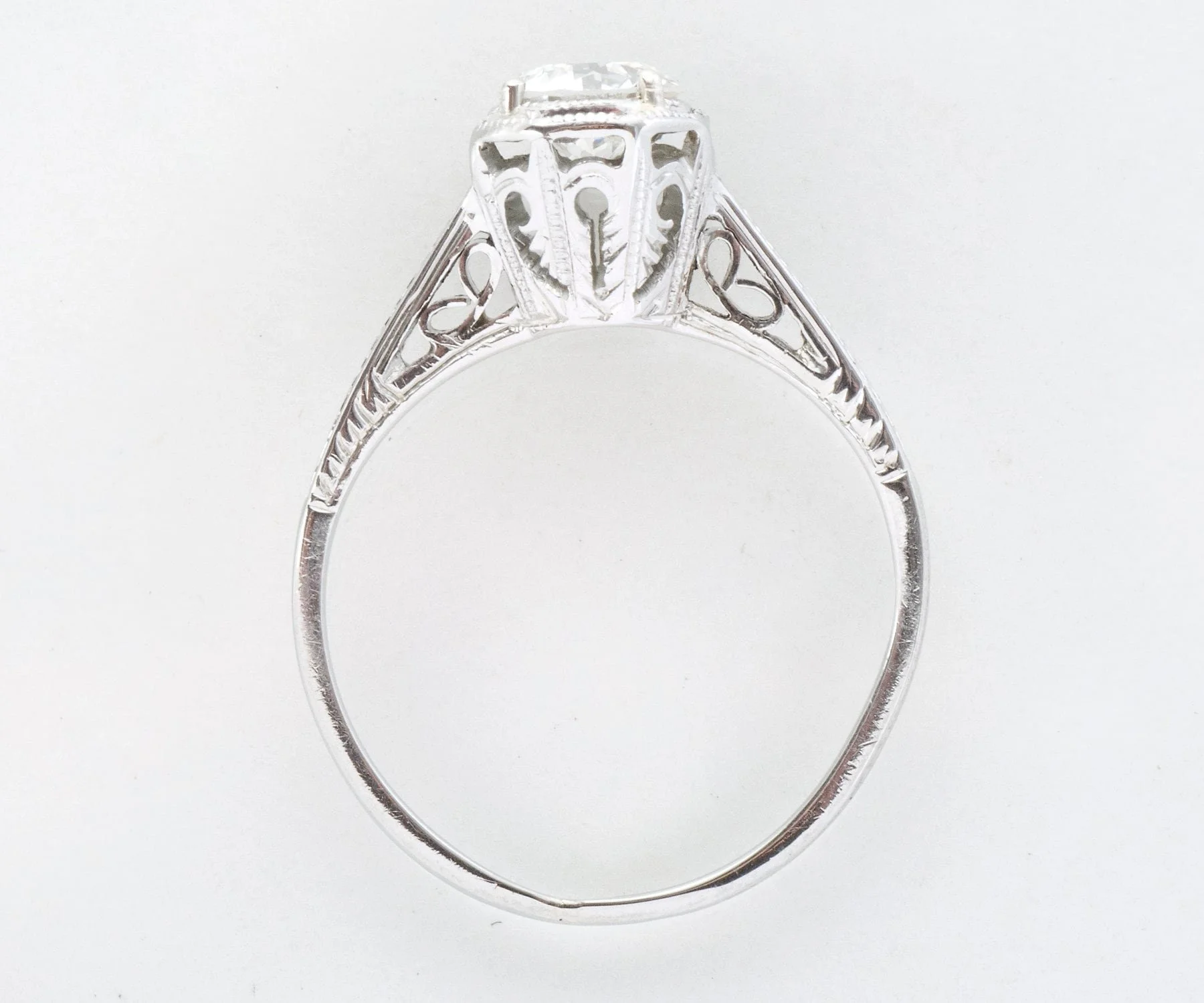 This beauty of an antique Art Deco diamond engagement ring comes straight out of the roaring 20's. A stunning European cut diamond sits snugly at the center within prongs and an octagonal bezel. Crafted in 18k white gold with delicate open wirework and the wheat pattern engraved on the shank of the ring. The wheat pattern was thought to signify a few things including a bountiful harvest, a connection to the natural world and fertility! This pattern was very popular in the 1920's