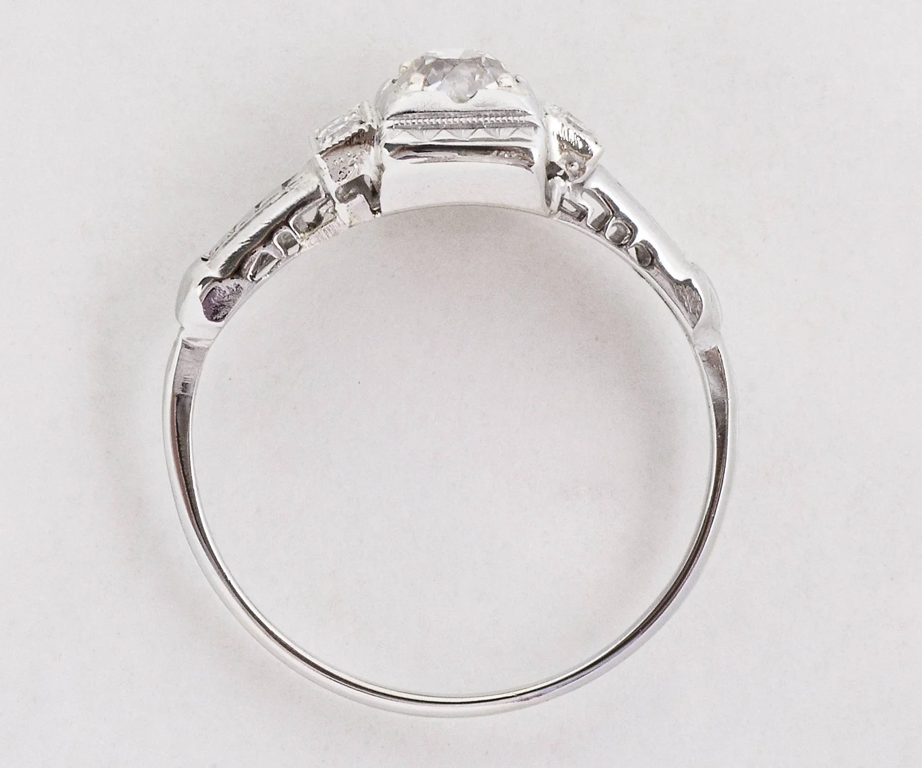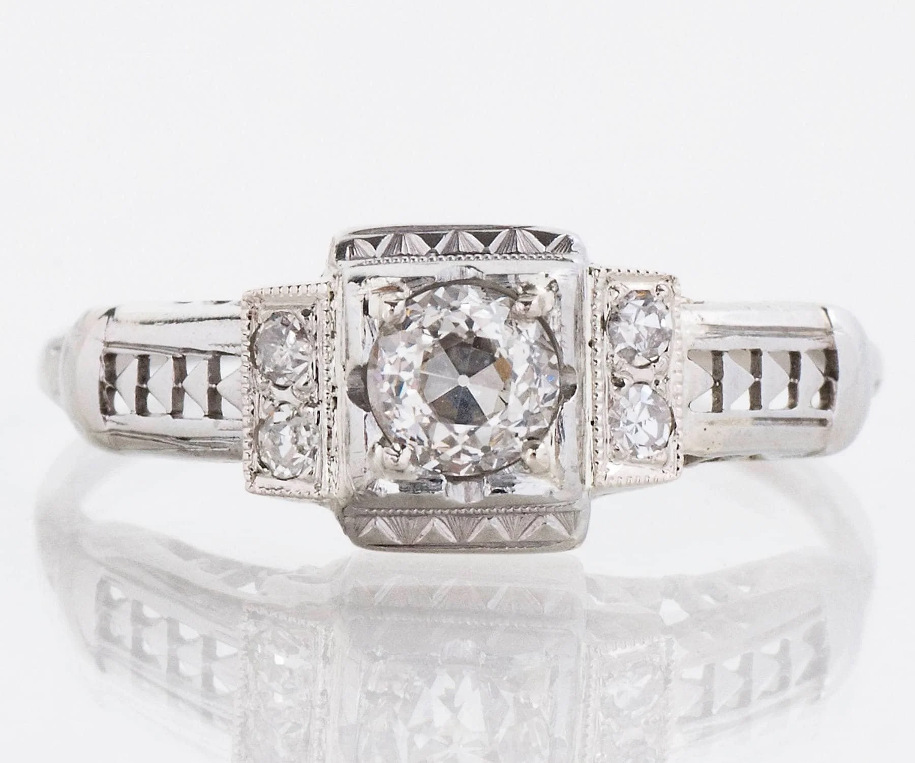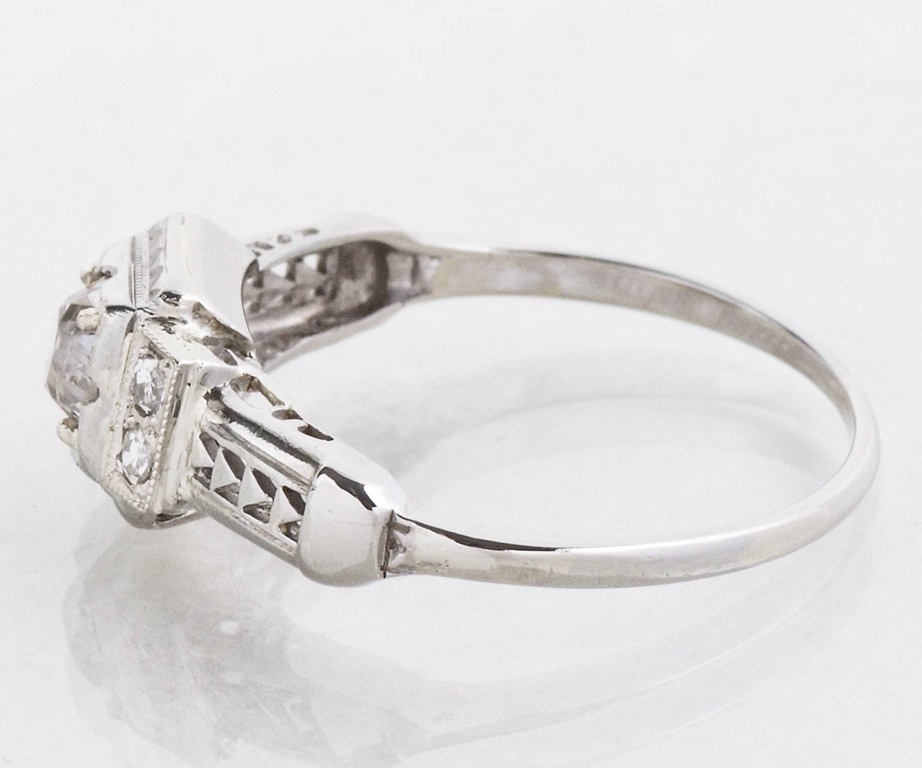 Antique Engagement Ring - Antique Art Deco 18k White Gold Diamond Engagement Ring Art Deco 18k White Gold European Cut Diamond =.43ct VS2/J 4 Side Diamonds =.06ct VS2-SI1/G-H Ring Size 7.25 (ring is sizable) Ring measures approximately 7.5mm wide, back of band is 1.3mm wide.