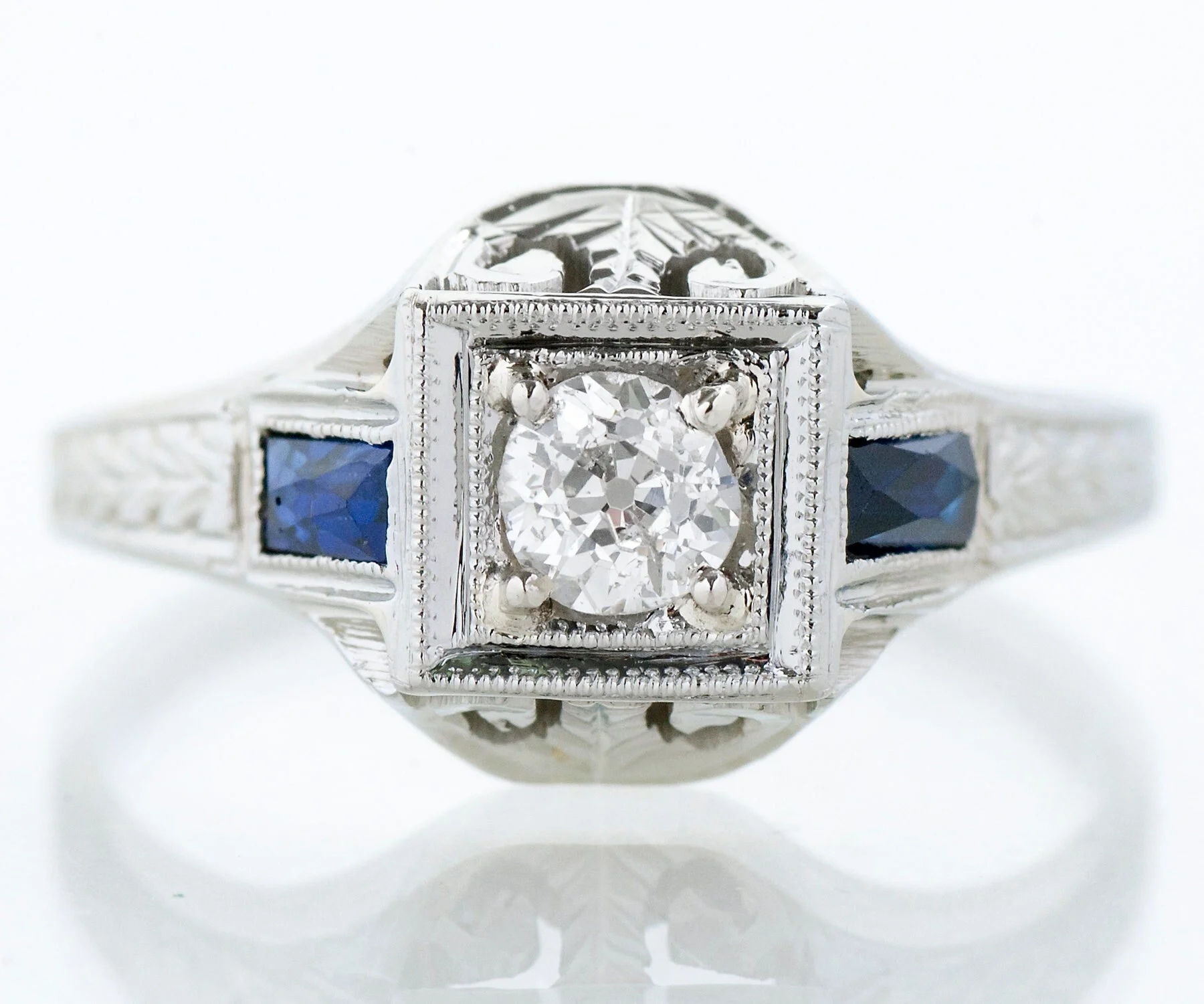 Antique Engagement Ring - Antique Art Deco 18k White Gold Diamond & Sapphire Engagement Ring
