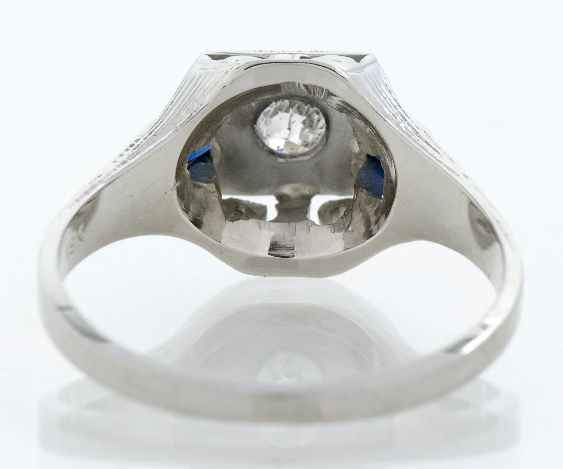 Antique Engagement Ring - Antique Art Deco 18k White Gold Diamond & Sapphire Engagement Ring Art Deco 18k White Gold European Cut Diamond =.24ct SI3/H 2 Baguette Sapphires =.16ct Ring Size 6.75 (ring is sizable) Ring measures approximately 9.7mm at center, back of band is 1.9mm wide.
