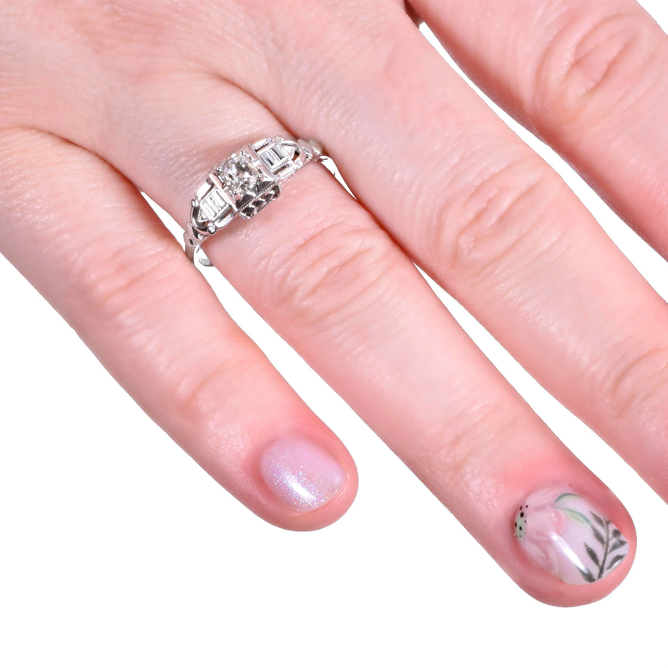 Antique Art Deco is defined here with symmetrical geometric shapes and lively beadwork. This dynamite diamond engagement ring was crafted in bright 18k white gold and it showcases an icy white mine-cut diamond at the center. Intricate detailing can be seen from every angle, including delicate wire-work. Nice and low profile makes this ring easy to wear daily. A lovely find!