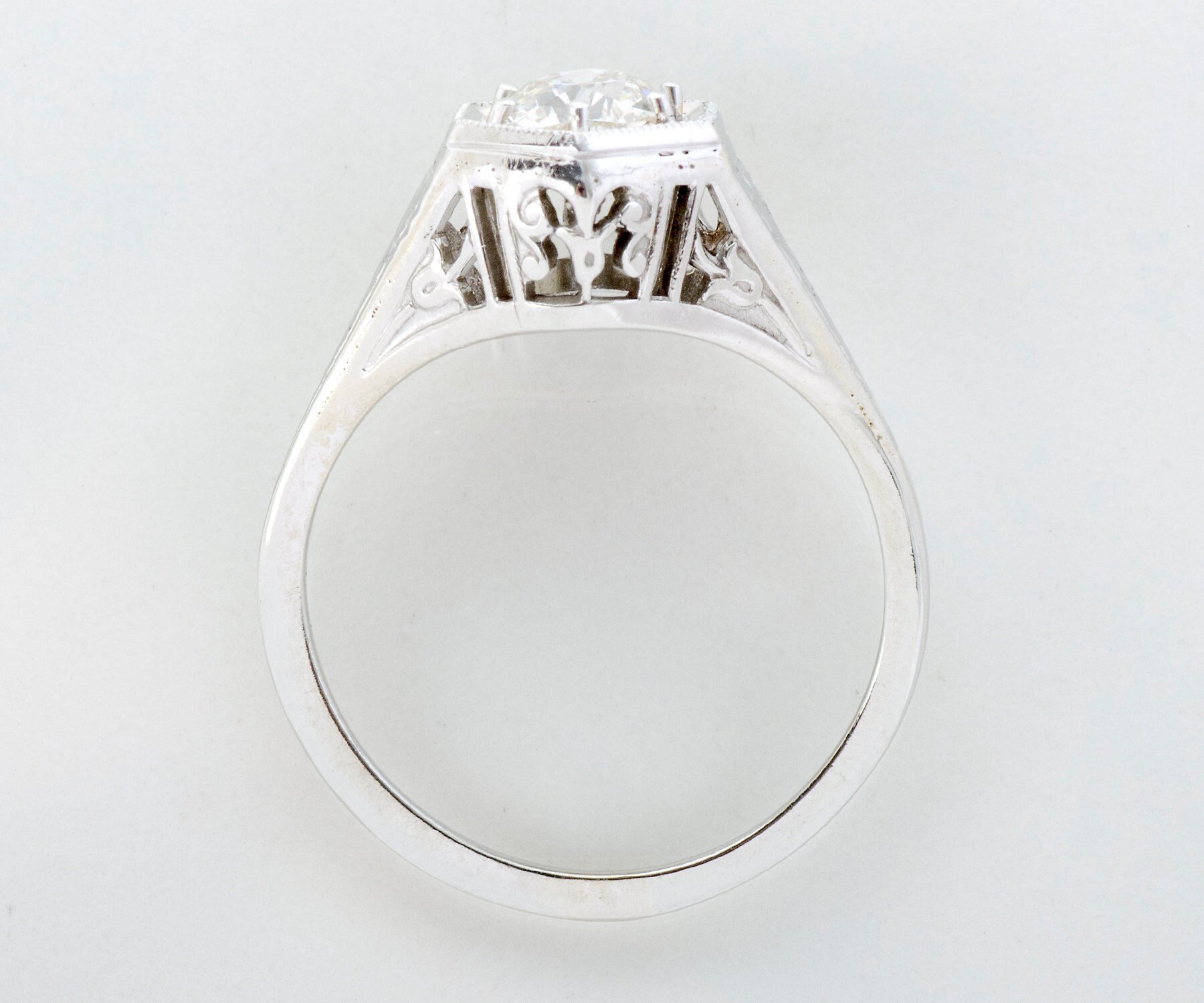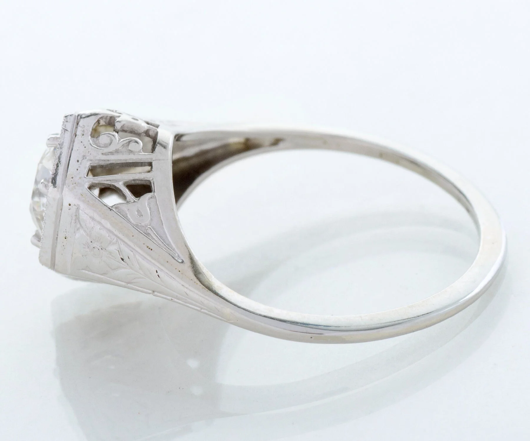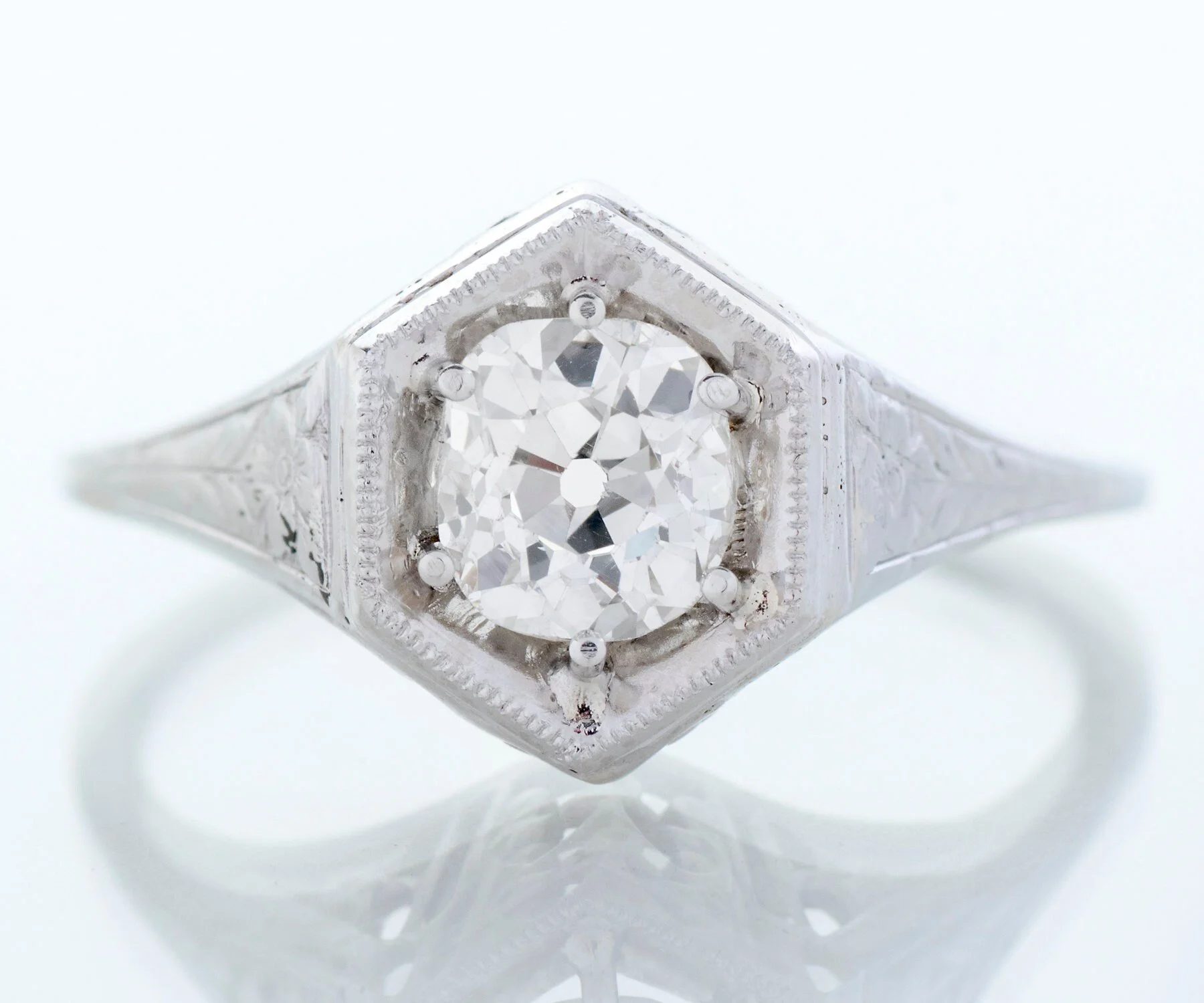 Antique Engagement Ring - Antique Art Deco 18k White Gold Mine Cut Diamond Engagement Ring 1920's 18k White Gold Mine Cut Diamond =.71ct VS1/H Ring Size 6.5 (sizable) Ring measures approximately 10.4mm at center. Back of band measures 1mm with a 1.5mm rise.