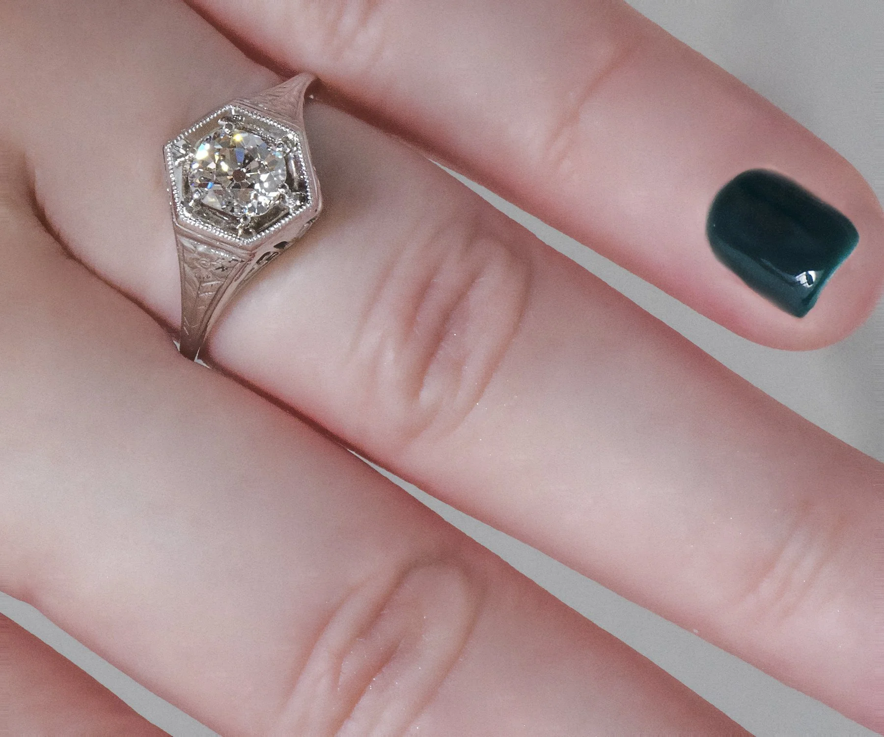 Cut-outs and nature motif engraving is well featured on this wonderful 18k white gold antique diamond engagement ring from the 1920's. A delightful mine-cut diamond sits within a six sided setting, set on the diagonal. The mine-cut diamond was hand cut with bulkier proportions and that had a purpose – so that the diamond would sparkle under candlelight. Eye-catching, but not too much, this beauty will pair well with a wedding band from any era.
