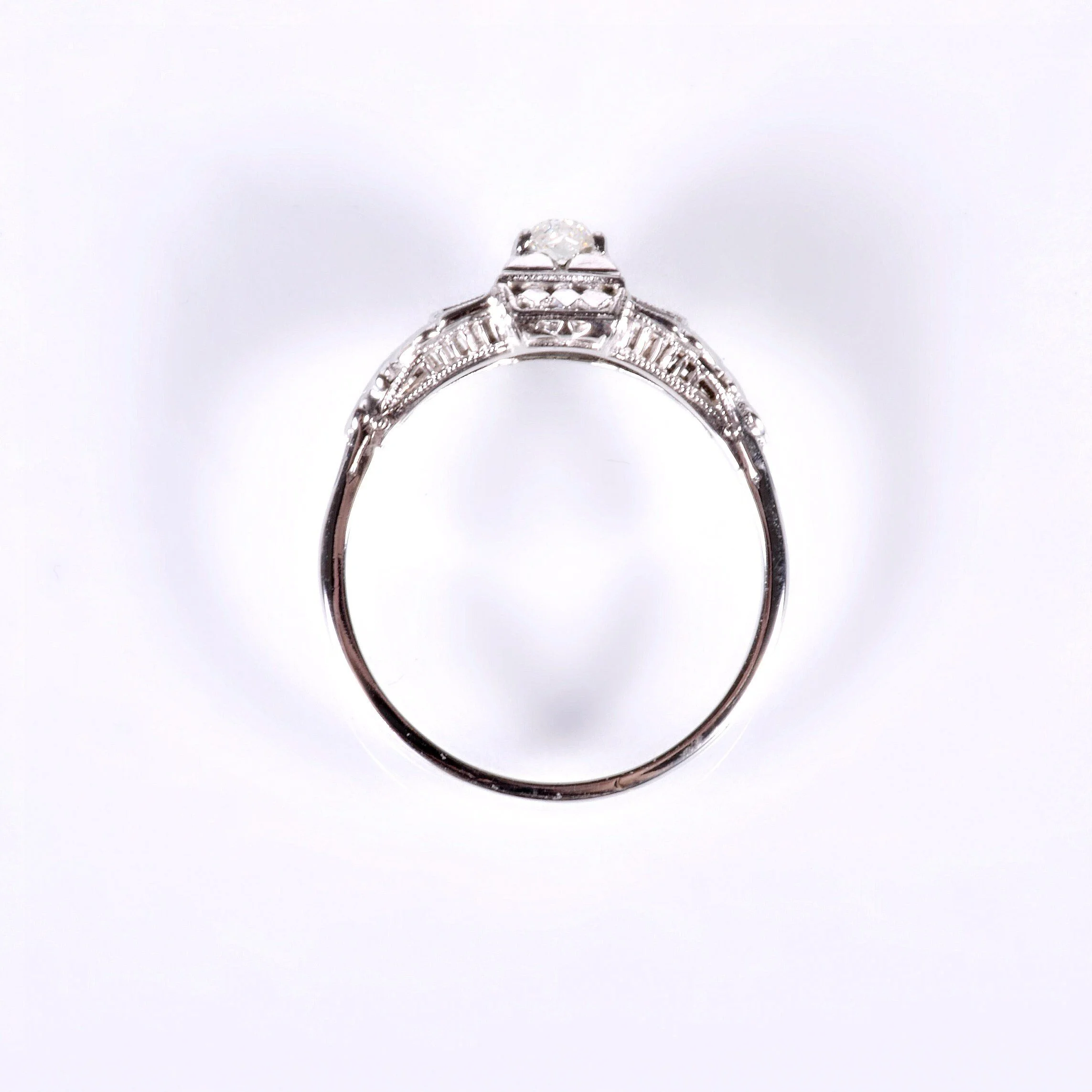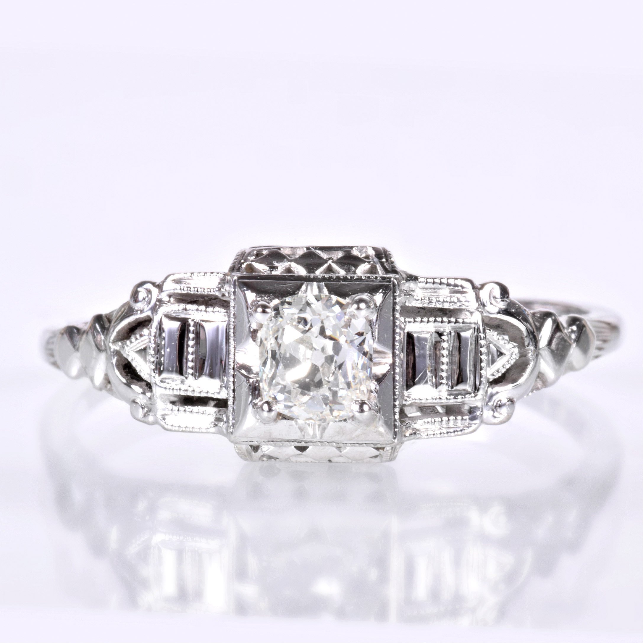 Antique Engagement Ring - Antique Art Deco 18k White Gold Mine Cut Diamond Engagement Ring Art Deco 18k White Gold Mine Cut Diamond =.34ct SI1/E Ring Size 9 (sizable) Ring measures approximately 7.6mm tall at center, back of band is 1.2mm wide.