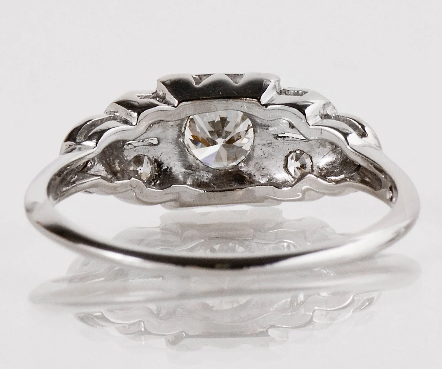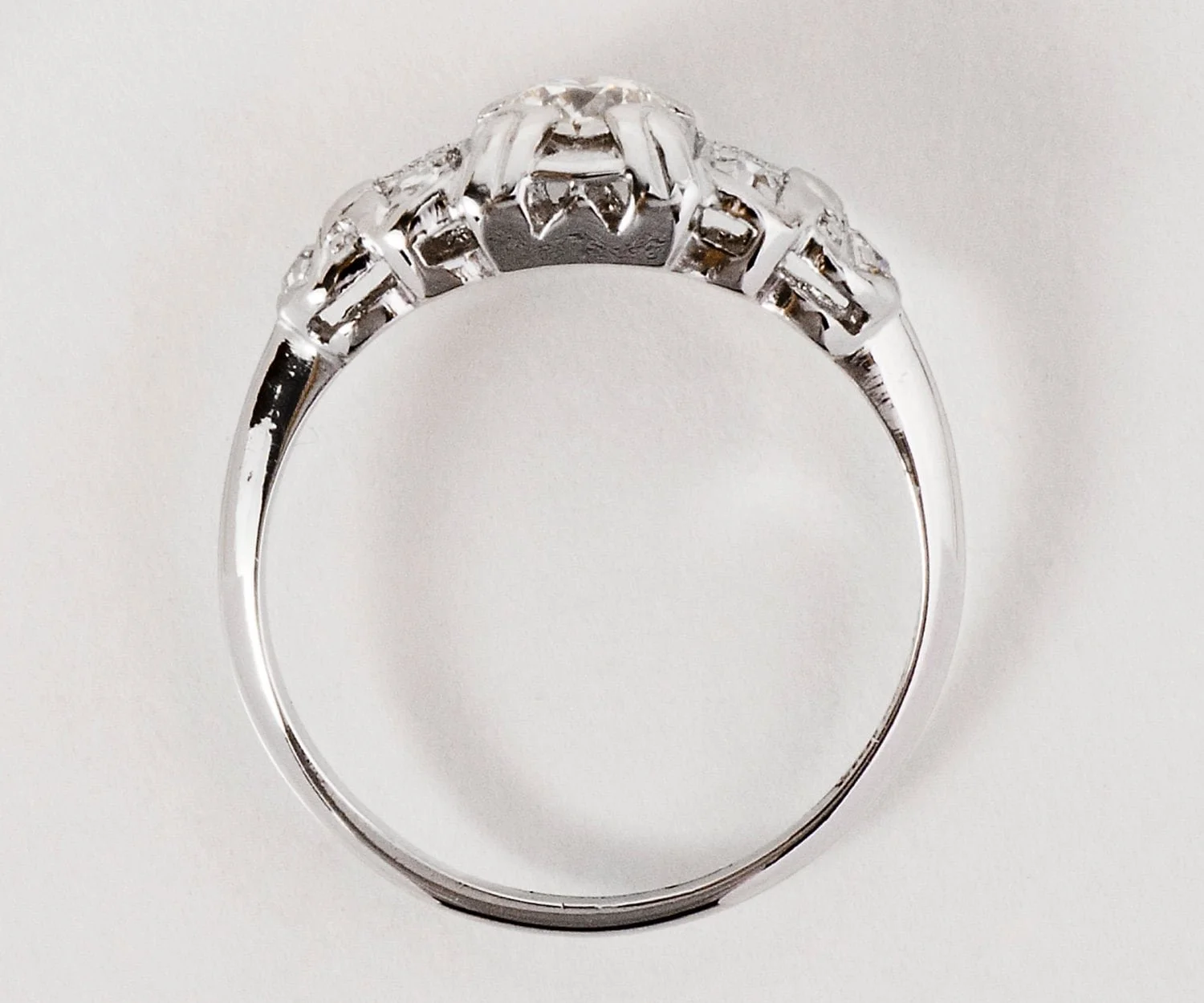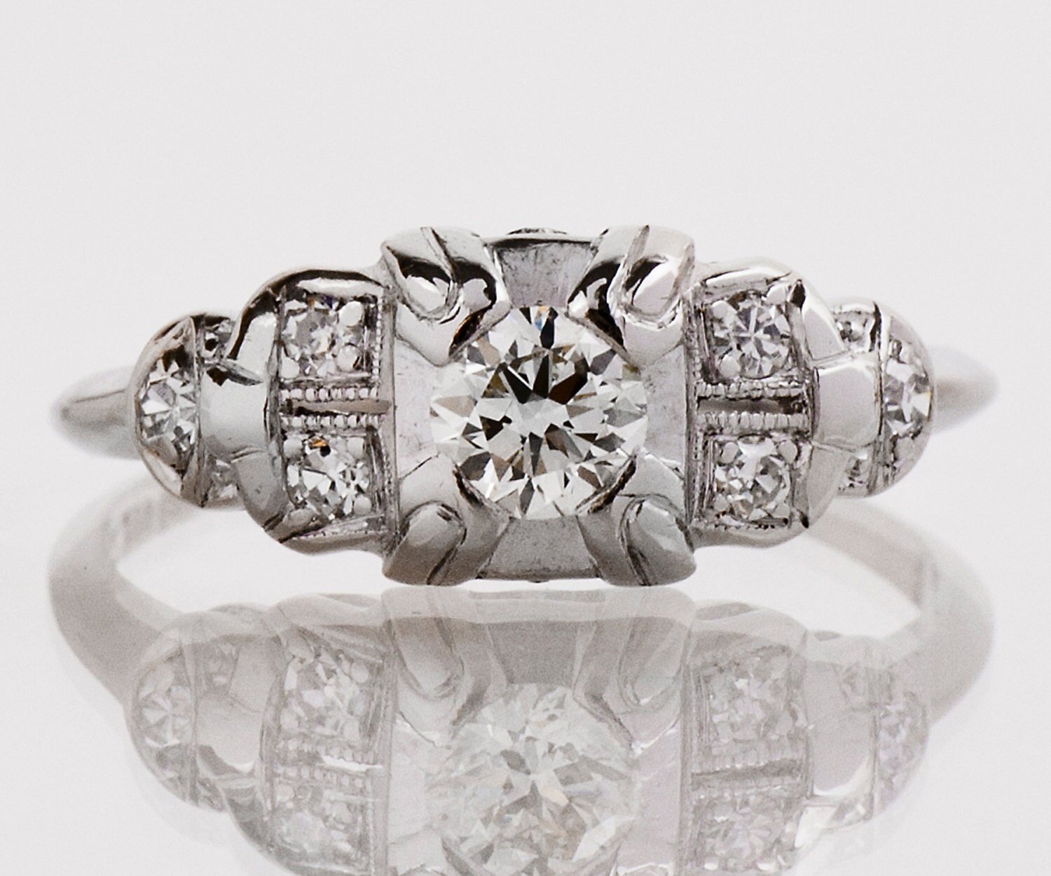 Antique Engagement Ring - Antique Art Deco 1930s Platinum Diamond Engagement Ring Platinum European Cut Center Diamond =.20ct VS1/K 6 Side Diamonds =.15ct VS2-SI1/G-J Ring Size 6-5/8 (ring is sizable) Ring measures approximately 7.2mm at center, band is 1.2mm.