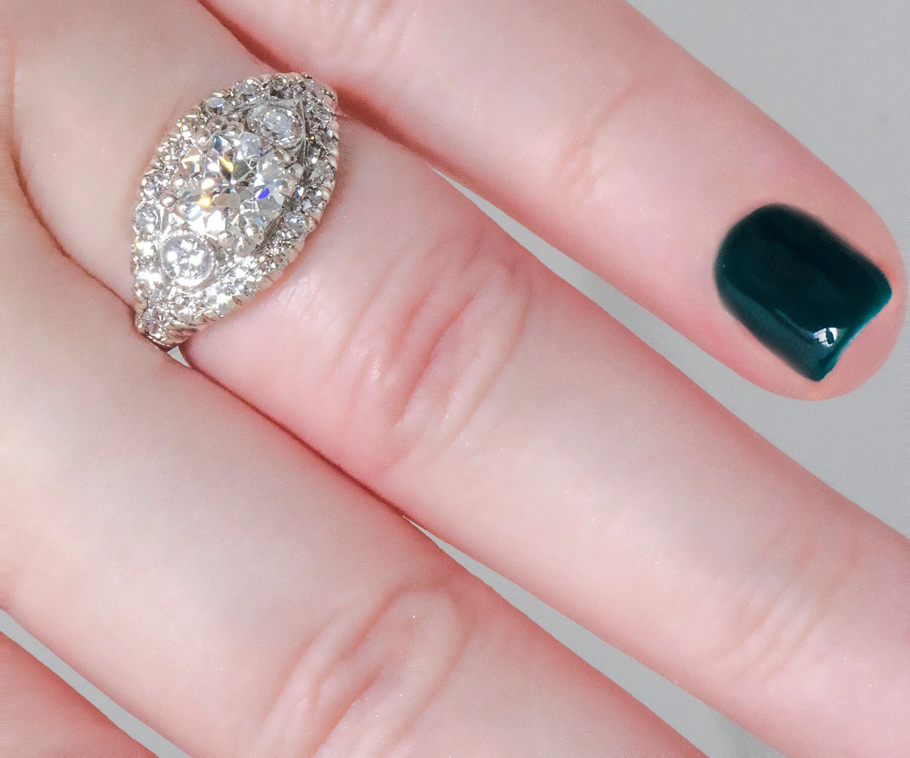 This Art Deco delight is ready for its second debut! In strong platinum, this beauty is filled to the brim with stunning European cut diamonds totaling 1.66 carats. This ring is dome shaped and can stand alone without an accompanying band. Run, don't walk to grab this one from the 1930's...she is truly remarkable!