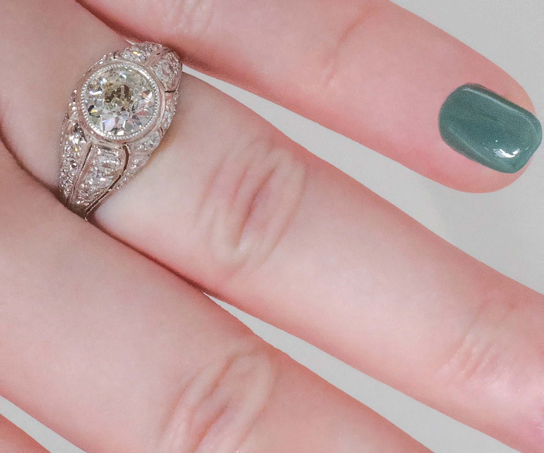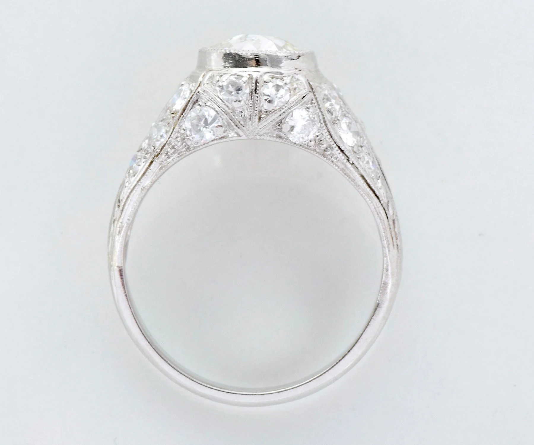 This delightful Art Deco platinum diamond engagement ring is simply divine! A glamorous dome shape with intricate detailing holds a fabulous European cut diamond snugly within a bezel. Encircling the center diamond are a combination of European and single cut sparkling diamonds totaling over a carat. No need for a wedding band with this ring, but you can certainly pair it up with one of our many gorgeous antique bands if you like.
