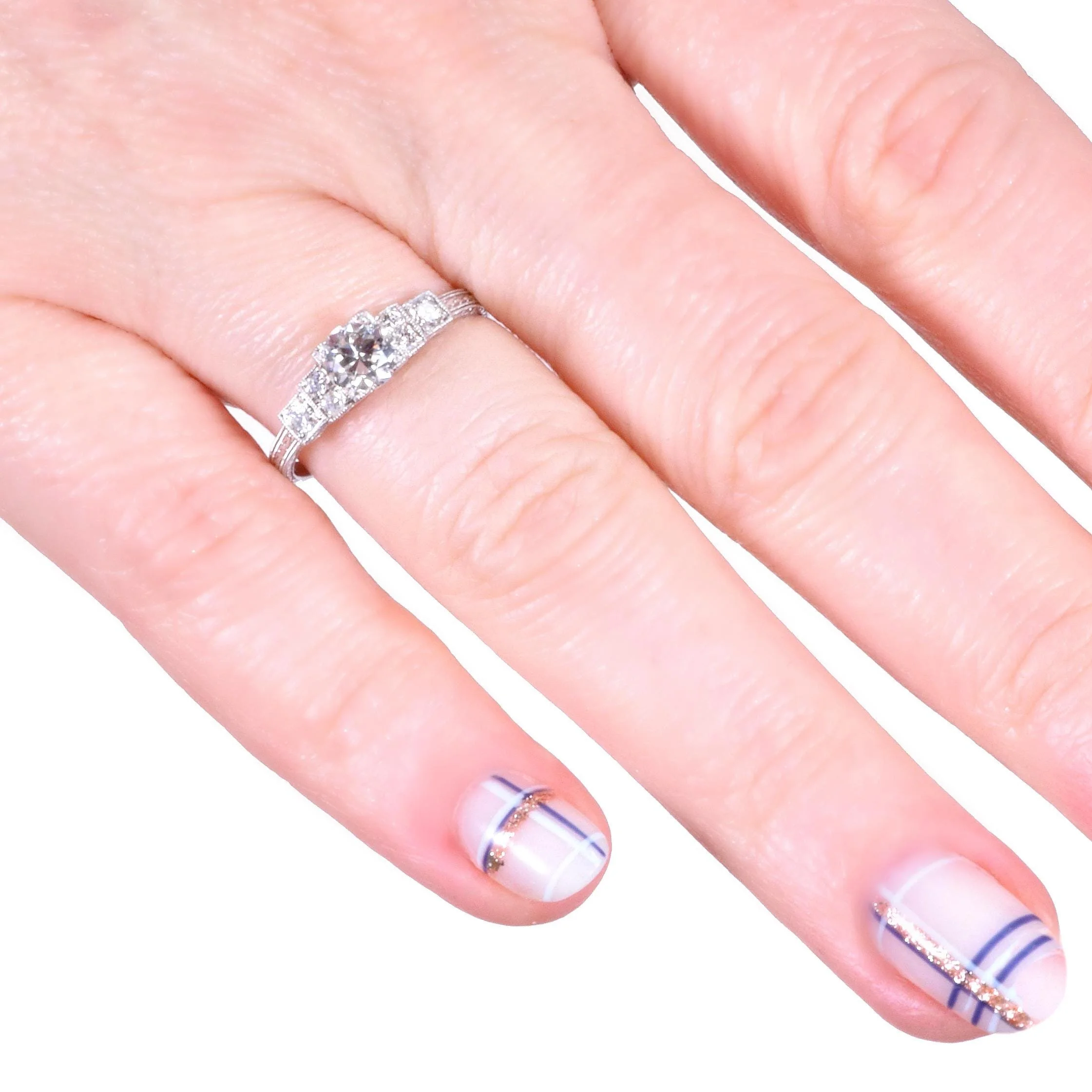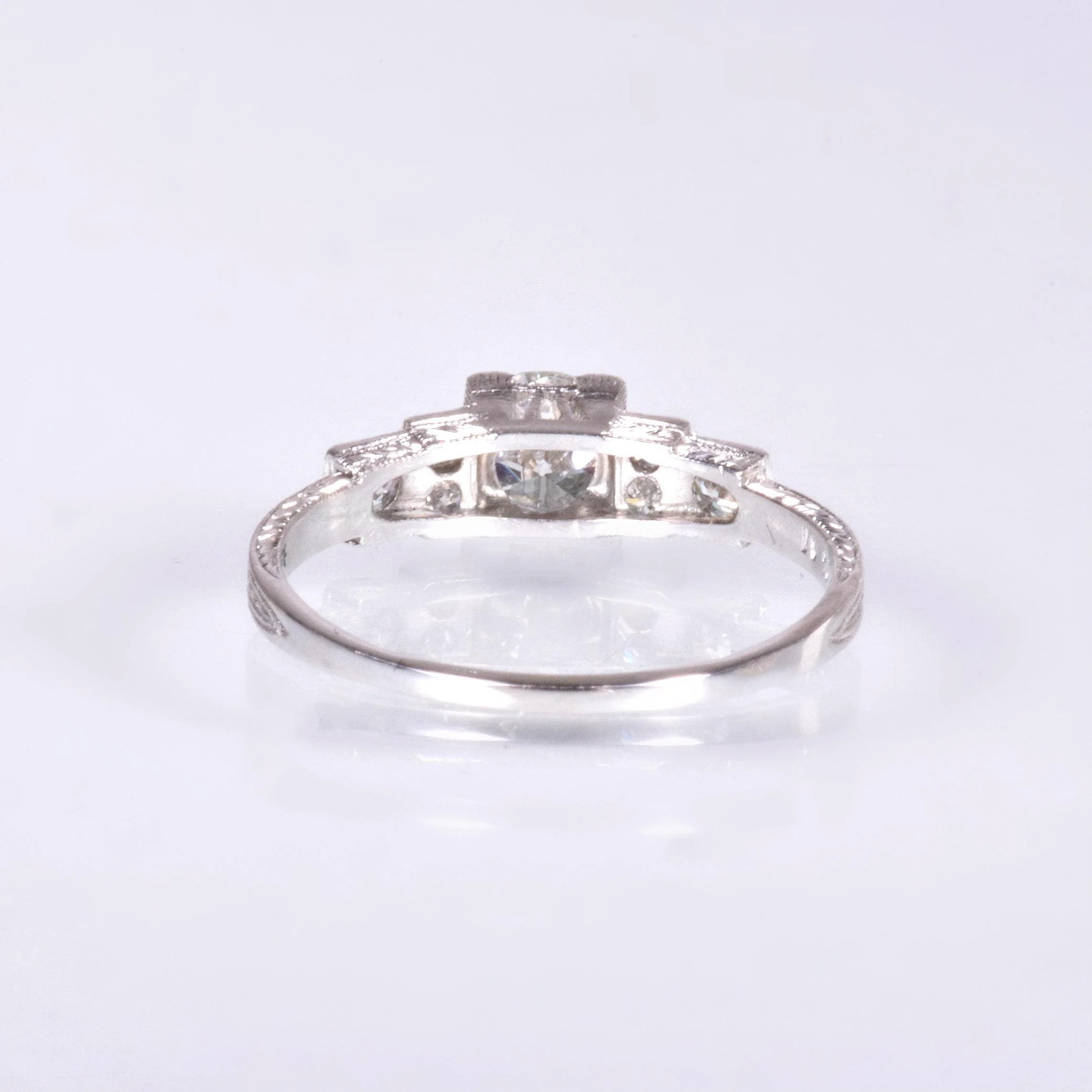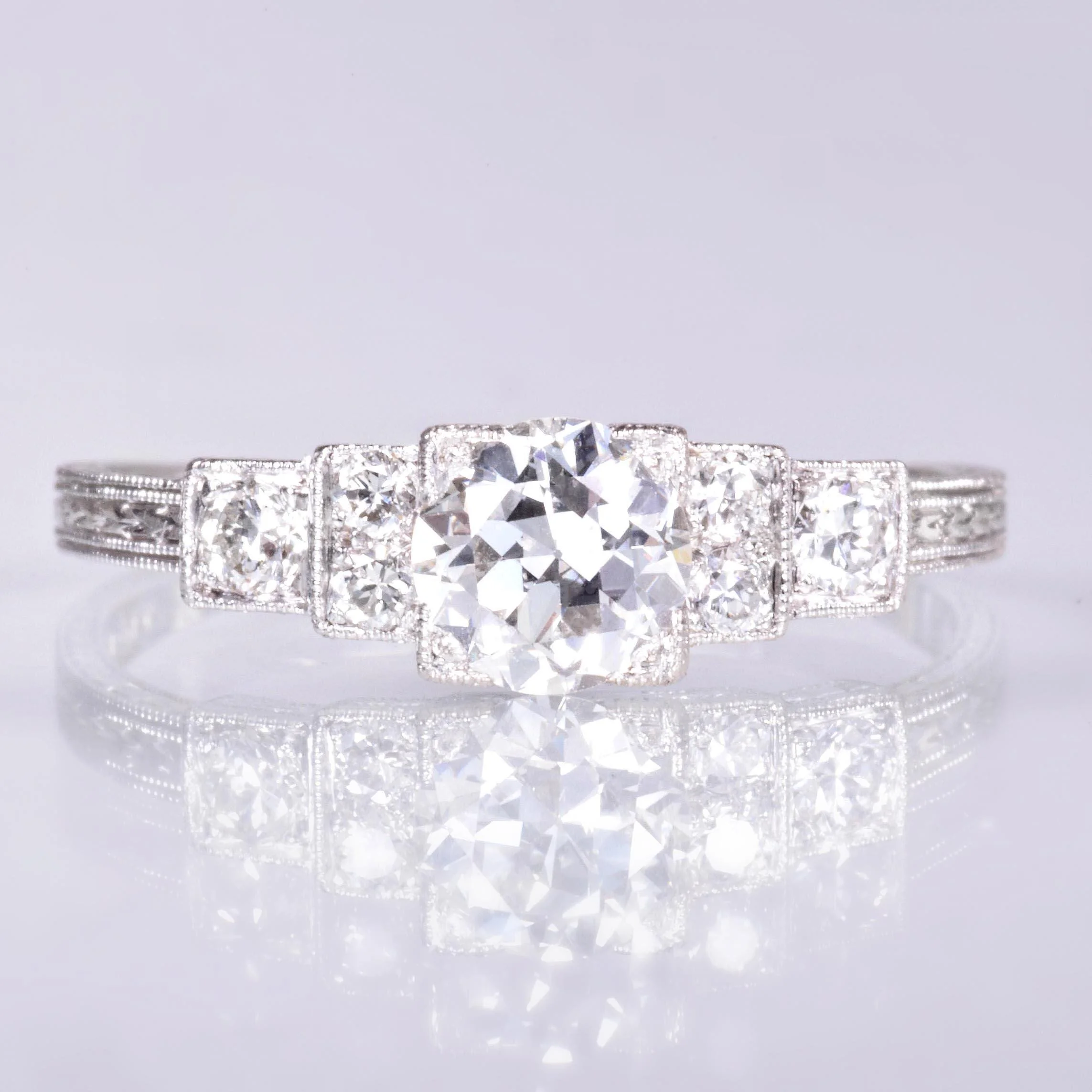 Antique Engagement Ring - Antique Art Deco Platinum Diamond Engagement Ring Art Deco Circa 1920's Platinum Center European Cut Diamond =.51ct VS1/F 5 European Cut Side Diamonds =.24ct SI1/G-H Ring Size 6.5 (sizable) Ring measures approximately 5.2mm wide at center, back of band is 1.2mm wide.