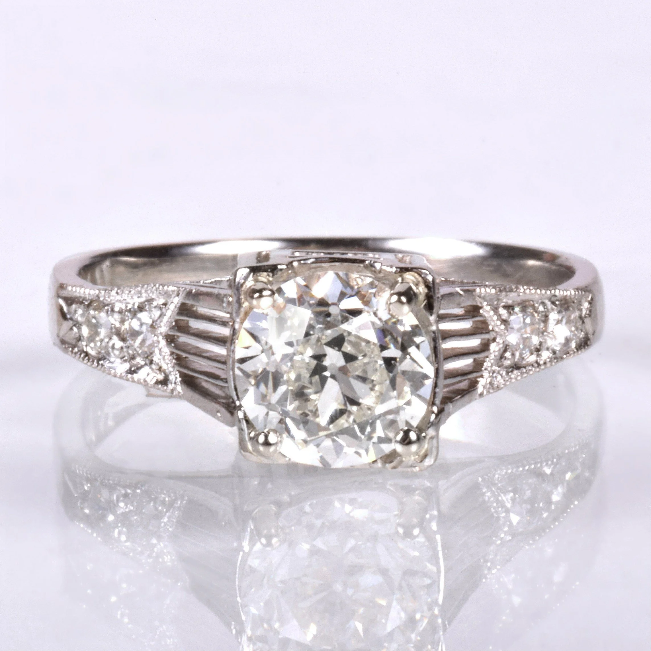 Proudly we offer this smashing platinum Art Deco stunner of a diamond engagement ring! Feast your eyes on the fine lines featured in the setting. A ravishing European cut diamond of over a carat dazzles from the center of this setting with additional diamonds illuminating the shoulders.