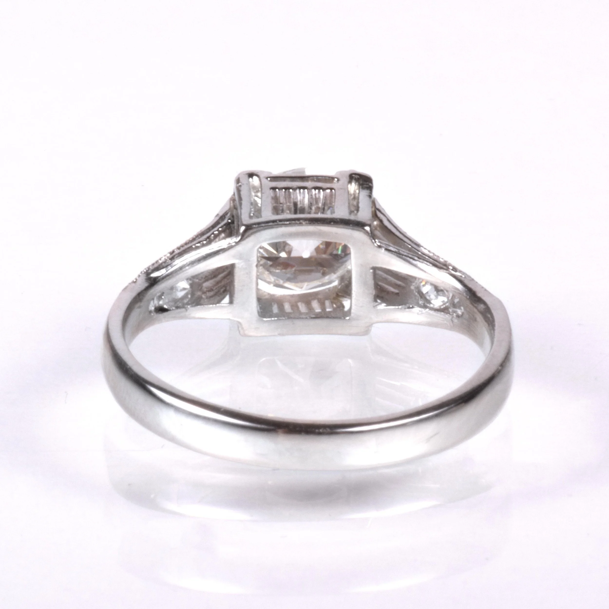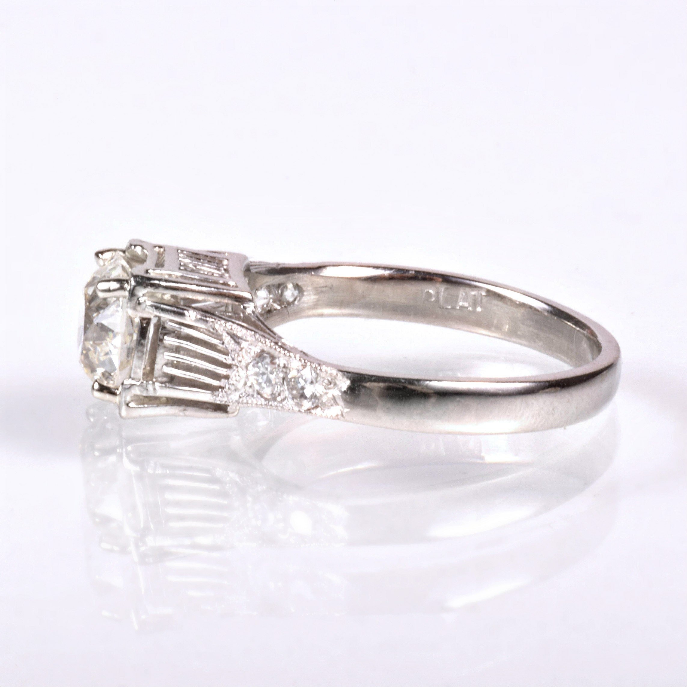 Antique Engagement Ring - Antique Art Deco Platinum Diamond Engagement Ring Art Deco Platinum European Cut Center Diamond =1.10ct SI1/J (GIA Certified) 4 European & Single Cut Diamonds =.16ct VS2-SI1/H-I Ring Size 5.5 (sizable) Ring measures approximately 6.8mm at center, back of band is 2.4mm wide.