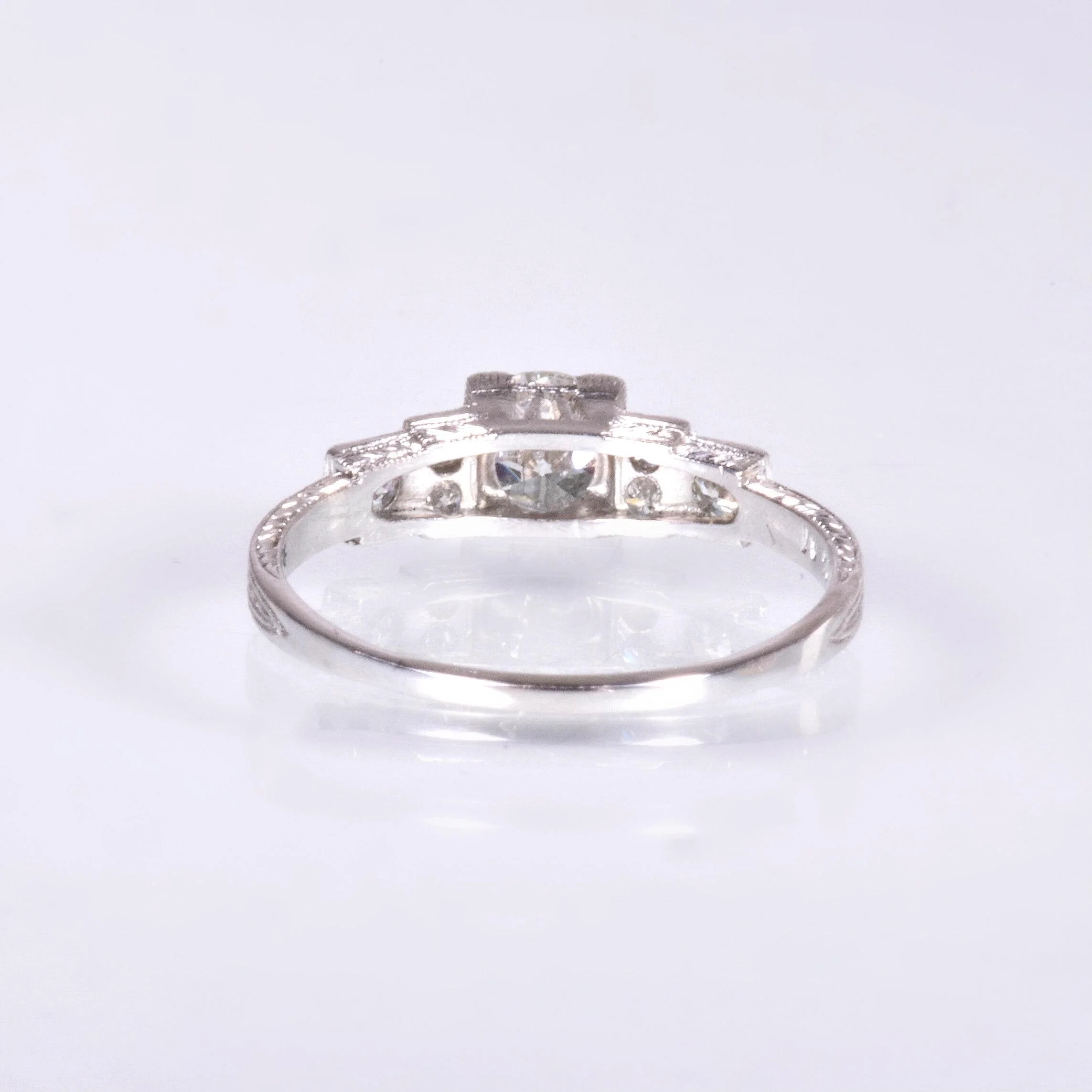 Antique Engagement Ring - Antique Art Deco Platinum Diamond Engagement Ring Art Deco Circa 1920's Platinum Center European Cut Diamond =.51ct VS1/F 5 European Cut Side Diamonds =.24ct SI1/G-H Ring Size 6.5 (sizable) Ring measures approximately 5.2mm wide at center, back of band is 1.2mm wide.