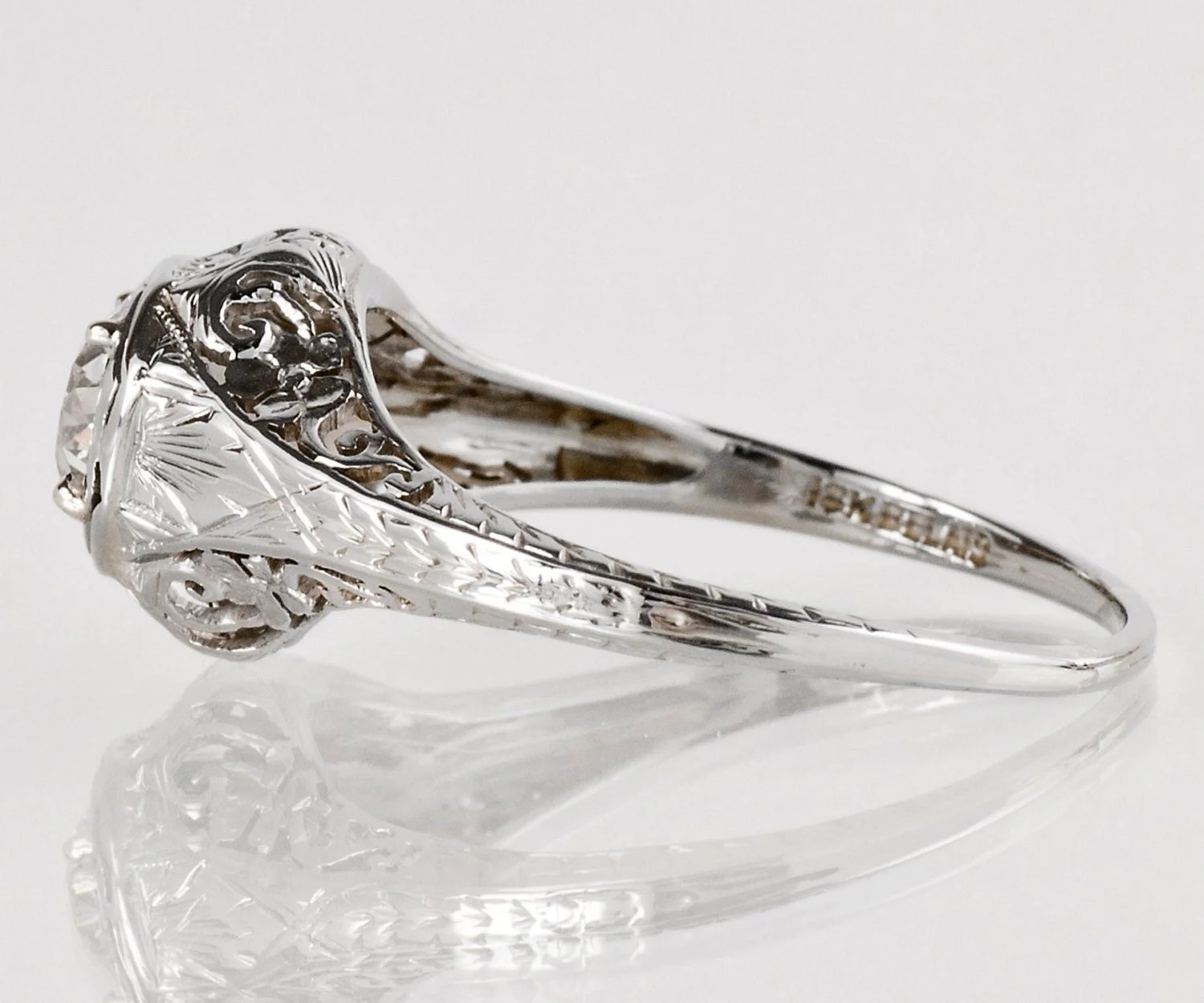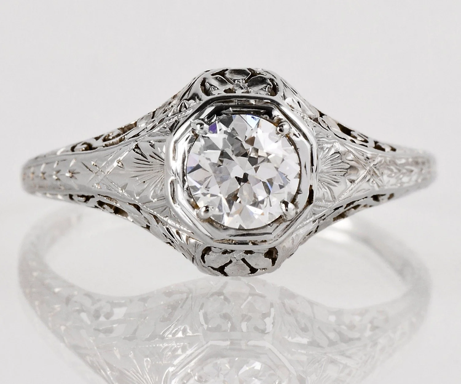 This stunning antique engagement ring has the most romantic floral filigree and etching along the band. For the bride looking for something completely unique and feminine, this ring would be a wonderful choice.