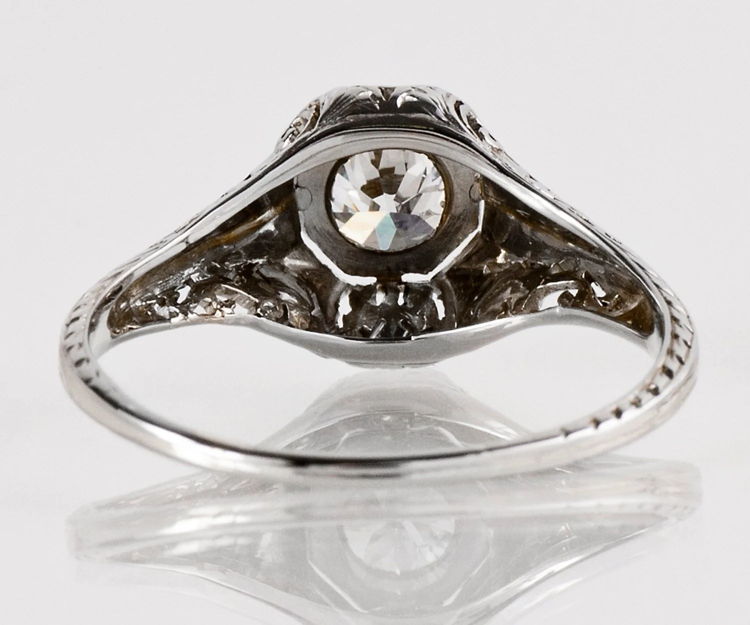 Antique Art Nouveau 18k White Gold Filigree Diamond Engagement Ring 18k White Gold Filigree European Cut Diamond =.66ct VS2/G Ring Size 8.5 (ring is sizable) Ring measures approximately 10.3mm at center, band is 1.2mm.