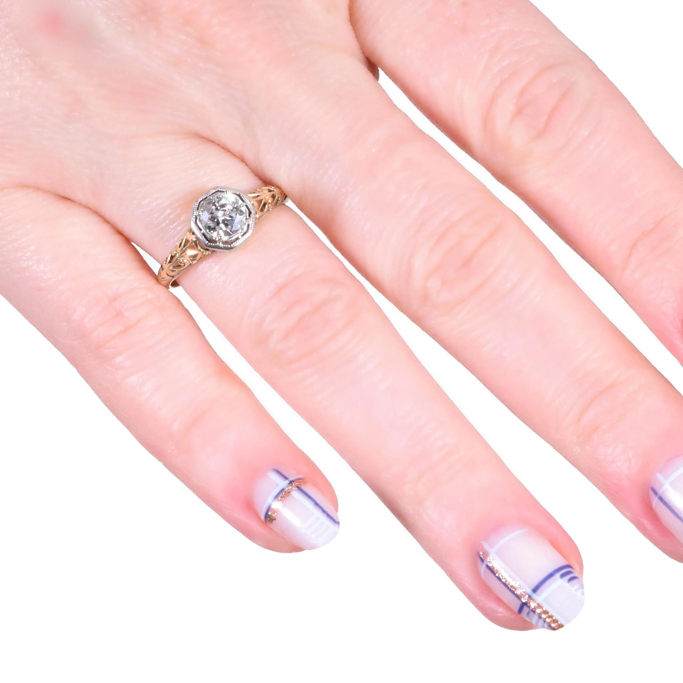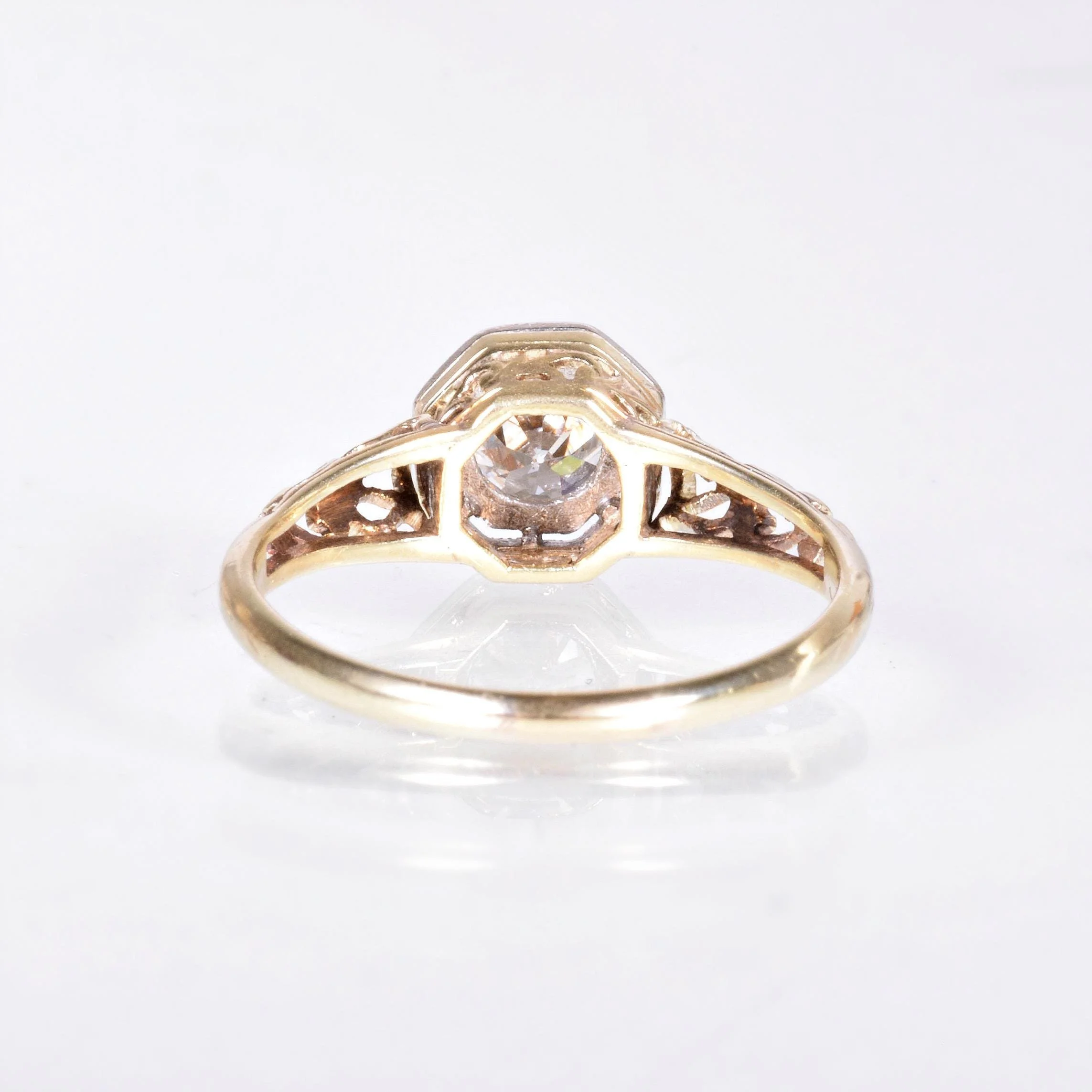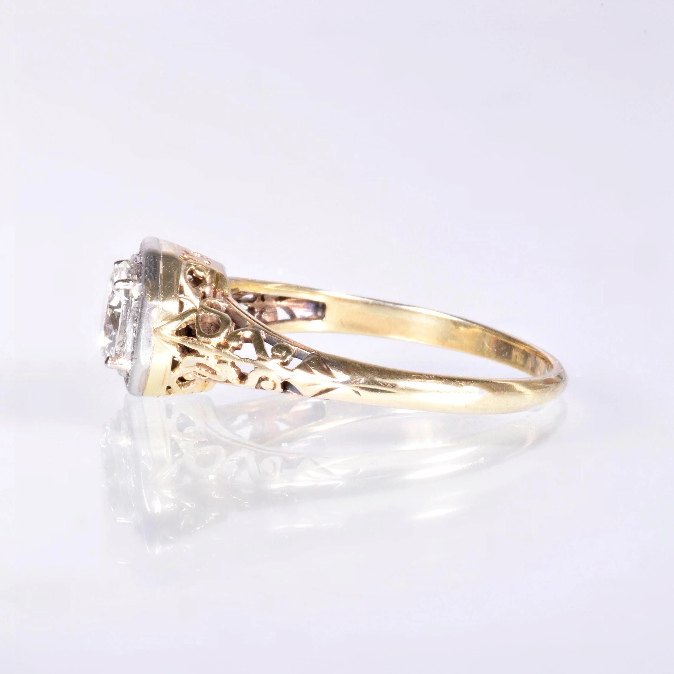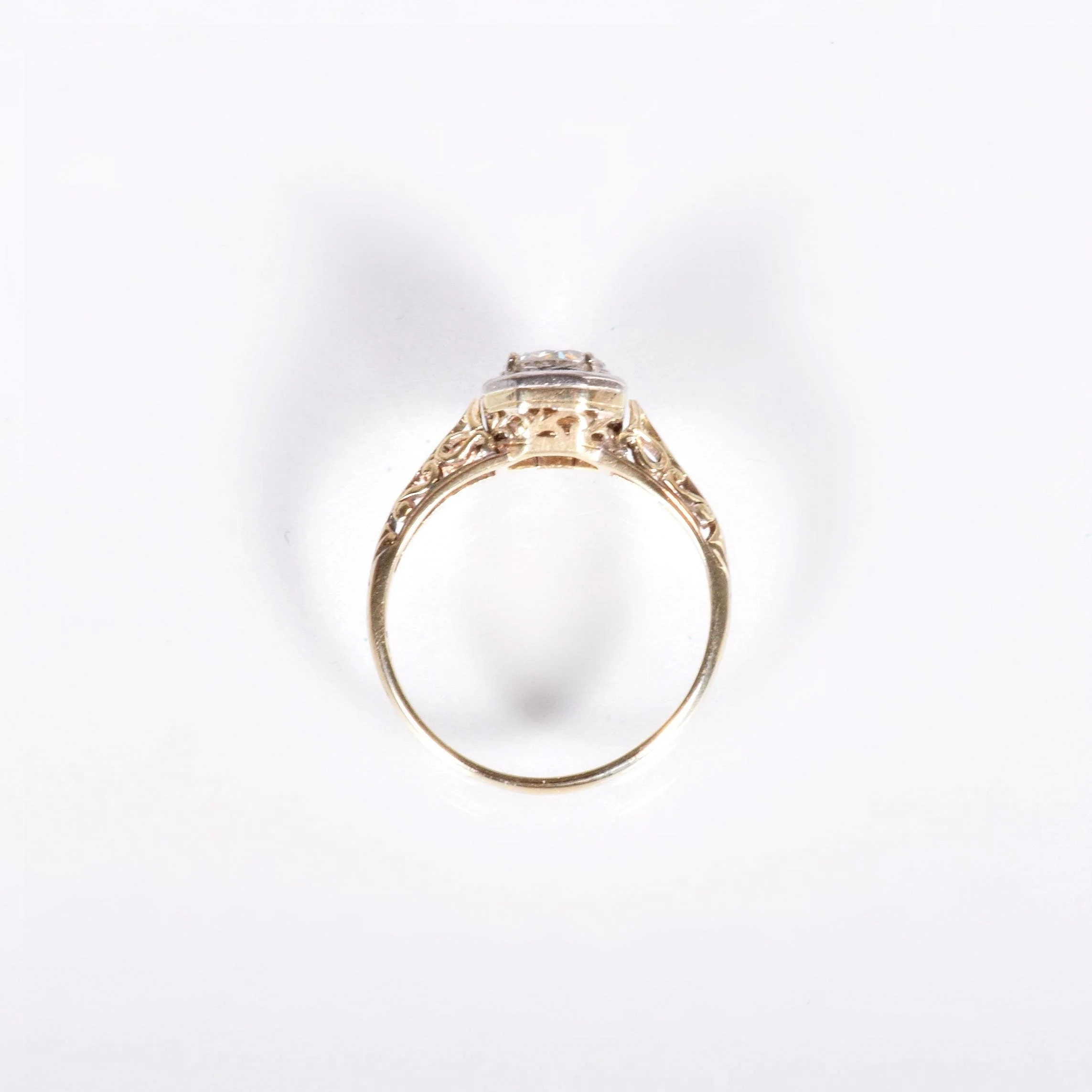 Elegance. Our two-tone 14k yellow and white gold antique diamond engagement ring brings just that. A simple solitaire made not so simple with the stylized filigree work with fine metal cut outs. A sparkling engraved prong setting showcases this European cut diamond at the center in the most charming way. The lovely and soft yellow hue of gold on this piece has the very slightest shade of greenish yellow gold to it. Charming, unique, and timeless.