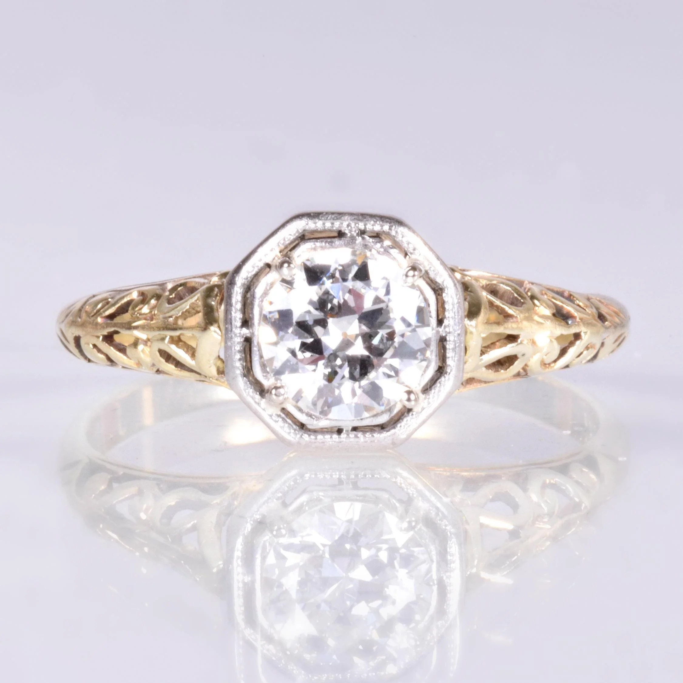 Elegance. Our two-tone 14k yellow and white gold antique diamond engagement ring brings just that. A simple solitaire made not so simple with the stylized filigree work with fine metal cut outs. A sparkling engraved prong setting showcases this European cut diamond at the center in the most charming way. The lovely and soft yellow hue of gold on this piece has the very slightest shade of greenish yellow gold to it. Charming, unique, and timeless.
