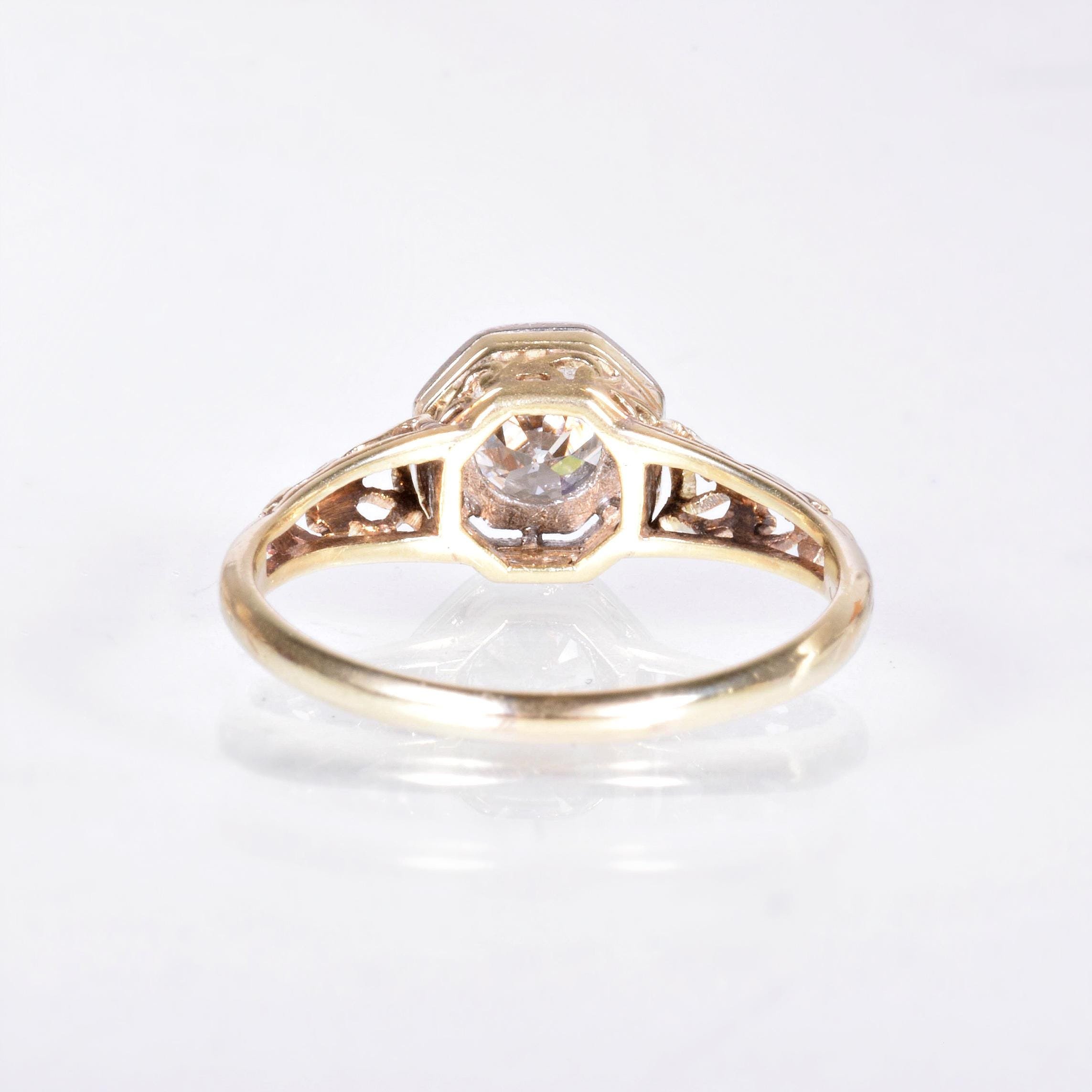 Antique Engagement Ring - Antique Arts & Crafts Era 14k Two-Tone Filigree Diamond Engagement Ring Circa 1910's 14k Yellow & White Gold European Cut Diamond =.60ct SI1/H Ring Size 7 (sizable) Ring measures approximately 7.9mm wide at center, back of band is 1.7mm wide.