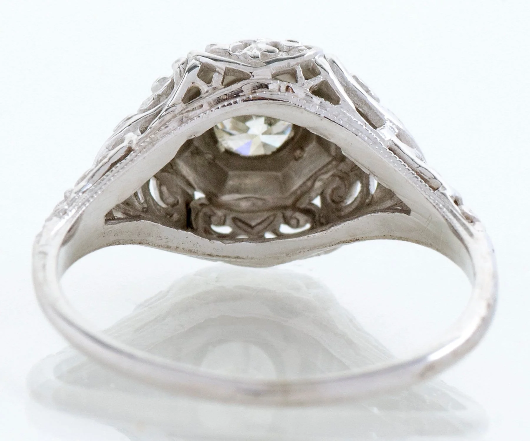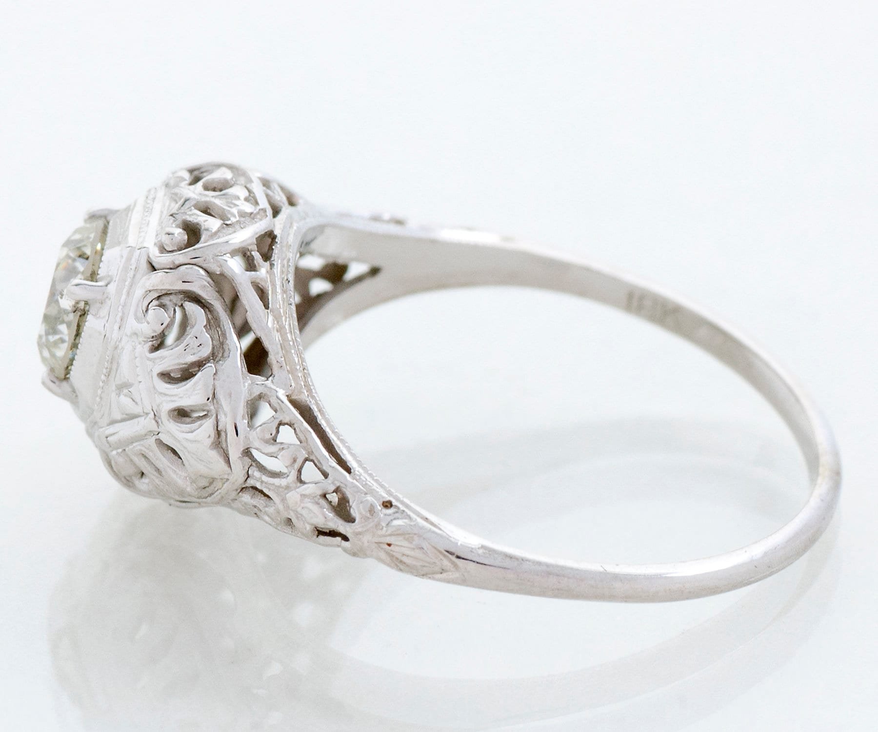 This "looker" is quite the substantial antique Arts and Crafts piece! Heavily filigreed all around, in 18k bright white gold. A beautiful transitional cut diamond at just over 1/2 carat sits prettily in the center of it all within an octagonal setting. The transitional cut diamond is a direct descendent of the old European cut diamond and sort of bridges the gap between those and the modern brilliant cut that we see today. Very eye-catching and can be worn with or without a wedding band.