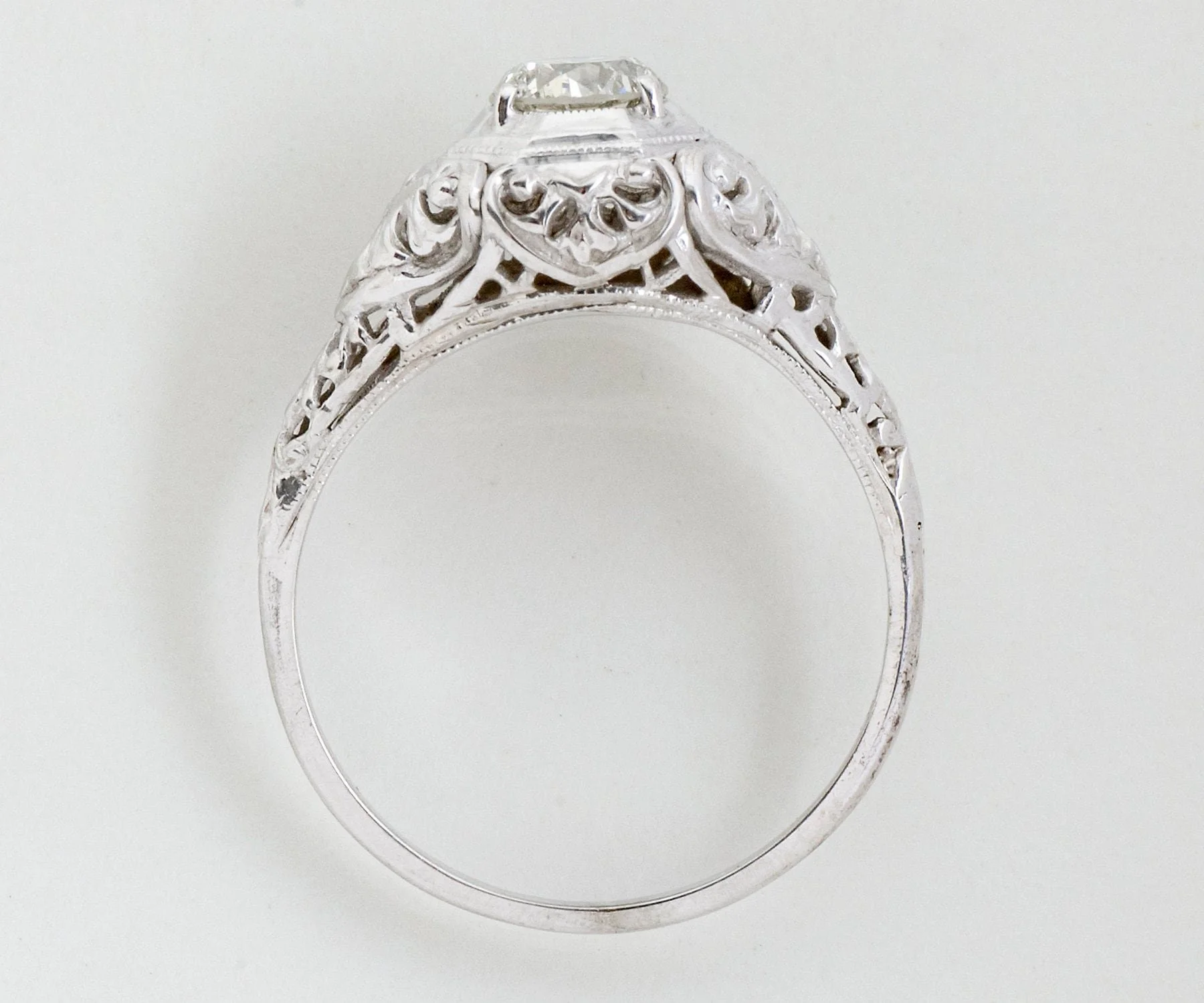This "looker" is quite the substantial antique Arts and Crafts piece! Heavily filigreed all around, in 18k bright white gold. A beautiful transitional cut diamond at just over 1/2 carat sits prettily in the center of it all within an octagonal setting. The transitional cut diamond is a direct descendent of the old European cut diamond and sort of bridges the gap between those and the modern brilliant cut that we see today. Very eye-catching and can be worn with or without a wedding band.
