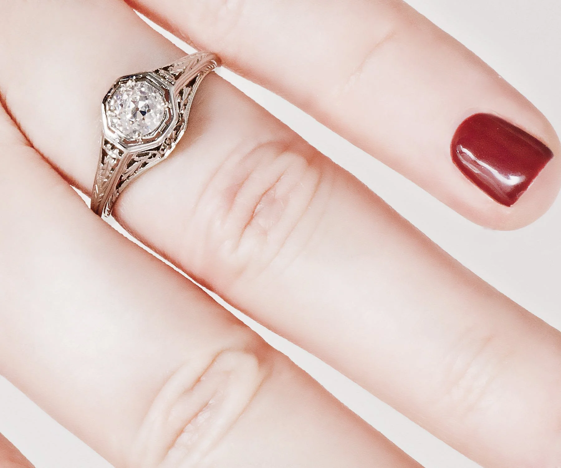 All snuggled in the center of this very artistic 18 k white gold Arts and Crafts Movement diamond engagement ring is a luscious European cut diamond at well over 1/2 carat. A very feminine design, any bride will be a lucky lady to call this antique treasure her own.