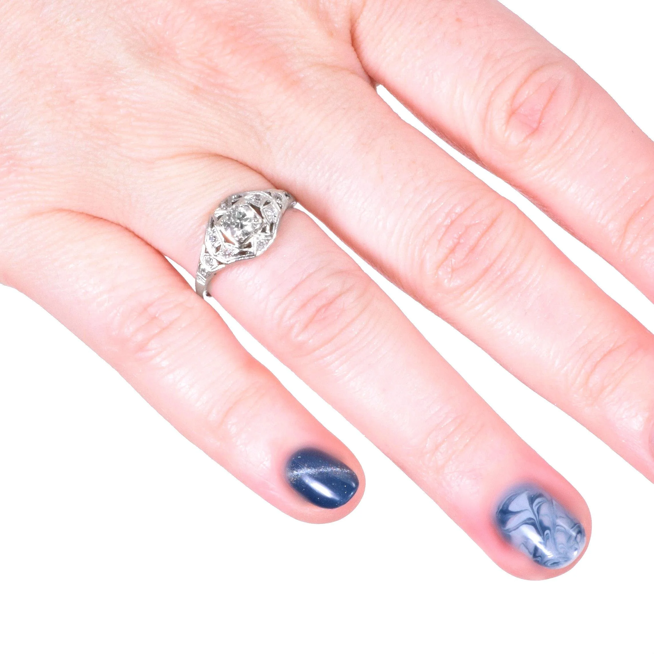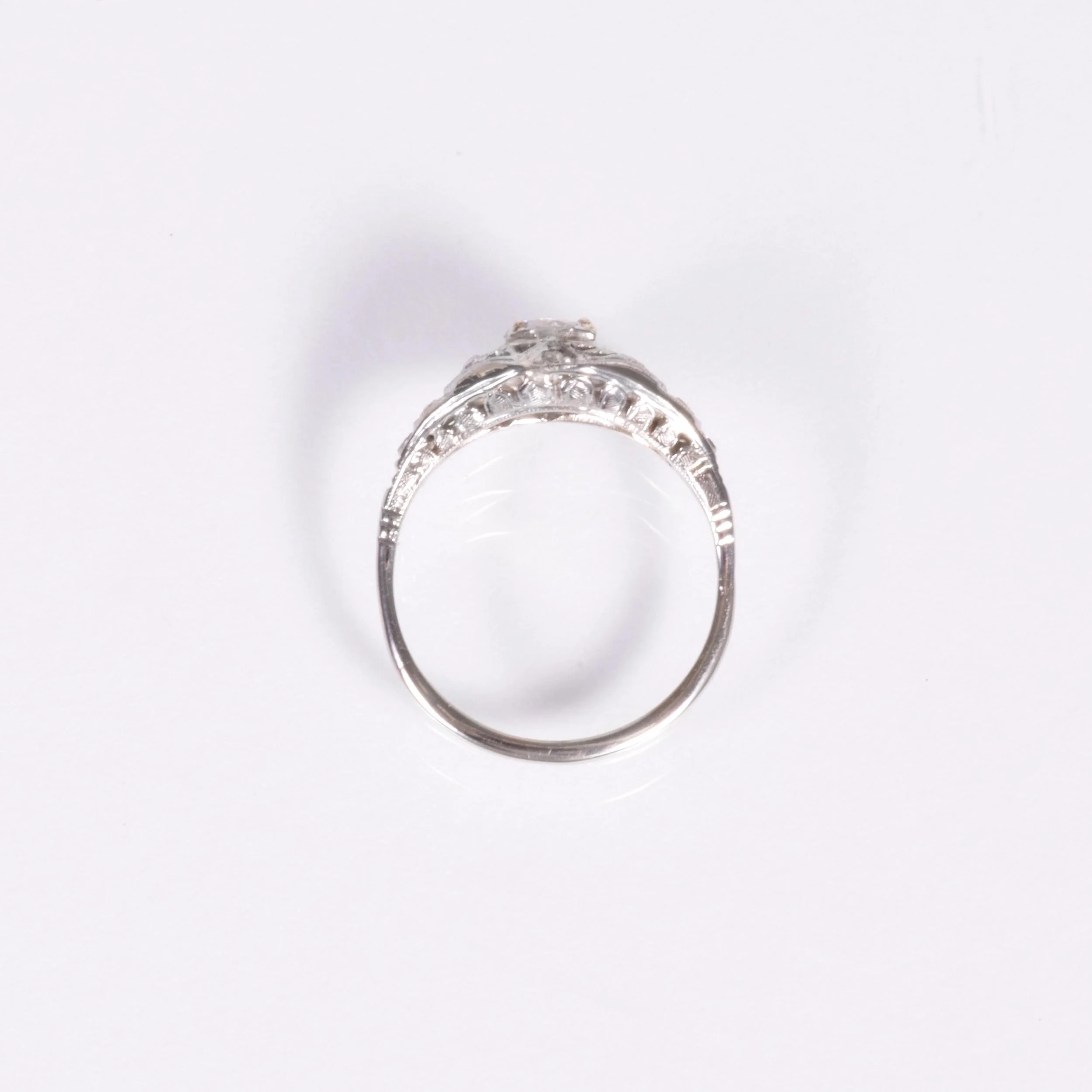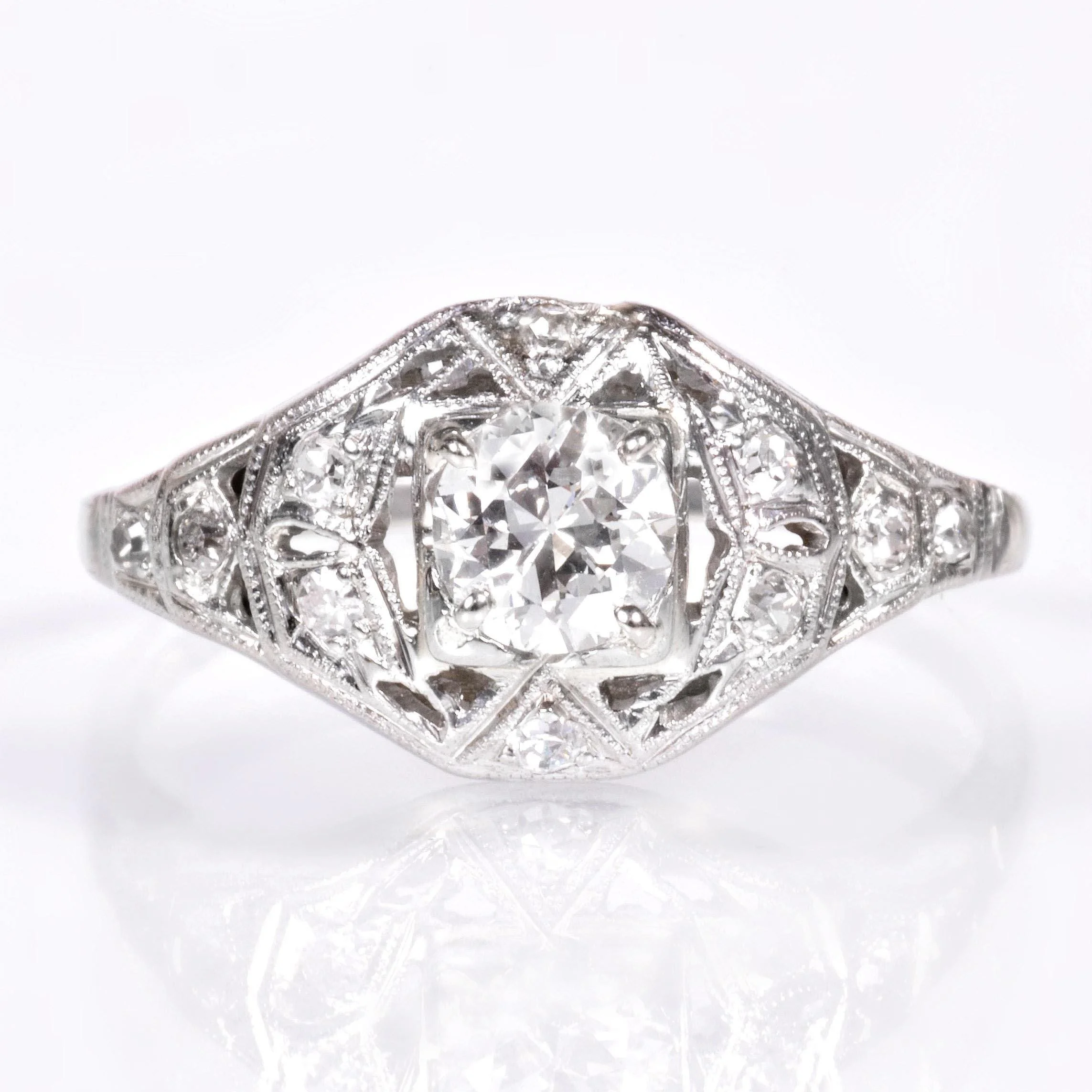 Antique Engagement Ring - Antique Circa 1920's 18k White Gold Diamond Engagement Ring 18k White Gold European Cut Center Diamond =.38ct VS1/H 10 Single Cut Side Diamonds =.15ct VS-SI/G-J Ring Size 6.75 (sizable) Ring measures approximately 9.2mm wide at center, back of band is 1.3mm wide.