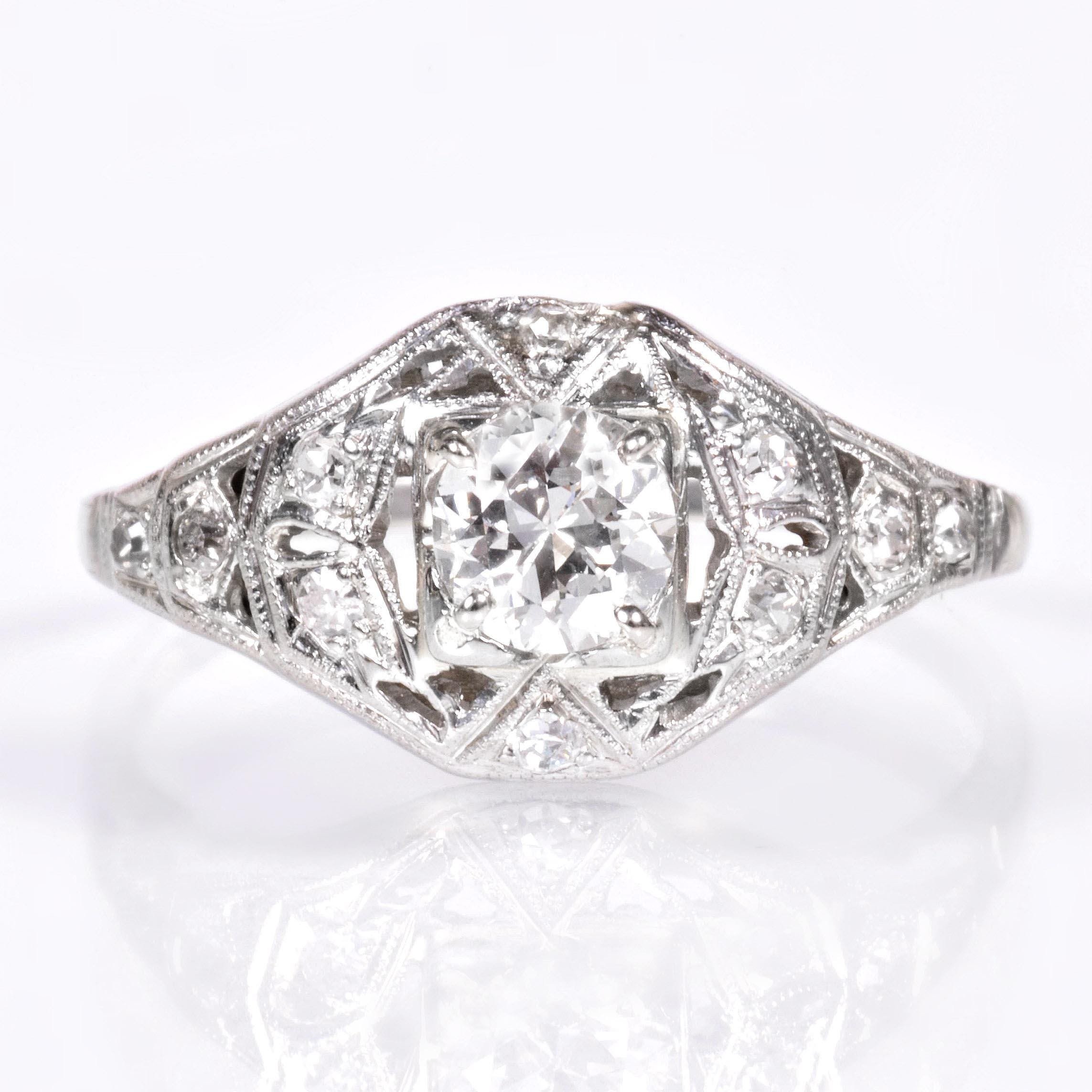 So much shimmer! Our beautiful Art Deco diamond ring can serve easily as engagement or a right hand ring. Crafted in bright 18k white gold, the elegant beauty is frosted with icy white European and single cut diamonds throughout, which gives so much appeal. If you've been looking for a unique, sparkling one of a kind antique ring, this one is for you!