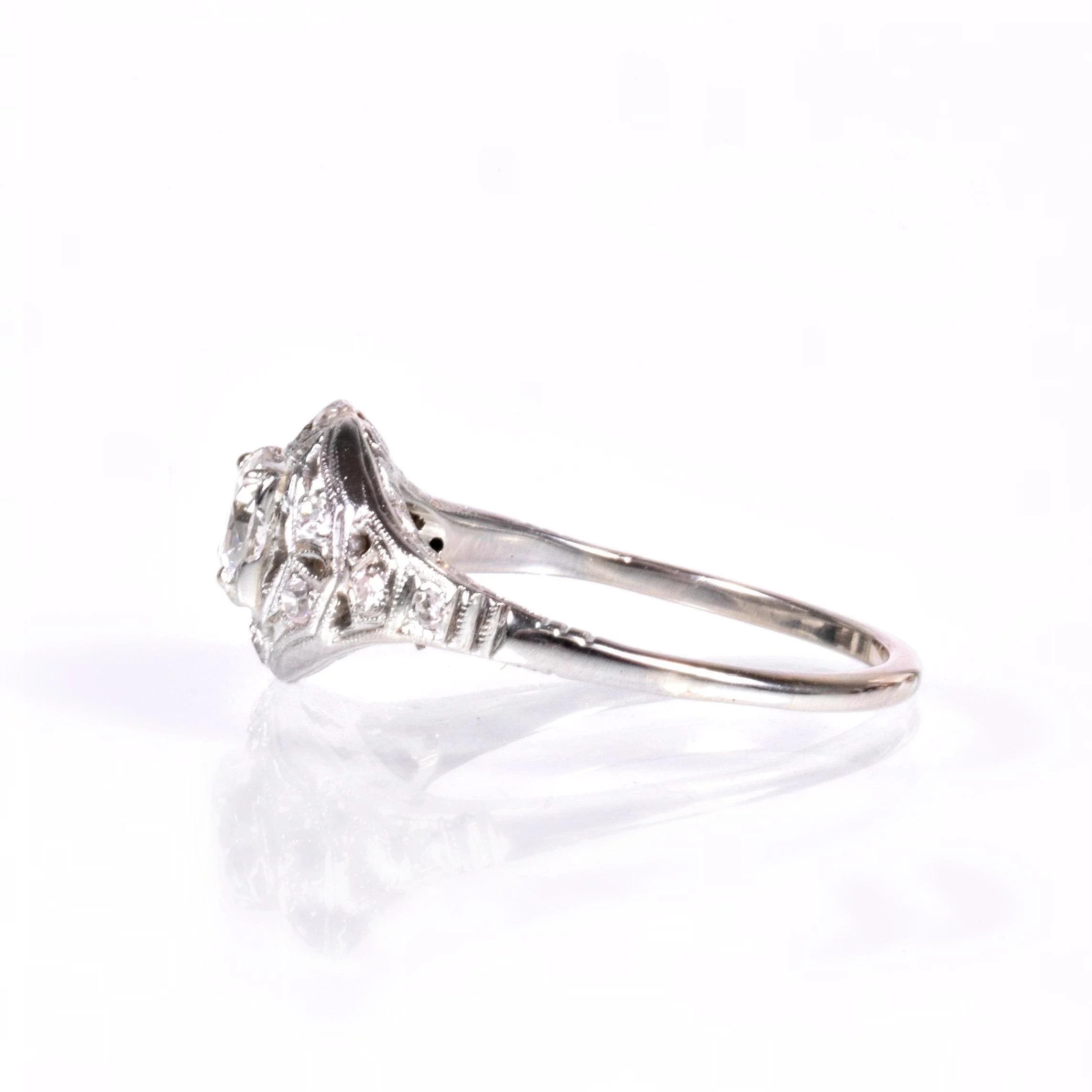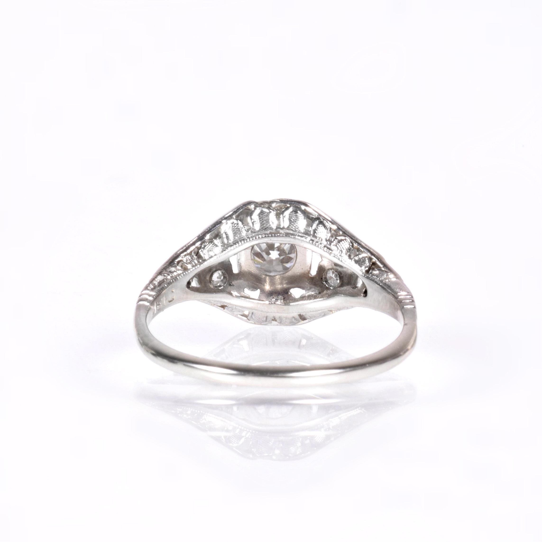Antique Engagement Ring - Antique Circa 1920's 18k White Gold Diamond Engagement Ring 18k White Gold European Cut Center Diamond =.38ct VS1/H 10 Single Cut Side Diamonds =.15ct VS-SI/G-J Ring Size 6.75 (sizable) Ring measures approximately 9.2mm wide at center, back of band is 1.3mm wide.