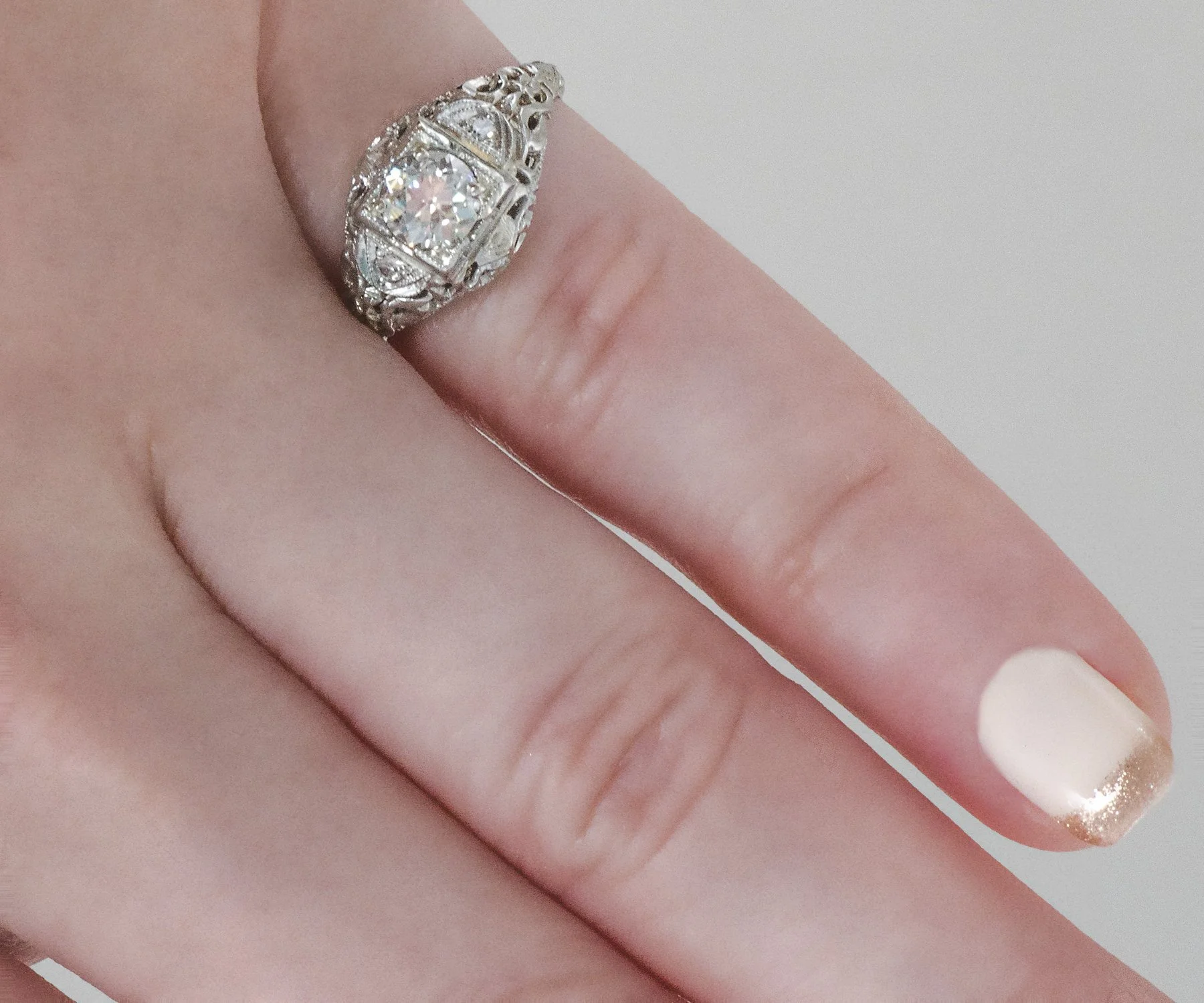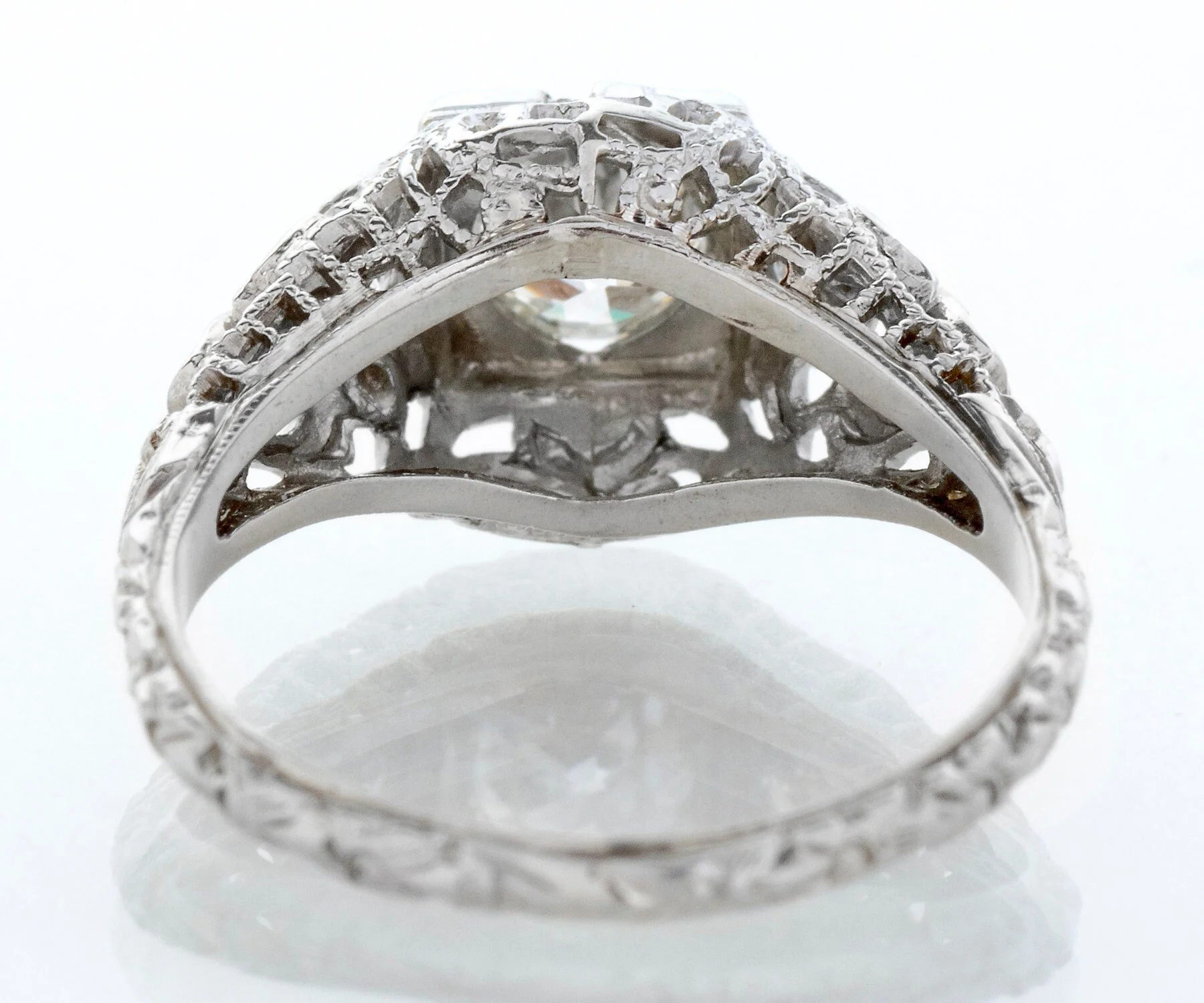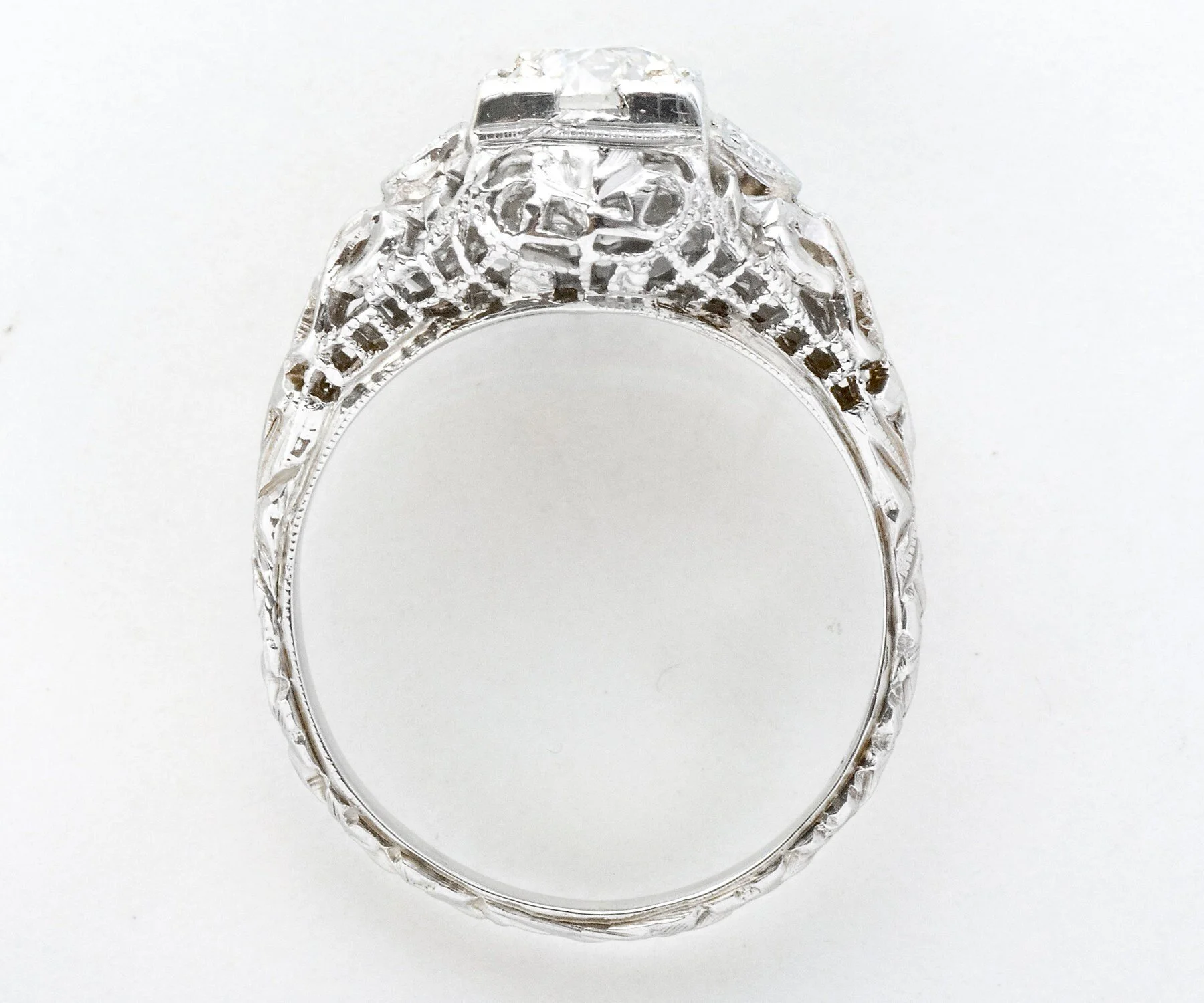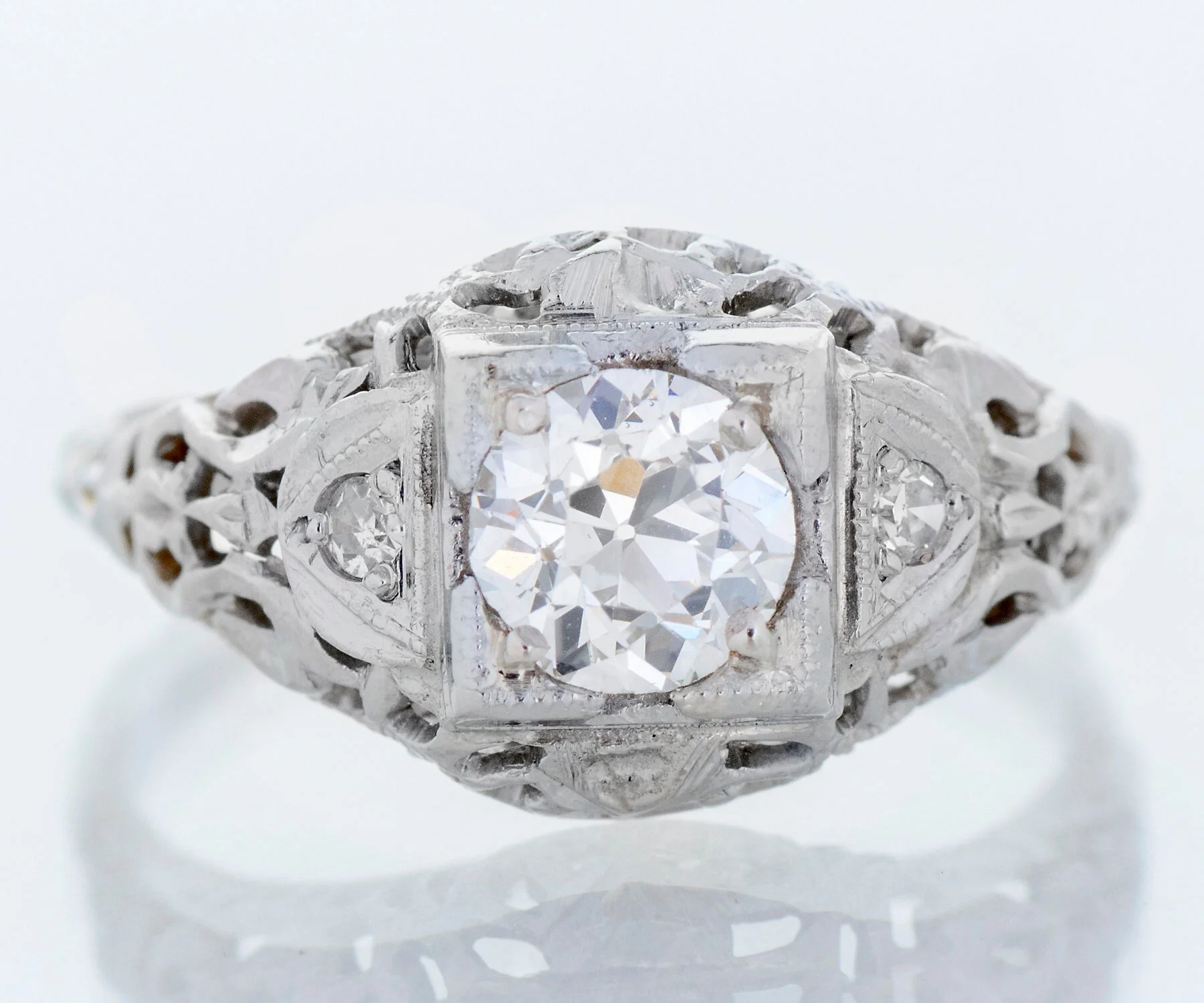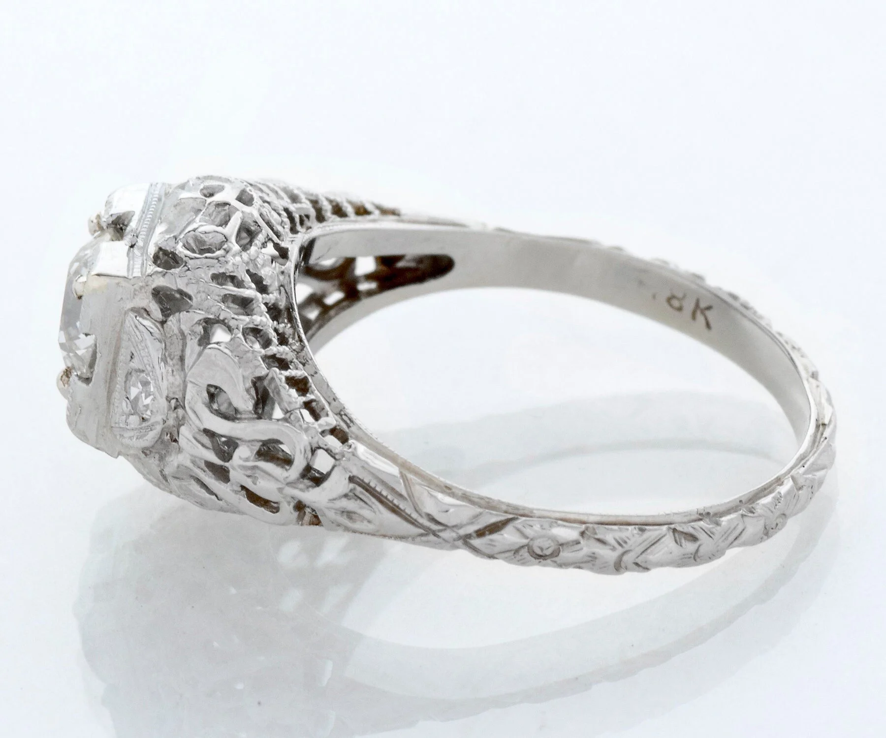 Antique Engagement Ring - Antique Early 1900's 18k White Gold Diamond Filigree Ring 18k White Gold European Cut Center Diamond =.47ct VS2/G 2 Single Cut Side Diamonds = .04ct SI2/H-I Ring Size 4.25 (ring is sizable) Ring measures approximately 9.16mm at center, back of band is 1.8mm wide.