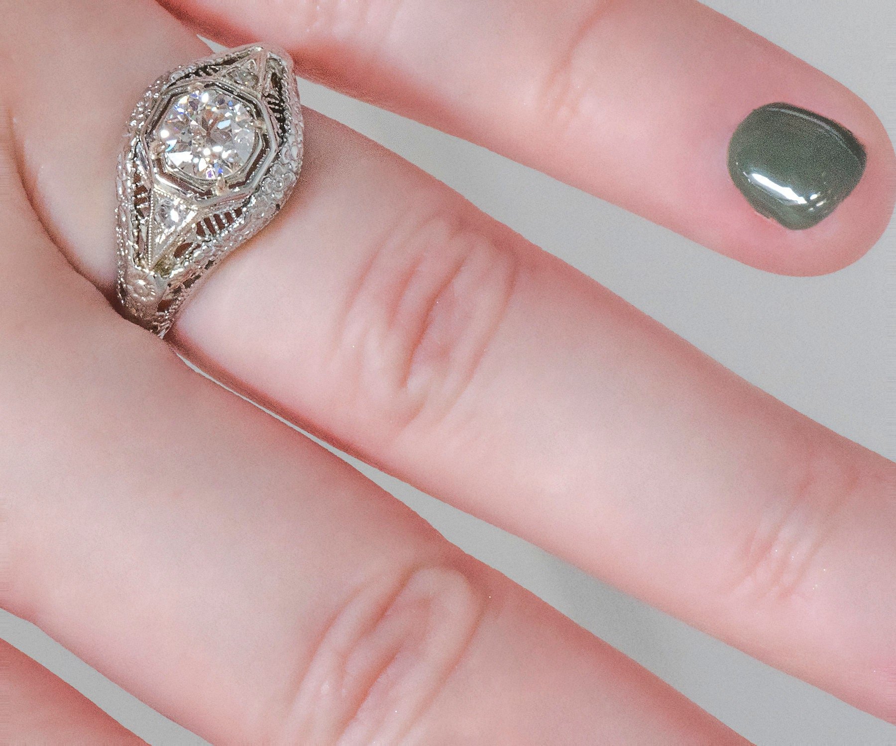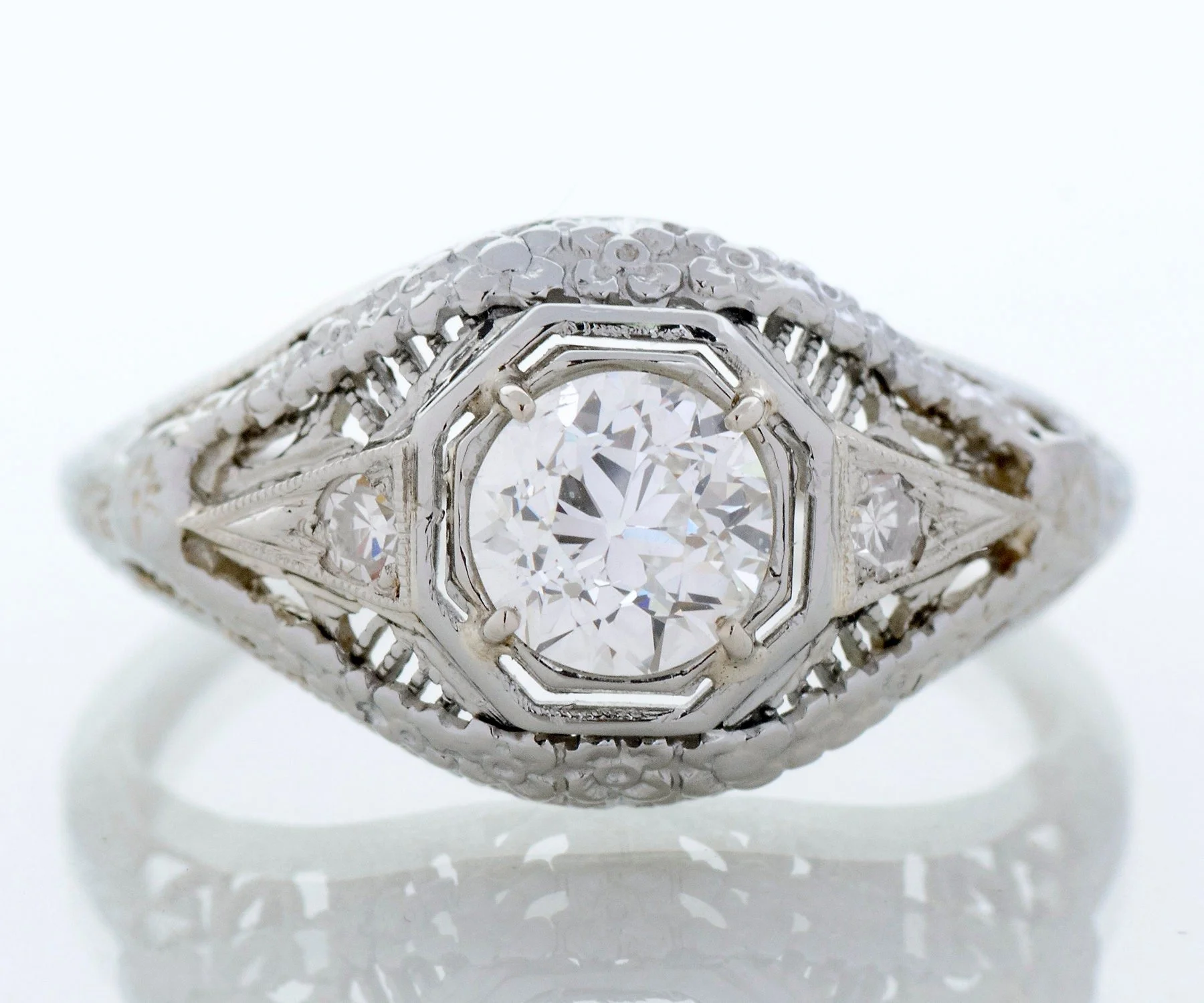 This early 1920s antique diamond engagement ring was crafted in bright 18k white gold. Held snugly at the center is a lovely European cut diamond amid a fantastic setting complete with adorning side diamonds, open wire work and etched blossom detail. A double octagonal frame work surrounds the center diamond. This treasure of an antique ring can easily be worn on its own, no need for a band.