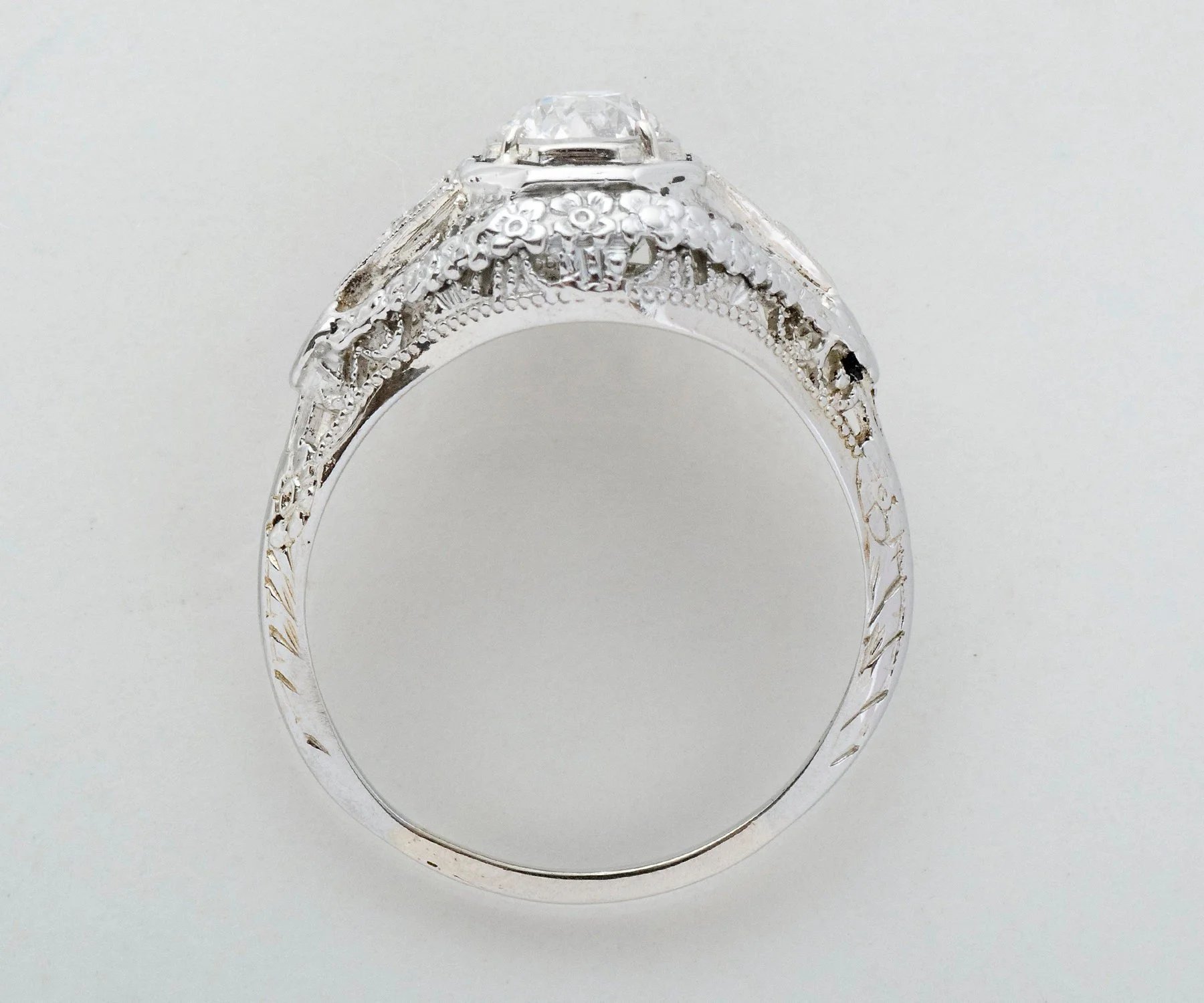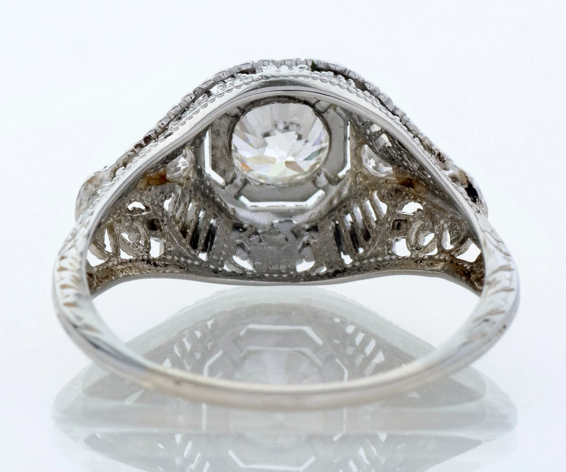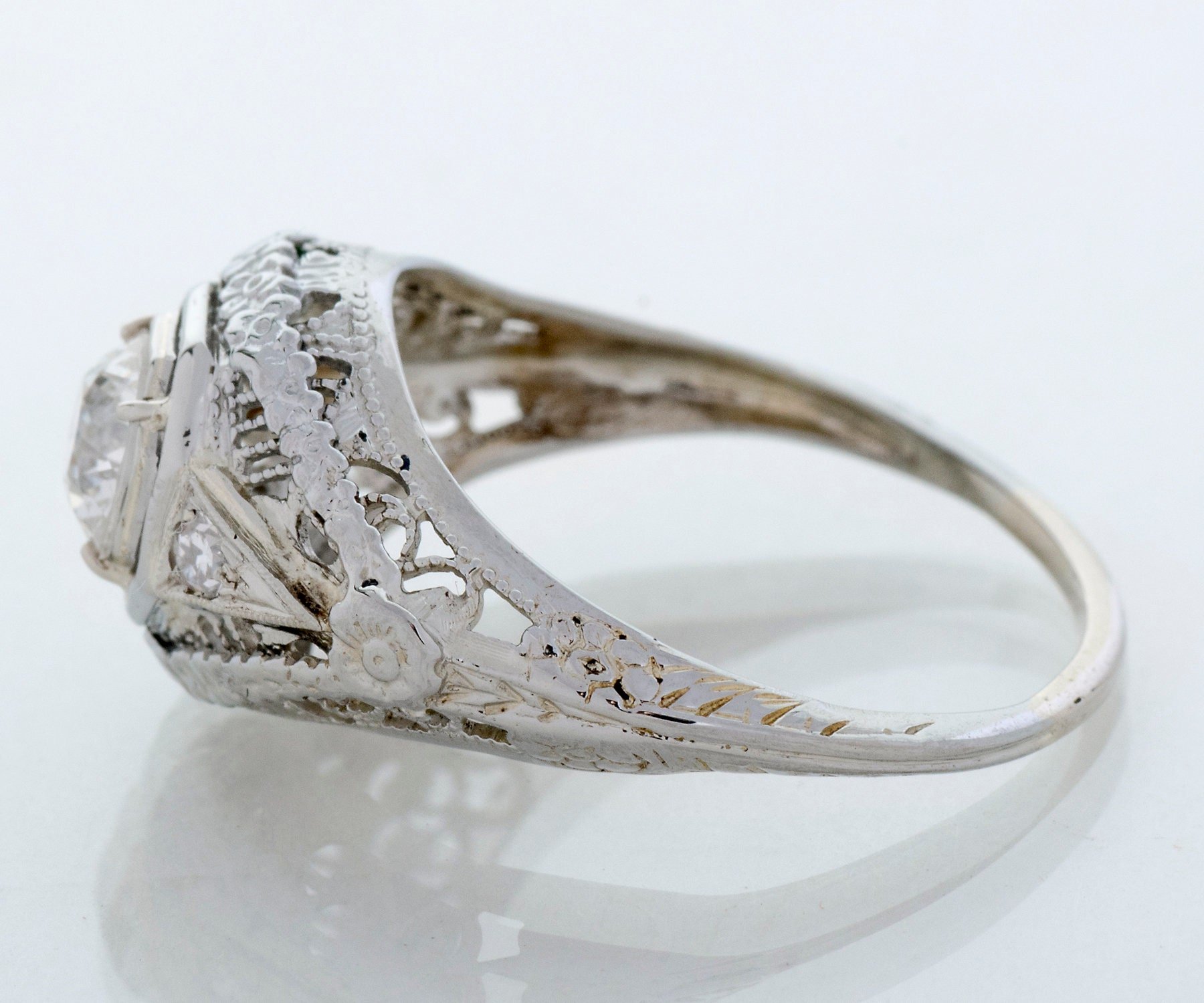 Antique Engagement Ring - Antique Early 1920's 18k White Gold Diamond Engagement Ring 1920's 18k White Gold European Cut Diamond =.66ct SI1/H 2 Single Cut Side Diamonds =.05ct Ring Size 7 (ring is sizable) Ring measures approximately 10.7mm at center, back of band is 1.1mm wide.