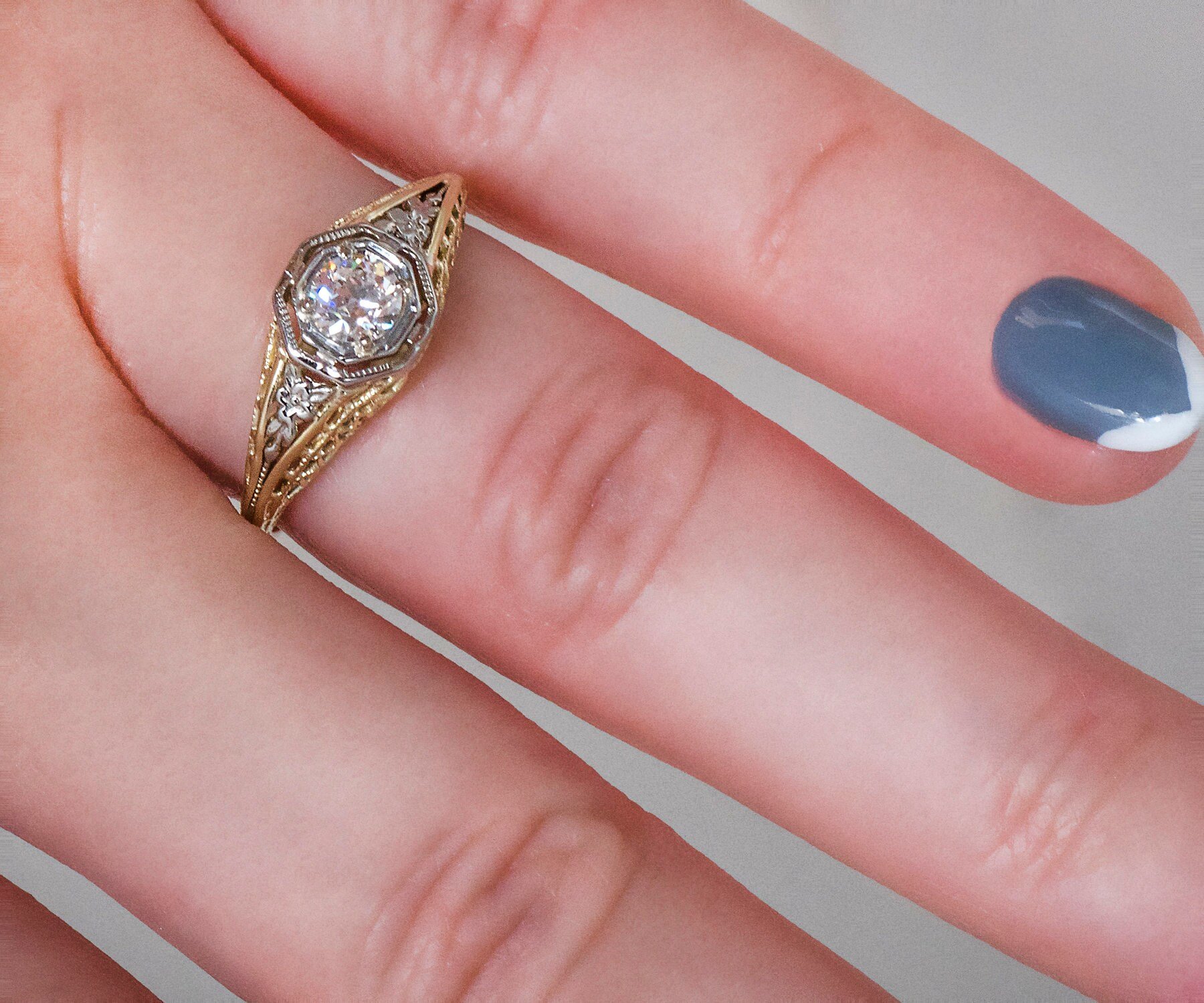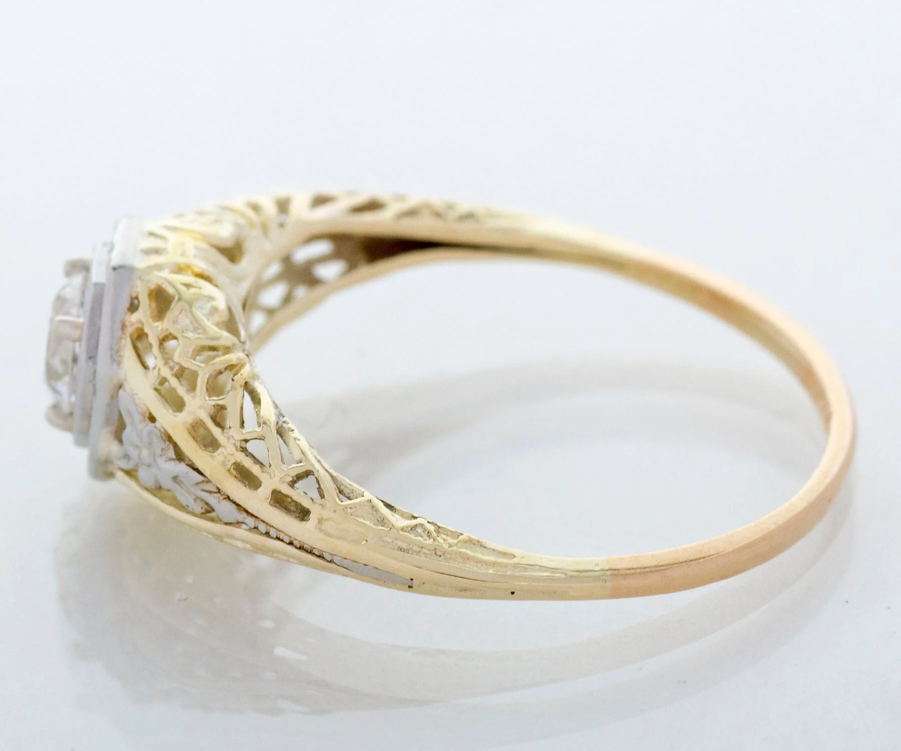 Antique Engagement Ring - Antique Edwardian 14k Two-Tone Filigree Diamond Engagement Ring Edwardian 14k Yellow & White Gold European Cut Diamond =.30ct VS1/D Ring Size 6.5 (ring is sizable) Ring measures approximately 7.4mm at center, back of band is 1.1mm wide.