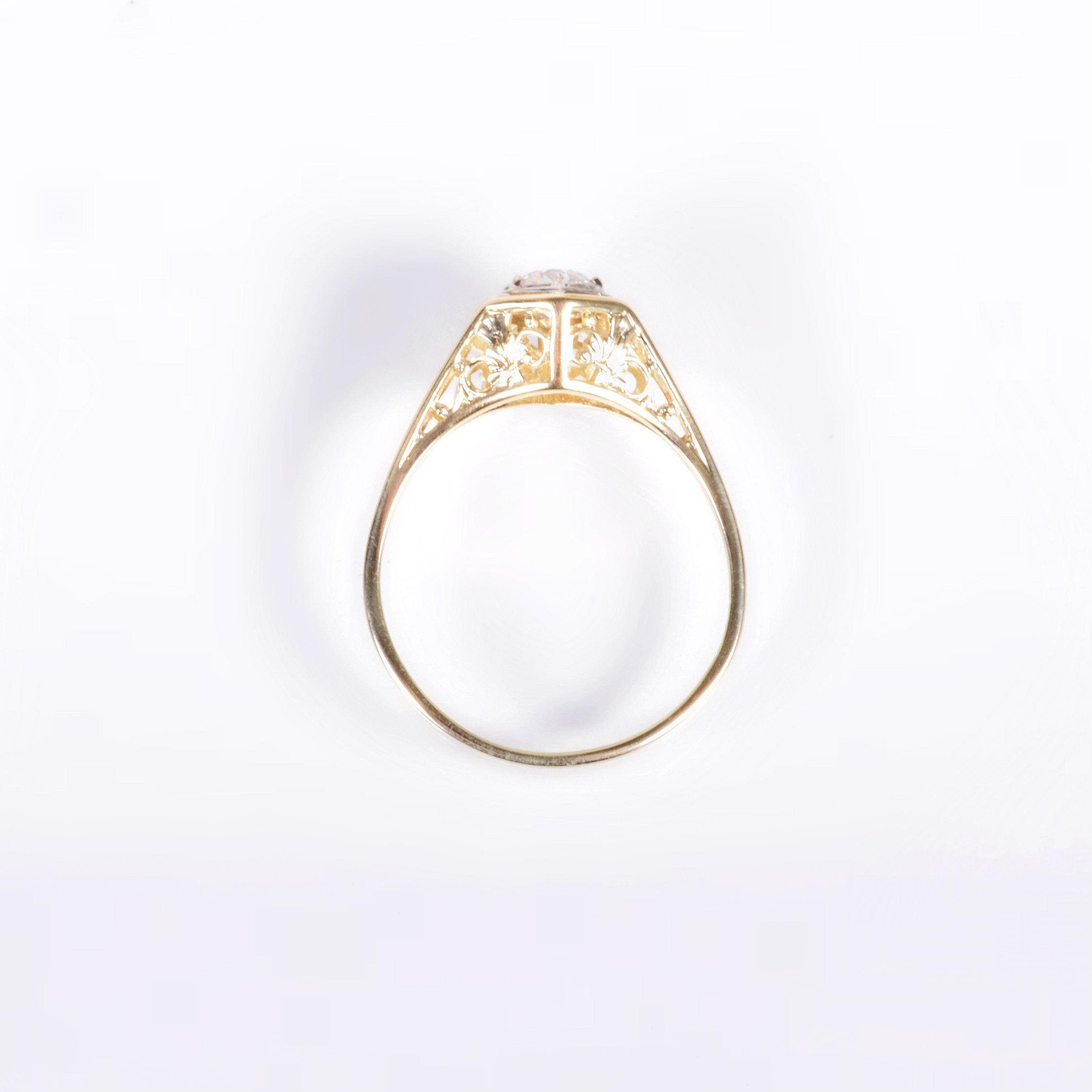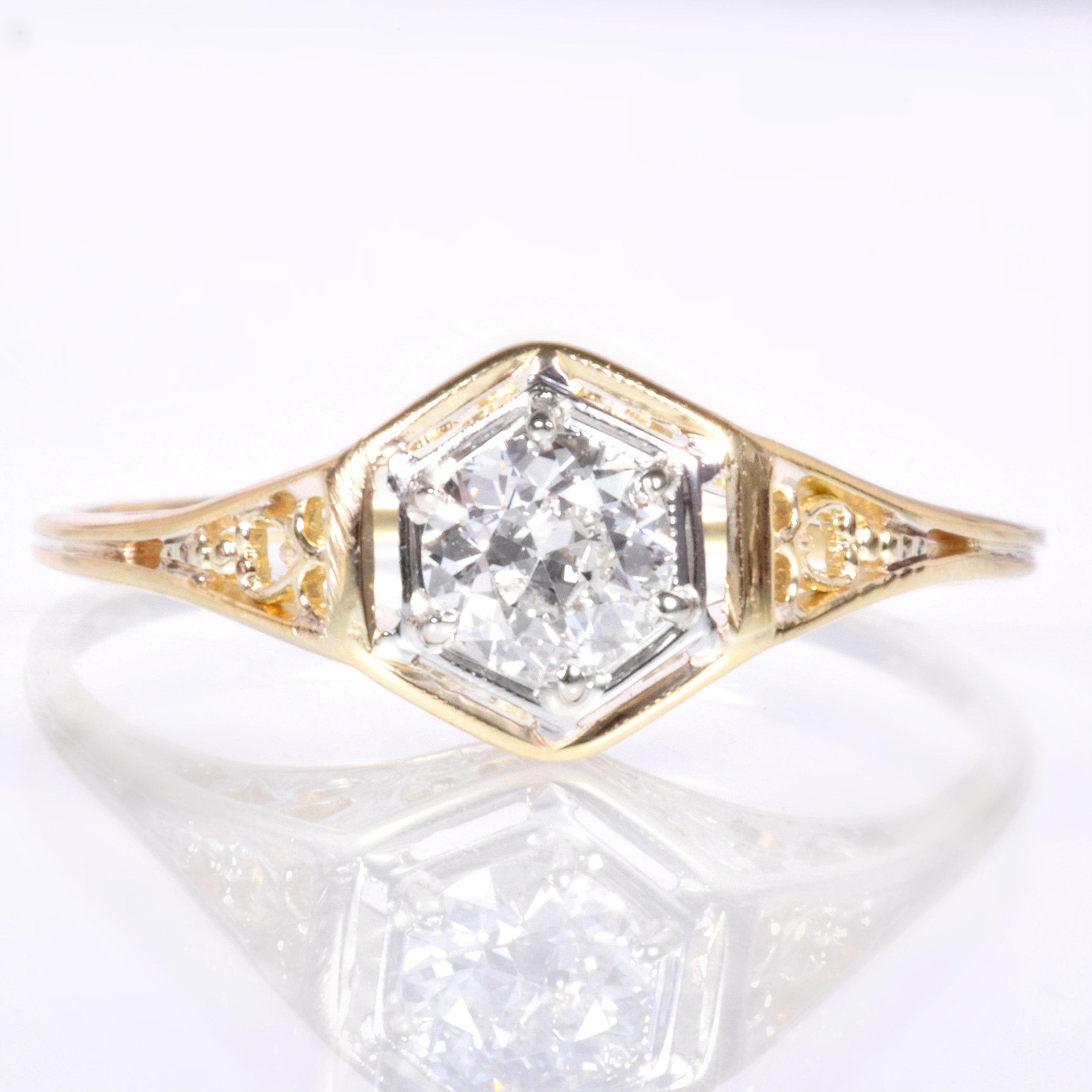 Antique Engagement Ring - Antique Edwardian 14k Two-Tone Gold Diamond Engagement Ring Circa 1910's 14k Yellow and White Gold European Cut Diamond =.35 VS1/E Ring Size 7.75 (sizable) Ring measures approximately 7.7mm wide at center, back of band is 1mm wide.