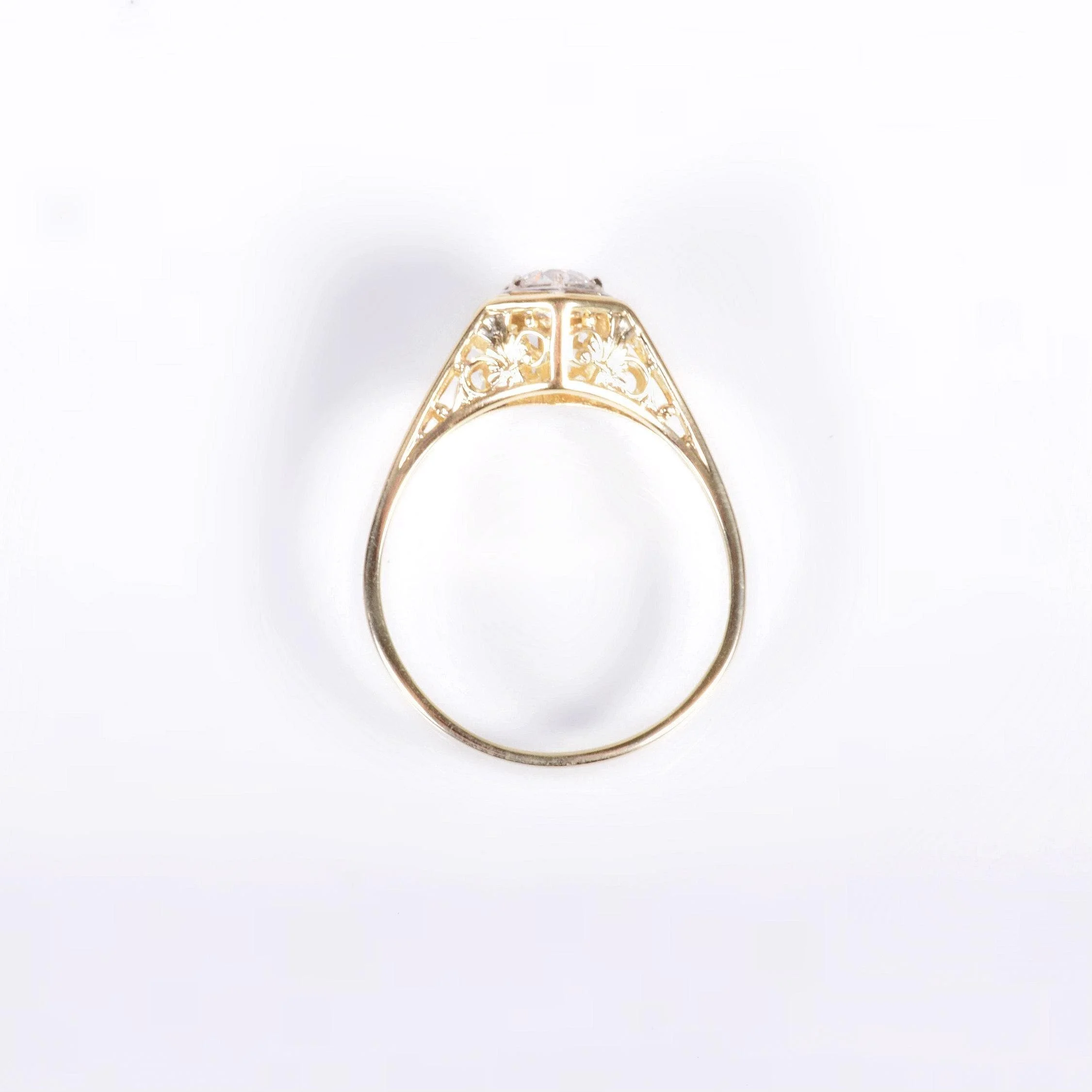 Here we are proud to show you an extraordinary antique Edwardian diamond engagement ring crafted in beaming 14k yellow and white gold. Very striking, and this one is proud to showcase an absolutely dazzling European cut diamond at the center. Beautiful open work is seen on both the shoulders and the gallery. Stunning from every single angle!