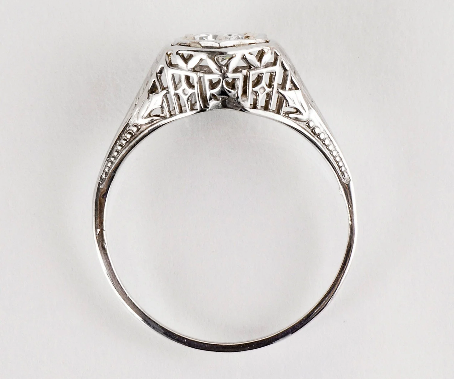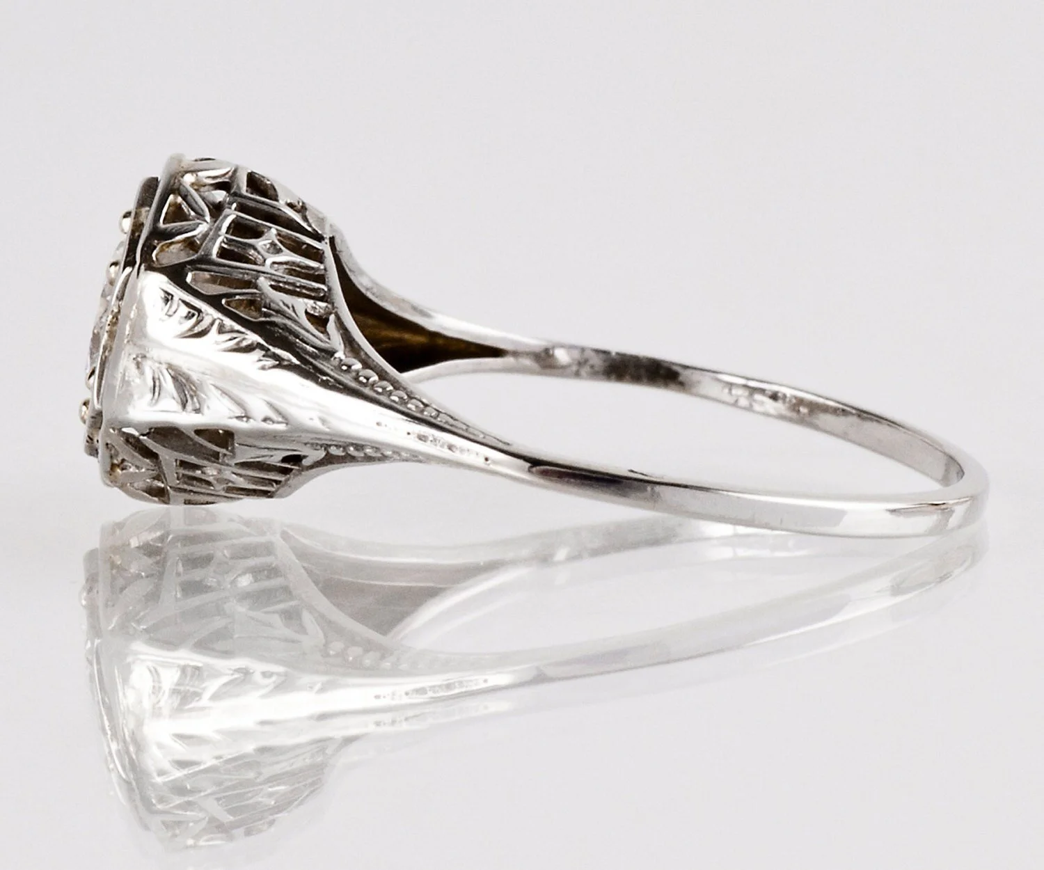 Antique Edwardian 14k White Gold Filigree Diamond Ring 14k White Gold Edwardian European Cut Diamond =.35ct I1/G Ring Size 6.5 (ring is sizable) Ring measures approximately 8.9mm at center, band is 1.1mm.
